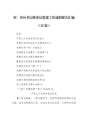 村、社区书记抓基层党建工作述职报告汇编(12篇)目录:严把入口关抓好党员队伍1党建引领风帆劲社区治理阔步行2党建引领新兴向荣3党建跑出为民服务加速度4党建引领乡村蝶变换新颜5强基固本筑堡垒支规建设亮模范6党建发力村民暖心7党建引领转作风真抓实干促发展8党建助力纠纷化解在基层9党建引领织密防疫服务网10用心学党史用情办实事11三度并重构建党+新格局12严把入口关抓好党员队伍【工作成效】:一是加强学习,坚持用党的创新理论武装头脑,指导实践推动工作,并结合本社区实际,认真研究部署工作。二是抓好党员队伍建设,*年共吸收预备党员*名,接收大学毕业生党员*名、退伍军人党员*名,进一步增强了党支部的创造力和凝聚力。三是统筹安排全局,理清工作思路,确定好各个时期的工作重点,切实抓好落实。【主要不足】:一是对党建重点任务、年度重点工作思考谋划不足,存在党建制度落实不到位、党建工作成效不明显等问题。二是基层党建工作创新不够,党建活动形式单一、内容不够丰富。三是挖掘提炼经验不够,尚未形成富有成效、特色鲜明的党建品牌。【下步打算】:一是坚持把党建工作放在首位,进一步夯实社区党建基础,推进社区党建规范化建设。二是注重在基层党建品牌创建上下功夫,深入打造社区党建特色亮点。三是突出学习贯彻党的XX大精神,教育引导广大党员干部坚定理想信念、加强党性修养,永葆初心、勇担使命。党建引领风帆劲社区治理阔步行【工作成效】:一是坚持需求导向,提升社区群众服务精细化水平,实现小事不出网格、大事不出社区,陶苑小区荣获百佳示范小区。二是丰富居民精神文明生活,开展特色主题活动**场次,开展志愿服务活动**场次,*年再度荣获云南省文明示范单位称号。三是把党支部标准化规范化建设作为基础性、经常性工作常抓不懈,成功创建春城先锋示范党支部。【主要不足】:一是对支部缺乏关心引导,忽视了对支部小范围的深入了解,忽略了对支部委员的培训教育。二是个别党员组织观念淡薄,党内政治生活参与度不高。三是缺乏对政治理论的深入学习,未能有效利用学习强国等平台。【下步打算】:一是强化党员队伍建设,进一步健全完善党员学习教育、目标管理、民主评议等各项制度。二是严格落实三会一课、主题党日等制度,丰富学习内容,学以致用,提升党支部的凝聚力、战斗力。党建引领新兴向荣【工作成效】:一是重视宣传工作,*年箐口村撰写新闻稿件篇,分别在昆明信息港、东川新闻、碧谷新语等媒体刊登发表。二是壮大村级集体经济,依托得天独厚的牯牛山旅游资源、生态资源和厚重的文化旅游资源,发展特色旅游产业。三是扎实推进品牌荣誉创建,成功创建云南省森林乡村、践行两山理念乡村示范村,正积极创建绿美乡村。【主要不足】:一是党员管理存在宽松软现象,个别党员政治站位不够高,不能从村发展大局出发,存有个人主义思想。二是存在重业务轻党建的思想,被动应付党建工作,缺乏抓好党建工作的职责和活力。三是推进党建+乡村振兴、乡村旅游等作用上发挥不明显,村民增收致富渠道不多。【下步打算】:一是注重调研,把群众工作放在第一位,着力解决群众所关心的热点、难点问题。二是进一步拓宽发展思路,发展壮大村级集体经济,拓宽农民增收渠道。三是抓好党员队伍建设,吸收年轻的致富能手和其他有为青年加入党员队伍中来。党建跑出为民服务加速度【工作成效】:一是充分发挥党委的战斗堡垒作用,抓实党员干部作风建设,自觉接受党内党外监督。二是筑牢宣传舆论阵地,重视意识形态工作,通过QQ群和微信群等平台,把握正确舆论导向。三是认真落实我为群众办实事长效机制,开展老党员和困难党员关爱活动,全年共慰问老党员、困难党员**名。【主要不足】:一是教育内容形式单一,党员参与支部活动的积极性和主动性不高。二是对党建工作思考不多,满足于完成上级要求完成的规定动作,无党建特色品牌。三是党员管理不够严格,部分党员意识缺乏,组织观念淡薄。【下步打算】:一是加强政治理论学习,丰富学习内容、创新学习载体、用好学习强国等平台,提高组织生活的吸引力。二是强化队伍建设,把服务贯穿到社区党建工作的全过程。三是创新工作思路和方法,提炼党建工作亮点,打造特色党建品牌。党建引领乡村蝶变换新颜【工作成效】:一是盘活闲置资源,规范主导产业,带领群众持续增收,成功摘帽软弱涣散党组织。二是强化班子队伍建设,先后到李子沟村、安宁雁塔村、呈贡万溪冲村参观交流*次,学习先进经验,拓宽发展思路。三是完善阵地建设,新建党群连心广场*个,党员活动室*个,电子书屋*个,商务洽谈室*个。【主要不足】:一是党员管理存在缺位,部分党员整体意识缺乏,集体观念淡薄,支部管理教育程度不够。二是学习活动形式单一,未能充分发挥党员远程教育、农家书屋、宣传栏等作用。三是对党建工作难点问