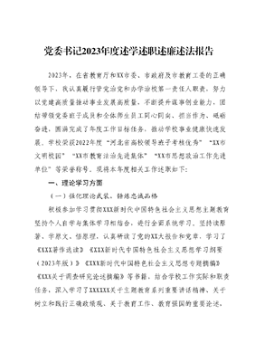 党委书记2023年度述学述职述廉述法报告2023年,在省教育厅和XX市委、市政府及市教育工委的正确领导下,我认真履行管党治党和办学治校第一责任人职责,努力以党建高质量推动事业发展高质量,不断提升谋事创业能力,团结带领党委班子成员和全体师生员工同心同向、担当作为、砥砺奋进,圆满完成了年度工作目标任务,推动学校事业健康快速发展。学校荣获2022年度河北省高校领导班子考核优秀XX市文明校园XX市教育法治先进集体XX市思想政治工作先进单位等荣誉称号。现将本年度相关工作述职如下:一、理论学习方面(一)强化理论武装,锤炼忠诚品格积极参加学习贯彻XXX新时代中国特色社会主义思想主题教育坚持个人自学与集体学习相结合,进行全面系统学习。坚持读原著、学原文、悟原理,认真研读了党的XX大报告和党章,学习了《XXX著作选读》《XXX新时代中国特色社会主义思想学习纲要(2023年版)》《XXX新时代中国特色社会主义思想专题摘编》《XXX关于调查研究论述摘编》等书籍,结合学校工作实际和职责任务,深入学习了XXXXXX关于主题教育系列重要讲话精神、关于树立和践行正确政绩观、关于教育工作、教育强国的重要论述,特别是XXXXXX视察河北重要讲话精神和视察XX重要指示精神,及时跟进学习了XXXXXX最新重要讲话和文章。有侧重地研读了围绕统筹推进五位一体总体布局和协调推进四个全面战略布局的中国式现代化理论。通过学习,进一步掌握了XXX新时代中国特色社会主义思想的基本观点和科学体系,深刻领悟了XXX新时代中国特色社会主义思想的科学内涵、思想财富和实践成果,进一步增强了将学习成果转化为忠诚核心、拥戴核心、维护核心、捍卫核心的思想自觉、政治自觉和行动自觉。(二)带头抓好学习,发挥表率作用认真履行第一责任人职责,坚持以上率下,发挥示范带动作用,带头参加集中学习,制定学习计划,认真做好读书笔记,积极撰写学习体会。带头抓好主题教育理论学习和调查研究,引领推动主题教育扎实开展。全年组织党委理论学习中心组集中学习12期。其中,组织党委理论学习中心组主题教育专题学习会4次,党委理论学习中心组专题研讨4次。带头讲党课2次,庆祝建党102周年表彰大会上讲授学习贯彻党的XX大精神专题党课;主题教育期间讲授教育强国与职业教育专题党课。参加主题教育专题读书班1期,参加全省高校党委书记教育强国专题读书班研讨会1期。(三)突出问题导向,深入调查研究坚持学思用贯通、知信行统一,将学习与双高建设、提质培优行动计划、现代职业教育体系建设改革及升本建设等重点工作紧密结合,以学铸魂、以学增智、以学正风、以学促干,着力把学习的成效转换为推进工作的新思路,破解难题的新举措。全年多次深入系部基层调研,摸清校情教情学情,在研究解决学校发展重点难点问题中检验学习成果。按六个坚持要求,组织全体党委委员围绕服务师生、促进发展等方面开展了9个专题调研和2个典型案例研究,全方位听取意见建议,解决矛盾问题,总结典型经验,将调研成果上升为制度成果、转化为工作实效,真正把学习成果转化为推动学校快速发展的强大动力。二、履职尽责方面(一)加强党的建设1.充分发挥党委领导核心作用,把方向、管大局、保落实一是严格落实党委会、校长办公会制度。始终坚持党委领导下的校长负责制,完善党政分工协作的工作机制,充分发挥领导班子集体的作用,全年召开党委会33次,校长办公会22次。二是严格落实决策部署。贯彻以党的建设高质量推动事业发展高质量理念,定期召开党建工作例会、基层党组织书记抓党建工作述职评议,开展基层党建督查,推进党建工作落实。三是深入学习贯彻XX大精神,扎实推进主题教育。基层党组织开展讲师团宣讲、七一专题党课、培训辅导、心得分享会等多形式、分层次、全覆盖的全员教育培训。聚焦主题主线,全面对标对表,把推动学校高质量发展作为主题教育的着力点和落脚点,一体化推进理论学习、调查研究、检视整改等工作,把主题教育成效转化为推动学校高质量发展的生动实践。2.夯实党的建设基础,提升党建工作质量一是持续深化党建领航工程,围绕基层党组织攀登、党员先锋、党务工作者红领、党建工作筑力四大计划,深入实施党建+双带头人培育工程和一总支一品牌一支部一特色活动。《创建党建特色品牌,凝聚医学育人合力》荣获全国职业院校党委书记抓基层党建优秀案例,《党建红+护理白筑牢人才培养主阵地》荣获河北省高校党建工作典型案例二等奖二是提升党建工作水平,抓好抓实系部党政联席会,获评XX市教育工委先进基层党组织2个、优秀共产党员7名、优秀党务工作者3名。全年发展党员12名,预备党员85名,确定入党积极分子404名。加强党建工作研究,河北省高校党建研究会课题结题3项,立项2项。3.加强干部队伍建设,强化干部教育培训和管