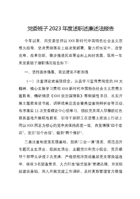 党委班子2023年度述职述廉述法报告今年以来,局党委坚持以XXX新时代中国特色社会主义思想为指导,坚决贯彻落实上级决策部署,聚力担当实干、攻坚克难、改革创新,稳步推进民政事业向上向好发展。现将一年来党委班子履职情况报告如下:一、坚持固本强基,政治建设不断加强(一)注重理论武装强信念。认真学习宣传贯彻党的XX大精神,精心实施学习贯彻XXX新时代中国特色社会主义思想主题教育,精研细读《XXX谈治国理政》等纲领性书目,扎实开展主题教育读书班、调研成果交流会暨典型案例剖析会等活动,有序落实11次党委理论中心组学习,组织党员深入鄂豫皖红色教育基地开展现地教育,引导干部职工在思想上政治上行动上同以XXX同志为核心的党中央保持高度一致,自觉增强四个意识、坚定四个自信、做到两个维护。二是注重制度落实强基础。狠抓三会一课落实,规范召开专题民主生活会、组织生活会、主题党日和党小组会,党员领导干部带头讲授2次党课;严格按程序完成基层党支部换届选举,吸收3名预备党员,大力打造链式服务党建品牌,夯实组织建设基础。深入开展党建工作调研。及时更新管理官方微信公众号、网站,组织微党课大家讲、支部书记讲党课、创建五星党支部等活动,支部建设水平全面提升。三是注重作用发挥强堡垒。扎实开展下基层察民情解民忧暖民心实践活动,领导班子坚持深入基层、走进群众开展调查研究,问需于民、问计于民,掌握第一手资料。与3户特困家庭结成对子,持续开展一对一精准帮扶,做到重要节日慰问困难群众,送温暖、解难题,树牢为民务实清廉良好形象。二、坚持履职尽责,中心工作全面提质(一)坚持抓重点,卫生健康成绩显著。医疗服务监督管理持续提升,不断完善规范诊疗行为,对全区12家医疗机构医护人员开展业务培训,强化基层医疗执业水平;亮剑行动打击无证非法行医,查处取缔无证诊所6家。公共卫生服务保障规范有力,五类基本公共卫生服务项目有效落实;推进家庭医生签约服务电子化、智能化,家庭医生签约服务团队8个,签约1.2万人。健康实事稳步推进,对辖区35-60岁已婚妇女开展互联网+宫颈癌免费筛查活动,累计筛查16万余例;免费开展新生儿疾病和孕妇产前筛查;建成22个健康自测小屋,为社区居民提供基础项目免费健康检测,全年服务辖区居民36万人次。(二)坚持展亮点,民政养老精彩纷呈。实施互联网+居家养老服务模式。新建4家社区养老服务中心,建立集大数据分析管理、养老机构智能信息化监控、购买养老服务绩效评估、候鸟式养老旅居网、家政服务网、养老服务信息管理等六大功能于一体的智慧化养老服务平台。为辖区60岁以上老年人购买三助一巡护居家和社区养老服务,全年提供助餐服务6万余人次。(三)坚持聚焦点,政务服务便捷高效。大力推动放管服改革,切实优化企业营商环境。2023年完成审批服务事项进驻综合性实体大厅达到85%以上,实现一窗分类受理达到,90%以上;引导企业使用自助设备,让办事企业只进一扇门,最多跑一次。深化证照分离改革,进一步压缩企业开办时间,注册窗口工作提前办结率达到了90%以上。全年共受理联动诉求45件,网民诉求98件,环保诉求23件,办结率均为100%,在全市位居前列。公共资源交易规范有序。按照政府领导、统一进场、集中交易、行业监管、行政监察的总体要求,进一步充实公共资源交易管理办法、交易流程和工作制度。(四)坚持攻难点,涉军群体态势平稳。各类优抚政策全面落地,保障辖区军属权益。加大涉军群体矛盾排查化解力度.全区涉军群体基本稳定,全年未发生一起越级进京赴省涉军信访案件和群体性事件。为烈属、军属和退役军人等家庭悬挂光荣牌4万余个。(五)坚持夯基点,社区治理创新引领。加快社区协商制度,全区12个社区目前已经合部建立协商议事委员会,全年共开展社区协商68余场,形成协商成果105个。持续开展三社联动。与专业社会组织签约、申报项目7个,开展活动项目15个;入驻三社联动信息平台的社会组织特色商家共22家,实现一窗式受理,本年度全区公共服务受理量为875件。引进支持性社会组织开展专业社会组织孵化和社区公益微创投工作。(六)坚持聚焦点,悉心为民保障到位。全年组织开展了形式多样的妇女儿童活动,及时宣传妇女发展、巾帼建功、妇儿维权、家庭建设等信息。鼓励引导各社区成立巾帼志愿服务队,针对老年人和妇女儿童开展特色服务活动。牵头完成了9户残疾人家庭无障碍改造工作,为辖区32名残疾人技能培训。为25名残疾学生发放教育补贴5万元。为辖区8名今年考入全日制大学的残疾人(或残疾人子女)大学生发放助学金8万元。全面开展贫困重度残疾人两项补贴工作任务,实现了应保尽保。三、坚持正风肃纪,党风廉政持续向好(一)严格落实责任。严格落实两个责任和一岗双责政治责任,党委会10次