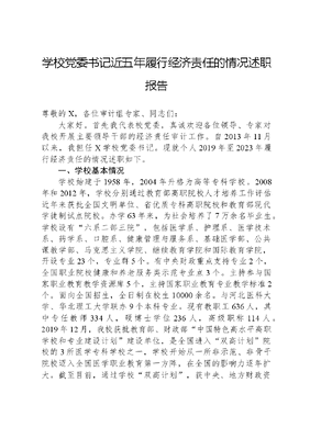 学校党委书记近五年履行经济责任的情况述职报告尊敬的X,各位审计组专家、同志们:大家好。首先我代表校党委,真诚欢迎各位领导、专家对我校开展主要领导干部的经济责任审计工作。自2013年11月以来,我担任X学校党委书记。现就个人2019年至2023年履行经济责任的情况述职如下。一、学校基本情况学校始建于1958年,2004年升格为高等专科学校。2008年和2012年,学校分别通过教育部高职院校人才培养工作评估近年来获批全国文明单位、省优质专科高职院校和教育部现代学徒制试点院校。办学63年来,为社会培养了7万余名毕业生。学校设有六系二部三院,包括医学系、护理系、医学技术系、药学系、口腔系、健康管理与服务系、基础医学部、公共课教学部、马克思主义学院、继续教育学院和国际教育学院,开设专业23个,专业群5个。有中央财政重点支持专业2个,全国职业院校健康和养老服务类示范专业点3个。主持参与国家职业教育教学资源库5个,主持国家职业教育专业教学标准2个。面向全国招生,全日制在校生10000余名。与河北医科大学、华北理工大学联办9个本科专业。现有教职工636人,其中专任教师334人,硕博士学位236人,高级职称114人。2019年12月,我校获批教育部、财政部中国特色高水平高职学校和专业建设计划建设单位,是全国进入双高计划院校的3所医学专科学校之一,学校开始从一所非示范、非骨干院校迈入全国医学职业教育第一方阵,在全国的影响力逐年扩大。截至目前,通过学校双高计划,获中央、地方财政资金支持X万元,极大地促进了学校的办学质量提升与快速发展。二、贯彻落实党的理论路线方针政策及党和国家重大经济方针政策及决策部署方面(一)深入学习贯彻XXX关于教育的重要论述和党的XX大精神,坚持社会主义办学方向不动摇加强政治建设,拥护两个确立,把增强四个意识坚定四个自信、做到两个维护落实到教育改革发展各方面,融入到教学科研各环节。以党史学习教育为引领,切实发挥领学促学作用。坚持党委理论中心组学习制度,常态化开展XXX新时代中国特色社会主义思想校园巡讲和学习。学校马克思主义学院组建了党史宣讲团,深入师生专题宣讲,推动党史学习教育全覆盖,助推党建、育人双提升。(二)聚焦国家重大战略需求,服务经济社会发展一是服务健康中国和一老一小国家战略。在卫生领域,构建尚医德、重基础、强技能、复合型卫生健康技术技能人才培养体系,打造具有医专特色的大爱情怀育人特色。办学以来,先后培养了7万余名高素质卫生人才,学生入学录取分数、执业资格通过率均在全省同类院校排名第一。紧紧围绕基层卫生健康人才培养,组建1+1+7医教联合育培体系,通过与基层教学医院深度合作的医教协同模式,3年累计培养基层卫生人才5千余名。不断拓展社会服务功能,依托全国急救教育试点学校平台,创建沧医急救培训品牌,线下累计培训服务近4万人次。在康养康育领域,积极应对人口老龄化,服务一老一小国家战略。坚持守正创新,确定卫生+康养双领域办学定位,以医学为基础、以专业群为支撑,以课程为载体,以产教研融合为模式,谋划和实施产、学、研、用、创一体化康养人才培养体系。2021年6月,成立中欧康养产业学院;同年11月,经过学校积极努力,获批中国职业技术教育学会康养康育专业委员会秘书处单位;2022年4月28日,我校承办了中国职业技术教育学会康养康育专业委员会成立大会暨首届全国康养康育高端论坛,学校知名度和行业影响力有效提升。二是服务国家脱贫攻坚和乡村振兴战略。面向家庭经济困难的新生开辟绿色通道,加大对建档立卡家庭学生的经济资助。助力西部地区职业教育发展,选派4批共11名教师赴新疆医大高职学院巴州校区对口支教,选拔2批共44名学生赴新疆轮台县医院援疆实习。近三年共录取993名乡村基层卫生专业技术人员,针对他们不能长期离岗、工作单位遍布全省的实际情况,采取线上教学+网络直播+集中面授的教学模式保证学习效果。选拔学校精干力量组成驻村工作组,解决海兴县小路村村民实际困难。三是服务国家一带一路。在泰国成立扁鹊学院,开发并输出养老护理教学标准1个,专业课程标准10个,课程资源2门。积极参与汉语及中国文化传播工作,重视培养汉语志愿教师。学校受到泰国教育部授予中泰国际合作突出贡献奖,被河北省政府外事办公室网站宣传推广。三、任职期间重要发展规划和政策措施的制定、执行和效果情况(一)科学制定学校十四五发展规划学校党委对照国家十四五经济社会发展主要目标和2035年远景目标建议及省委、市委全会精神,依据《国家职业教育改革实施方案》《国务院关于实施健康中国行动的意见》等文件精神,加强科学谋划,坚持改革、开放、创新思维,围绕地方和区域卫生健康战略需求,科学制定了学校十四五发展总规划及各