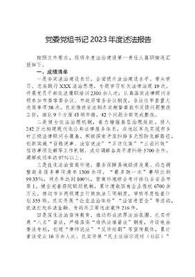 党委党组书记2023年度述法报告按照文件要求,现将年度法治建设第一责任人履职情况汇报如下。一、成绩清单一是夯实法治建设责任,全面提升法治建设水平。带头学习、忠实践行XXX法治思想,专题学习有关法律法规19次,开展党员干部依法履职培训2300余人次;认真落实法律顾问全程参加市委常委会议、市政府常务会议制度,合法性审查重大决策事项58次。扎实推进省法制办实地督察我市反馈问题整改工作,细化9个方面43项举措,42个问题全部完成整改。二是健全依法治理机制,着力增强基层治理效能。投入242万元构建现代化公共法律服务体系,在地区率先实现市乡村三级法律顾问全覆盖。积极探索矛盾纠纷多元预防化解路径,创新实施百姓说事、法官说法五访化案三函问效信访事项化解等工作机制,成功调解各类矛盾纠纷5700余件,调解成功率达97%以上。三是优化法治营商环境,服务保障县域经济发展。动态调整政务服务事项清单1300余项,最多跑一次事项达到99.33%,网办率达到100%,营商环境综合考评排位全省县市第1。健全完善府院联动机制,累计清收国有企业债权6700余万元。推动市乡两级建立行政执法三项制度,审核年度检查计划355项。扎实开展企业法治体检法官进百企等活动,依法打处非法金融、食药环卫等违法案件216件。四是深化法治宣传教育,推动形成浓厚法治氛围。扎实开展八五普法,严格落实谁执法谁普法制度,开设电台普法专栏,创建律师说法反诈短剧等宣传载体,累计普法受众10万余人次。扎实开展民主法治示范村(社区)创建工作和法律明白人培养工程,成功创建省级民主法治示范村20个。二、问题清单一是基层法治议事协调机构作用发挥不够充分。法治议事协调机构督促指导不够到位、针对性不强,有的部门单位推进法治建设按部就班、创新不足、成效欠佳。二是法治化营商环境需进一步优化。有的干部对执法和服务的关系认识不到位,在事关营商环境的投诉、诉讼、援助等案件办理上,有时还不够贴心高效,服务意识还需增强。三是运用法治思维解决问题的能力不强。有的部门单位及干部运用说服教育、劝导示范、行政指导、依法处置等措施不够有力,扭转部分群众信访不信法思想成效不明显。四是基层法治队伍建设仍需加强。基层执法队伍力量还不足,法治人才培养、储备、规划等工作对标新时代法治建设要求还有差距。三、任务清单一是全面提高依法治理能力。加快推进数字化建设,推动传统执法模式向现代执法模式转型升级。深入落实行政执法三项制度,着力提升包容审慎柔性执法水平。加快建设覆盖城乡、便捷高效、均等普惠的公共法律服务体系,更好满足群众法律服务需求。二是打造一流法治营商环境。深化放管服改革,对执法不作为、乱作为和趋利执法、选择性执法等问题零容忍、严整治,着力打造最优服务环境。依托行政执法宜企行动专项监督,扎实推进企业行政执法领域合规改革试点工作,不断增进企业安全感满意度。三是持续提升全民法治素养。深入落实谁执法谁普法责任制,采取互联网+普法和智慧普法等模式,持续深化分业、分类、分众法治宣传教育,争创全国八五普法中期先进县(市)。加快推进法治乡村建设,广泛培育农村学法用法示范户,打造农村法治教育基地。四是加快建设高素质法治队伍。全面深入贯彻《XXX法治思想学习纲要》,建立健全党委(党组)学习XXX法治思想常态化机制。着力加强法治人才培养,推进法治队伍正规化、专业化、职业化建设,确保法治队伍结构布局与承担的职责任务相匹配、相适应,促进法治队伍安身安心安业。