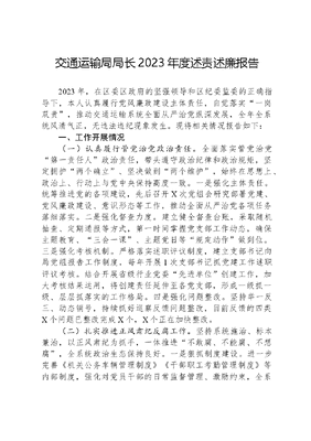 交通运输局局长2023年度述责述廉报告2023年,在区委区政府的坚强领导和区纪委监委的正确指导下,本人认真履行党风廉政建设主体责任,自觉落实一岗双责,推动交通运输系统全面从严治党纵深发展,全年全系统风清气正,无违法违纪现象发生。现将相关情况报告如下:一、工作开展情况(一)认真履行管党治党政治责任。全面落实管党治党第一责任人政治责任,带头遵守政治纪律和政治规矩,坚定拥护两个确立、坚决做到两个维护,始终在思想上、政治上、行动上与党中央保持高度一致。一是强化主体责任。统筹推进党的各项建设,先后召开X次党组会研究部署党建、党风廉政建设、意识形态等工作,推动全面从严治党各项任务落细落实。二是强化督查力度。建立健全督查台账,采取随机抽查、定期通报等方式,第一时间掌握党支部工作动态,确保主题教育、三会一课、主题党日等规定动作做到位。三是强化考核机制。严格落实述职评议制度,建立支部书记向局党组报告工作制度,每年开展1次支部书记抓党建工作述职评议考核。结合开展省级行业党委先进单位创建工作,加大考核结果运用,将创建责任延伸至各党支部,形成一级抓一级、层层抓落实的工作格局。四是强化问题整改。坚持举一反三、动态销号,持续抓好巡察反馈问题整改,目前反馈的四类X个问题已整改完成X个,X个正在加快整改。(二)扎实推进正风肃纪反腐工作。坚持系统施治、标本兼治,以正风肃纪为抓手,一体推进不敢腐、不能腐、不想腐,全系统政治生态保持良好。一是狠抓制度建设。进一步完善《机关公务车辆管理制度》《干部职工考勤管理制度》等内部制度,强化对党员干部的日常监督管理、激励约束,全系统干事创业氛围持续浓厚。二是力抓思想防线。深入廉政教育基地、X监狱等组织开展各类警示教育X次,利用中秋、国庆等重要时间节点与其他班子成员、局属单位及机关股室负责人开展廉政谈话X余人次,全系统没有违反中央八项规定现象发生。三是严抓形式主义。持续精文减会,全年印发正式文件同比减少X%;严格会议审批,积极倡导会议合并、套开;规范督查检查,积极推进互联网+督查等手段提高工作效率;改进调查研究,结合主题教育,细化交通运输四类X个主题,形成高质量调研报告X篇,其中《关于加快交通运输基础设施建设的调研报告》被市委刊物采用。(三)不断强化对公权力运行制约监督。坚持抓早抓小、防微杜渐,通过对党员干部全覆盖、有效性监督,确保立党为公、执政为民。一是自觉接受监督。始终按规则、按程序办事,不断加强自我监督,主动接受组织监督、群众监督及媒体监督,严格落实民主集中制原则,三重一大全都通过局党组会研究决定。二是强化监督执纪。结合整治不担当、不作为突出问题,在全系统开展作风大整治,累计收到问题检视清单X余份,检视问题X大类X余个,督查通报正风肃纪、会风会纪等X次,开展诫勉谈话X人、各类警示约谈等X人次,有力保障了交通运输工作高质量推进。(四)全力支持纪检监察工作。自觉接受、全力支持、主动配合派驻纪检组依规依法履行职责,凡涉及全面从严治党重大问题、重要事项,及时向区委、区纪委请示报告;凡研究三重一大事项,主动邀请派驻局纪检监察组监督。今年来,我局累计抽调X人到区纪委监委、区巡查办参与X等工作。(五)严格遵守廉洁纪律。一年来,本人严格遵守党章党纪党规,做到干净干事,谋事创业在先,自觉抵制不正之风,以身作则,把纪法挺在前面;严格执行《中国共产党党员领导干部廉洁从政若干准则》和廉洁自律各项规定,带头落实中央八项规定精神,坚决反对四风问题,不私自从事任何有关营利活动,不利用职务之便谋取不正当利益,严格如实报告个人有关事项。积极汲取正反典型经验教训,强化警示教育,做到自警自省。二、存在的问题与不足对照组织要求和群众期盼,深刻反思,我还存在以下问题一是履行党风廉政主体责任不实,对党风廉政建设工作重部署,在具体层面监督落实不够。二是干部职工日常管理不够严格,平时重管事、轻管人,特别是在八小时之外监管手段不多。三是自身工作作风不够扎实,对党风廉政建设谋划不足,很多工作局限老套思维,没有结合本单位工作实际去创新工作方式。对群众反映的问题处理不够及时和彻底,对干部学习、工作、生活的关心不够。三、下步工作打算下一步,我将牢牢把握全面从严治党这根主线,时刻紧绷纪律之弦,持之以恒正风肃纪,深入推进党风廉政建设。(一)强化理论武装。以深化主题教育为契机,持续深入学习XXX新时代中国特色社会主义思想和XXXXXX在中纪委全会上的讲话精神,系统学习党规党纪和党风廉政各项规定,切实做到用新思想新理论武装头脑、指导工作、推动实践。(二)强化责任落实。严格履行管党治党第一责任人责任,坚决做到重要工作亲自部署、重大问题亲自过问、重点环节亲自协调、重要案件亲自督办。以身作则,压实领导班子成员一岗双责责任,持续组织开展作风