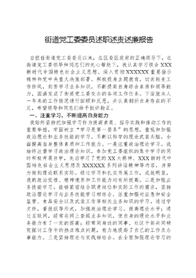 街道党工委委员述职述责述廉报告自担任街道党工委委员以来,在区委区政府的正确领导下,在街道党工委领导和同志们的关心帮助下,我认真学习领会XXX新时代中国特色社会主义思想、深入贯彻XXXXXX重要指示精神和党中央重大决策部署,积极投身主题教育,切实转变工作作风,刻苦学习业务知识,不断提高自身综合素质和领导能力,圆满完成了街道党工委交办的各项工作任务。下面就本人一年来的工作情况进行回顾和反思,并认真剖析自身存在的不足,希望领导和同志们给予批评指正。一、注重学习,不断提高自身能力我始终坚持把加强学习作为提高素质、指导实践和推动工作的重要举措,牢固树立学习是第一要务的思想,重视和加强政治理论和业务技能的学习,不断以科学的理论武装头脑,全面提高自身整体素质和工作能力。一是注重政治理论学习。我始终注重学习政治理论知识,参加党工委组织的集中学习的同时积极开展自学,先后学习了党的XX大精神、XXX新时代中国特色社会主义思想及XXXXXX系列讲话精神等内容,并努力做到理论联系实际。经过学习和扎实开展工作,成效明显,我的政治觉悟、精神境界和工作能力均有所提高。二是加强业务技能学习。能够紧密结合职责岗位和实际工作的需求,坚持政治理论学习与业务技能学习相结合,注重加强对应急和安全监管、食品安全以及武装工作等相关业务知识的学习。通过学文件,看报纸等形式,加强政治理论学习,提高理论水平;通过互联网,经常在网上查阅业务知识,使自身的理论水平和业务能力有了一定的提高;经常同身边的同事、社区干部共同研究探讨工作中的热点难点问题,有力地提高了自己的工作及办事能力。三是坚持理论与实践相结合。在全面加强理论学习的同时,坚持学以致用、学用结合,能够及时地把学习成果转化为工作实践,注重向实践学习,在实践中检验自己的学习水平和业务技能。二、廉洁自律,树立个人良好形象在提高政治素质的同时,我重视自身思想道德修养的提升,谨遵踏踏实实做事、清清白白做人的原则,坚持从各方面严格要求和约束自己,切实转变工作作风、思想作风和生活作风,树立个人良好形象在街道党工委、同事以及辖区党员群众的监督下,自觉做到遵守纪律,廉洁从政。严格遵守党员廉政准则以及办事处制定的各项廉政制度,在开展我所分管的武装工作过程中,我始终能够做到廉洁自律,自觉做到廉洁征兵,维护了政府公务人员的形象。同时,作为领导干部,我以身作则,严格要求自己和工作人员在工作中禁止对工作对象吃、拿、卡、要。三、扎实工作,全面履行工作职责按照街道党工委总体工作部署,我能够摆正自己的位置,尊重领导,听从领导安排,不折不扣地完成分管工作及领导交办的各项工作任务;树立上下一盘棋的大局意识,注重协调上下级,同级之间的关系,既讲原则,又讲风格,不断创新思路,狠抓工作落实,与应急和安全监管办公全体工作人员,扎实工作,分管工作有了新的进展。一是认真筹划抓落实,促进应急和安全监管工作上台阶。持续开展日常隐患排查。根据上级工作要求,结合辖区特点,街道开展防风险除隐患保平安专项活动,开展横到边,竖到底,无死角的排查工作,每个网格长每天对本网格进行至少一次的全方位安全隐患排查工作(包含辖区单位、沿街店面、院落、栋楼),对排查出的能够立即整改的安全隐患令其立即整改,对排查出的不能立即整改,且问题比较突出的安全隐患列入到周排查工作中去,上报街道应急办。同时,由各个社区的专职安全员对辖区建立一企一档的企业进行有重点有针对的排查,对排查出的安全隐患能立即整改的令其立即整改,不能立即整改的上报至应急办。由应急办牵头带领各社区安全员将排查过程中上报的比较突出的安全隐患进行复查,直至安全隐患完全整改完毕,确保安全监管不留死角。对于街道解决不了的问题,由街道主动联系市燃气办、区消防大队等相关主管单位进行联合检查,确保隐患整改到位。对排查中出现的整改不到位或者拒不整改的安全隐患,街道应急办以书面形式上报至相关主管部门,截止目前共排查出安全隐患132条,督促整改110条。突出专项排查整治。应急办不断完善安全隐患排查体系,除了完成日常排查工作外,还进行专项排查,从专项领域入手,对辖区进行专项排查,分别开展了飞线充电专项排查、罐装液化气专项排查、建筑施工领域专项排查、教育场所专项排查和餐饮酒店场所等10次专项排查。加强专业知识培训。应急办定期组织工作人员学习XXXXXX关于安全生产系列重要讲话精神;对安全生产管理人员和社区安全生产管理人员进行安全生产知识培训,例如《省安全生产条例》解读、近期典型安全生产事故案例剖析等;聘请消协、派出所等单位,为社区安全员、网格长等工作人员进行业务培训,针对日常工作中发现的具体问题进行指导,既进行安全生产理论的培训,又注重实际操作指导,有效地提高了队伍的整体素质。注重安全宣传教育。组织每个社区通过知识讲座、观看警示教育片、等不同的