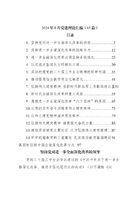 2024年8月党建理论汇编(15篇)目录1.坚持党对进一步全面深化改革的领导32.保持进一步全面深化改革的战略定力.123.进一步全面深化改革必须坚持系统观念224.以交流互鉴深化文明相处之道.305.深刻把握党的二十届三中全会精神的科学内涵356.推动理想信念教育常态化制度化417.弘扬伟大建党精神 在新时代新征程上贡献高校力量518.新时代全面深化改革的重大成就559.遵循进一步全面深化改革六个坚持的原则6510.从党的百年奋斗历程看伟大建党精神.7511.以伟大建党精神滋养党性修养.7912.弘扬伟大建党精神 凝聚强大奋进力量..8313.建好用好建党主题片区 大力弘扬伟大建党精神.8714.牢牢把握教育的三重属性 扎实推动教育强国建设91高目标引领中国全面深化改革方向97坚持党对进一步全面深化