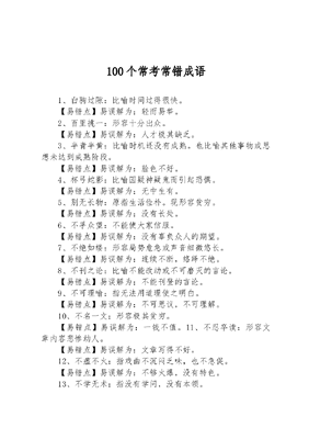 100个常考常错成语1、白驹过隙:比喻时间过得很快。【易错点】易误解为:轻而易举。2、百里挑一:形容十分出众。【易错点】易误解为:人才极其缺乏。3、半青半黄:比喻时机还没有成熟。也比喻其他事物或思想未达到成熟阶段。【易错点】易误解为:脸色不好。4、杯弓蛇影:比喻因疑神疑鬼而引起恐惧。【易错点】易误解为:无中生有。5、别无长物:原指生活俭朴。现形容贫穷。【易错点】易误解为:没有长处。6、不孚众望:不能使大家信服。【易错点】易误解为:没有辜负众人的期望。7、不绝如缕:形容局势危急或声音细微悠长。【易错点】易误解为:连续不断,络绎不绝。8、不刊之论:比喻不能改动或不可磨灭的言论。【易错点】易误解为:不能刊登的言论。9、不可理喻:指无法用道理使之明白。【易错点】易误解为:不可思议,不可理解。10、不名一文:形容极其贫穷。【易错点】易误解为:一钱不值。11、不忍卒读:形容文章内容悲惨动人。【易错点】易误解为:文章写得不好。12、不瘟不火:指戏曲不沉闷乏味,也不急促。【易错点】易误解为:不够火爆,没有特色。13、不学无术:指没有学问,没有本领。【易错点】易误解为:不学习就没有本领。14、不易之论:完全正确、不可更改的言论。【易错点】易误解为:不容易理解的言论。15、不赞一词:原指文章写得很好,别人不能再添一句话。现也指一言不发。【易错点】易误解为:不说一句赞成(或赞美)的话。16、不知所云:指说话者语言紊乱或空洞。用于说话人,不用于听话人。【易错点】易误解为:听者没有理解。17、不足为训:不值得作为效仿的准则、典范。【易错点】易误解为:不值得作为教训。18、惨淡经营:指下笔之前竭力劳神构思。也指苦心谋划、经营(某事)。【易错点】易误解为:经营状况不好。19、侧目而视:形容憎恨或又怕又愤恨。【易错点】易误解为:轻视、瞧不起;仰慕对方;骄傲自满。20、差强人意:大体上还能使人满意。【易错点】易误解为:不能令人满意。21、出神入化:形容技艺达到了绝妙的境界。【易错点】易误解为:出神。22、从长计议:对事情慎重地考虑,不急于作决定。【易错点】易误解为:眼光长远,从长远考虑。23、从善如流:形容能迅速地接受别人的好意见。【易错点】易误解为:做善事迅速自然。24、大而化之:形容做事情不小心谨慎。【易错点】易误解为:化大为小。25、大方之家:指见识广博或学有专长的人。【易错点】易误解为:大大方方的人。26、箪食壶浆:形容军队受到群众拥护和欢迎的情况。【易错点】易误解为:生活俭朴。27、当场出彩:比喻当着众人的面败露秘密或显出丑态。【易错点】易误解为:当场表现精彩。28、登高自卑:比喻做事情要循序渐进,由浅入深。【易错点】易误解为:觉得自己很渺小或自卑不自信。29、登堂入室:比喻学问或技能从浅到深,循序渐进,达到很高的水平。【易错点】易误解为:进入室内。30、豆蔻年华:指女子十三四岁的年纪。【易错点】易误解为:年龄正是好时候。31、耳提面命:形容恳切教导。【易错点】易误解为:提着耳朵当面命令(即严厉凶狠,当面训斥)。32、犯而不校:别人触犯了自己也不计较。【易错点】易误解为:犯了错误也不改正。33、飞短流长:指散播谣言,中伤他人。【易错点】易误解为:大自然的瀑布。34、付之一笑:比喻不计较,不当一回事。【易错点】易误解为:笑一笑或以微笑感谢对方。35、付诸东流:比喻希望落空,成果丧失,前功尽弃。【易错点】易误解为:稍纵即逝;烟消云散;化为乌有。36、瓜田李下:比喻容易引起嫌疑的场合。【易错点】易误解为:田园生活。37、果不其然:果然如此。【易错点】易误解为:结果不是这样或果然不是这样。38、裹足不前:形容有所顾虑而止步不敢向前。【易错点】易误解为:停滞不前。39、海外奇谈:比喻没有根据的、荒唐的言论或传闻。【易错点】易误解为:国外的奇谈怪论。40、毫发不爽:形容细微之处都不会出差错。【易错点】易误解为:丝毫都不爽快,不舒服。41、好为人师:形容不谦虚,自以为是,爱摆老资格。贬义词。【易错点】易误解为:热爱教师工作。42、河东狮吼:比喻悍妇发怒。【易错点】易误解为:吼声大。43、呼之欲出:指文学作品中人物的描写十分生动。【易错点】易误解为:出现,出台。44、毁家纾难:捐献所有家产,帮助国家减轻困难。【易错点】易误解为:家园被毁。45、见异思迁:指意志不坚定,喜爱不专一。【易错点】易误解为:拿不定主意。46、九牛一毛:表示微不足道。【易错点】易误解为:数量少。47、久假不归:长期借用而不归还。【易错点】易误解为:长期请假不回来。48、具体而微:形容内容大体具备而规模较小。【易错点】易误解为:详细具体而微小或细致入微。49、侃侃而谈:形容理直气壮、从容不迫地说话。【易错点】易误解为:聊天或夸夸其谈。50、慷慨解囊:形容毫不吝啬地拿出钱来帮助别人。【易错点】易误