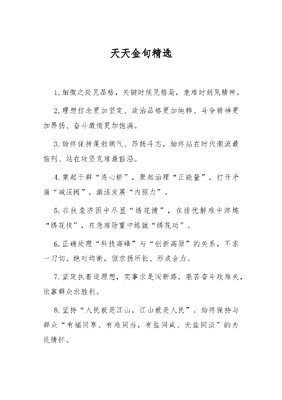 天天金句精选1.细微之处见品格,关键时候见格局,危难时刻见精神。2.理想信念更加坚定、政治品格更加纯粹、斗争精神更加昂扬、奋斗激情更加饱满。3.始终保持蓬勃朝气、昂扬斗志,始终站在时代潮流最前列、站在攻坚克难最前沿。4.架起干群连心桥,聚起治理正能量,打开矛盾减压阀,激活发展内驱力。5.在扶危济困中尽显绣花情,在排忧解难中淬炼绣花技,在急难险重中练就绣花功。6.正确处理科技高峰与创新高原的关系,不求一刀切、绝对均衡,但求扬所长、形成合力。7.坚定执着追理想,实事求是闯新路,艰苦奋斗攻难关,依靠群众求胜利。8.坚持人民就是江山,江山就是人民,始终保持与群众有福同享、有难同当,有盐同咸、无盐同淡的为民情怀。9.为热爱而全力以赴、为钟爱而倾情付出、为挚爱而义无反顾。10.点燃奋斗的激情,保持奋斗的定力,拿出奋斗的闯劲,以不懈奋斗在危机中育新机、于变局中开新局。11.脉络清晰、生动形象,主题鲜明、内涵丰富,既有政治高度,又有理性思考,更有实践感悟。12.想群众所想,忧群众所忧,急群众所急,到群众最需要的地方去解决问题,回应槽点、纾解痛点、打通堵点、补齐断点。13.弘扬担当精神,敢于接最烫手的山芋、挑最沉重的担子,做解决问题、造福群众的行动派和实干家。14.保持赶考的清醒、奋发的状态,时时叩问初心、处处践行使命。15.敢挑最重的担子,敢啃最硬的骨头,敢接最烫手的山芋,敢涉最险的水滩,敢爬最陡的山坡。16.逢山开路,遇水搭桥,做起而行之行动者,攻坚克难奋斗者,用心用情解决人民群众急难愁盼事。17.聚焦重点难点焦点,攻坚克难,主动作为,一件接着一件干,一锤接着一锤敲。18.在参与中传承、在传承中发扬,信仰之火就能熊熊不息,红色基因就能融入血脉。19.让产业集群成为肌肉记忆,百倍用心、千倍用力地向产业集群要力量、要未来。20.唯有以恳谈式倾听、蹲点式调研、体验式查访等方式真心向群众积极敞开大门,才能闻到辣味,听到实话,找到真问题。21.蕴藏着一个又一个可歌可泣的动人故事,传诵着一部又一部催人奋进的惊世传奇,铸就了一座又一座永不褪色的精神丰碑。22.既主动办事服务,又坚守红线底线,亲而有度、清而有为、清上加亲。23.勤于学、敏于思、勇于践、善于悟,方能知向何处,则不惑于方向;明所从来,则不竭于动力。24.荡涤心灵、砥砺精神的良药,成为明理、增信、崇德、力行的法宝。25.把牢政治门线、以自身硬来涵养革命勇气;筑牢思想防线、以自身强来激励革命斗志;守牢纪律底线、以自身严来保持革命精神。26.创建多元化空中课堂,开展多样化流动课堂,设立多种类社区课堂。27.项目是稳增长的压舱石、调结构的动力源、促转型的加速器。28.把抓发展的精气神聚焦到项目上,把稳增长的着力点集中到项目上,把调结构的突破口锁定到项目上。29.集中精力谋项目、集中力量抓项目、集中资源推项目。30.坚持工作向项目发力、要素向项目集中、服务向项目聚焦,以店小二式的优质服务,为项目建设提供良好环境、可靠保障。31.组织领导有力有序,学习教育入脑入心,方法载体求实务实。32.既挂帅又出征,亲力亲为、靠前指挥,推动形成上下左右一盘棋的工作格局。33.新起点赋予新使命,新征程呼唤新作为。34.一切与困难作的斗争,既是物质的角力,也是精神的对垒,既是实力的较量,也是定力的比拼。35.激情在迸发,力量在汇聚,信心在升腾。36.建立一部门牵头、多部门联动的协同推进机制,实现一个部门吹哨,多个部门报到,形成拳头效应。37.坚持项目为王的作战思路,投资跑出加速度,项目干出新高度。38.坚持学习业务知识,学出能力本领,学出思路方法;坚持学习综合知识,学出宽广视野,学出人文素养。39.定目标、抓落实,牢固树立抓而不紧等于没抓,抓而不实等于白抓的思想意识,坚持一抓到底,不达目的绝不罢休。40.敢于讲真话、勇于报实情,是担当作为的题中应有之义。不讲真话、谎报实情是最大的不担当、不作为。41.大兴调查研究之风,是展现新作为的必经之途。只有经过调查研究十月怀胎的过程,才能取得科学决策的一朝分娩。42.讲究规矩、守住底线,是最终实现担当作为的重要保障。不遵守规矩,触碰底线红线,不管能力多强、成绩多大,终将毁于一旦甚至身败名裂。43.以磐石般的理想信念、百折不挠的英雄气概、敢于胜利的顽强意志,写下气壮山河的伟大史诗。44.在提振精神状态上下功夫。思想认识支配行为,精神奋发推动落实,格局提升服务大局。45.在思辨能力上下功夫。推动高质量发展不是喊出来的,也不是轻轻松松就能实现的,说到