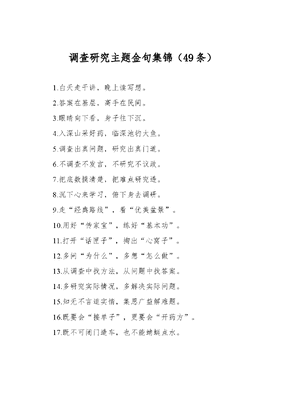 调查研究主题金句集锦(49条)1.白天走干讲,晚上读写想。2.答案在基层,高手在民间。3.眼睛向下看,身子往下沉。4.入深山采好药,临深池钓大鱼。5.调查出真问题,研究出真门道。6.不调查不发言,不研究不议政。7.把底数摸清楚,把难点研究透。8.沉下心来学习,俯下身去调研。9.走经典路线,看优美盆景。10.用好传家宝,练好基本功。11.打开话匣子,掏出心窝子。12.多问为什么,多想怎么做。13.从调查中找方法,从问题中找答案。14.多研究实际情况,多解决实际问题。15.知无不言道实情,集思广益解难题。16.既要会接单子,更要会开药方。17.既不可闭门造车,也不能蜻蜓点水。18.轰轰烈烈搞调研,浮皮潦草抓解决。19.下好调查先手棋,打好研究主动仗。20.全心全意听民声,集思广益聚民智。21.下好绣花功夫,做好精准文章。一层一层往内里剥,一锹一锹往深处挖。22.紧盯问题解剖麻雀,精准定位帮建指导。23.脱鞋下田式蹲点,庖丁解牛式调研。24.轰轰烈烈搞形式,认认真真走过场。25.调查研究的准星,经济社会的靶心。26.总结的真凭实据,汇报的原汁原味。27.既不要添油加醋,也不要短斤缺两。28.看到不加滤镜的社情,听到最原生态的民意。29.知道群众的急难愁盼,了解群众的真情实愿。30.搭台唱戏式走访,闭门造车式调研。31.只有调研的上篇文章,没有落实的下篇文章。32.俯下身子看清蚂蚁,蹲在基层解剖麻雀33.把调查搞成了指导,把研究搞成了活动。34.由表及里找准症结所在,由点及面把握规律特征。35.于复杂情况中抽丝剥茧,于万千现象中循迹溯源。36.广开言路方可寻得问题,开门纳谏才能汇集众智。37.倾听群众的七嘴八舌,关心群众的家长里短。38.多提务实管用的对策建议,多谋解决问题的有效办法。39.脚踏实地切忌走马观花,解难化险克服蜻蜓点水。40.以调查研究为发展提速,以调查研究为转型开篇。41.过筛子的办法发现问题,钉钉子的精神解决问题。研究把握事物的本质和规律,找到破解难题的办法和路径。42.实践是一座金矿,取之不尽;基层是一口深井,越挖越深。43.聚焦人民群众的急难愁盼,对准百姓生活的细枝末节。44.用好调查研究这个传家宝,做好调查研究这一基本功。45.扑下身子才能看清样子,端着架子只会到此一游。46.既看光鲜亮丽的门面和窗口,也得看黯然失色的后院和角落。你搞一波督导、我搞一轮监察,你抓一组调研、我抓一次检查。