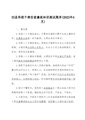 XX县科级干部任前廉政知识测试题库(2023年4月)一、填空题1.党的二十大报告指出,只要存在腐败问题产生的土壤和条件,反腐败斗争就一刻不能停,必须永远吹冲锋号。2.党的二十大报告指出,坚持走中国特色社会主义政治发展道路,全面发展全过程人民民主,社会主义民主政治制度化、规范化、程序化全面推进。3.党的二十大报告中强调,必须坚定不移全面从严治党,深入推进新时代党的建设新的伟大工程。4.锲而不舍落实中央八项规定精神,持续深化纠治四风重点纠治形式主义、官僚主义,坚决破除特权思想和特权行为。5.坚决做到两个维护是指,坚决维护习近平总书记党中央的核心、全党的核心地位,坚决维护党中央权威和集中统一领导。6.经过不懈努力,党找到了自我革命这一跳出治乱兴衰历史周期率的第二个答案,确保党永远不变质、不变色、不变味。7.从现在起,中国共产党的中心任务就是团结带领全国各族人民全面建成社会主义现代化强国、实现第二个百年奋斗目标,以中国式现代化全面推进中华民族伟大复兴。8.《党章》规定,中国共产党以马克思列宁主义、毛泽东思想、邓小平理论、三个代表重要思想、科学发展观、 习近平新时代中国特色社会主义思想 作为自己的行动指南。9.《党章》规定,必须按照中国特色社会主义事业五位一体总体布局和四个全面战略布局,全面统筹推进经济建设政治建设、文化建设、社会建设、生态文明建设,协调推进全面建设社会主义现代化国家、全面深化改革、 全面依法治国 、 全面从严治党 。10.《党章》规定,必须坚持以人民为中心的发展思想,把握新发展阶段,贯彻创新、协调、绿色、开放、共享的新发展理念11.《中国共产党廉洁自律准则》是党执政以来第一部坚持正面倡导、面向全体党员的规范全党廉洁自律工作的重要基础性法规。12.《中国共产党廉洁自律准则》要求中国共产党全体党员和各级党员领导干部必须坚定共产主义理想和中国特色社会主义信念,必须坚持全心全意为人民服务根本宗旨,必须继承发扬党的优良传统和作风,必须自觉培养高尚道德情操,努力弘扬中华民族传统美德,廉洁自律,接受监督,永葆党的先进性和纯洁性。13.《中国共产党纪律处分条例》规定,党组织和党员必须牢固树立 政治 意识、 大局 意识、 核心 意识、 看齐 意识自觉遵守党章,严格执行和维护党的纪律,自觉接受党的纪律约束,模范遵守国家法律法规。14.《中国共产党纪律处分条例》规定,违纪行为有关责任人员的区分,可分为直接责任者、主要领导责任者和重要领导责任者。15.《中国共产党党内监督条例》明确,纪律检查机关必须把维护党的政治纪律和政治规矩放在首位,坚决纠正和查处上有政策、下有对策,有令不行、有禁不止,口是心非、阳奉阴违,搞团团伙伙、拉帮结派,欺骗组织、对抗组织等行为。16.《中国共产党问责条例》指出,问责对象是党组织、党的领导干部,重点是党委(党组)、党的工作机关及其领导成员,纪委、纪委派驻(派出)机构及其领导成员。17.党的作风建设的内容主要包括思想作风、学风 、工作作风、领导作风、生活作风等五个方面。18.党员受到警告处分一年内、受到严重警告处分一年半内,不得在党内提升职务和向党外组织推荐担任高于其原任职务的党外职务。19.一人有《中国共产党纪律处分条例》规定的两种以上(含两种)应当受到党纪处分的违纪行为,应当合并处理,按其数种违纪行为中应当受到的最高处分加重一档给予处分。20.在上级检查、视察工作或者向上级汇报、报告工作时对应当报告的事项不报告或者不如实报告,造成严重损害或者严重不良影响的,对直接责任者和领导责任者,给予警告或者严重警告处分;情节严重的,给予撤销党内职务或者留党察看处分。在上级检查、视察工作或者向上级汇报、报告工作时纵容、唆使、暗示、强迫下级说假话、报假情的,从重或者加重处分。21.党员领导干部的配偶、子女及其配偶,违反有关规定在该党员领导干部管辖的区域或者业务范围内从事可能影响其公正执行公务的经营活动,或者在该党员领导干部管辖的区域或者业务范围内的外商独资企业、中外合资企业中担任由外方委派、聘任的高级职务的,该党员领导干部应当按照规定予以纠正;拒不纠正的,其本人应当辞去现任职务或者由组织予以调整职务;不辞去现任职务或者不服从组织调整职务的,给予撤销党内职务处分22.收受请托人财物后及时退还或者上交的,不是违纪。23.在社会保障、政策扶持、扶贫脱贫、救灾救济款物分配等事项中优亲厚友、明显有失公平的,给予警告或者严重警告处分情节较重的,给予撤销党内职务或者留党察看处分;情节严重的给予开除党籍处分。24.监察委员会依照《中华人民共和国监察法》和有关法律规定履行监督、调查、处置职责。25.监察机关办理职务违法和职务犯罪案件,应当与审