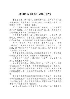 金句精选100句(20231109)1.干字当先、快干实干,坚持高标定位,以干就干一流、当就当先进、争就争第一的信心决心,一天紧似一天干、一环紧着一环拧、一锤接着一锤敲。2.以明知山有虎、偏向虎山行的闯劲,以不破楼兰终不还的韧劲,以虎踞龙盘今胜昔的心劲,在把握历史主动中抢抓发展机遇、勇于担当作为。3.在更高的参照系中确立发展坐标和定位,对照先进、盯紧标兵,知难而进、迎难而上,把信心强起来、把状态提起来、把劲头鼓起来,用昂扬的精气神汇聚干事创业的强大力量。4.实字当头、干字为先,勇挑千斤担、敢啃硬骨头,做到既锚定目标、埋头苦干,又开动脑筋、广开门路,把硬功夫和巧办法结合起来,把原则性和灵活性结合起来。5.在全面改革上做文章,在深化改革上下功夫,谋划实施创新发展综合配套改革,以改革之火点燃创新引擎。6.理论学习扎实、调查研究求实、推动发展务实、检视整改严实。7.树牢担当的导向,既要在思想上有领的能力,又要在行动上当干的表率,不仅要登高望远谋全局、把方向、议大事,还要身体力行抓落实、管具体、干到位。8.是一次深刻的政治辅导,是一次生动的党性教育,是一次难得的思想充电。9.创新方法就是以改革创新思维激发内部活力。没有掌握科学方法论抓执行,战略主动就是一句空话。观念一变天地宽,主打差异化竞争、坚持成本领先理念,盯紧关键问题通盘分析,通过一个问题推动解决一批问题。10.变相马为赛马,大胆重用敢于组合要素、善于配置资源的干部,把说外行话办糊涂事的庸才从关键岗位撸下去,为担当者担当,为干事者撑腰,调动积极性和创造力。11.切实转变作风、敢打硬仗,努力在战争中学会战争,努力在无先例中创造先例,首问负责,不退不让,持续树立标杆、造就变化。12.善用逆向思维,不浪费每一次危机。像华为一样,把握跨周期、逆周期规律,善于危中寻机、险中求胜,在困难和教训中练就本领,变被动为主动。13.以密集炮火饱和覆盖优势领域,用一场场胜仗,逐步累积优势。14.回首过去,成绩固然可喜;分析现实,任务依然艰巨;展望未来,机遇与挑战并存。15.底线问题等不得,不能犹豫不决。打好底线问题攻坚战,既是对害的有效防御,也是对利的理性思考,更是发展信心的根本来源。16.慢一步,就会前功尽弃。慢一步,就会偏离规律。慢一步,就可能失去民心。17.坚持小步快跑、远近结合的方法论,找准主要矛盾,敢于重新组合、配置要素,打一仗、进一步,以更多机制改革为创新者开道,为改革者撑腰,跳出小部分人的意志,回应更广大的诉求。18.改革没有完成时,瓶颈是躲不过、绕不开的,所有老路走到头,只能靠改革。19.改革问题迟不得,不能熟视无睹。改革集中体现打持久战和打歼灭战结合的艺术,最怕在深水区翻烧饼、停滞不前、打消耗战。20.任何持久战的胜利,都是由一场场歼灭战的胜利组成的。什么叫打歼灭战?在军事上,就是集中优势兵力、各个歼灭敌人的作战方法,能做到全歼、速决。21.以超常规的力度和举措加快项目建设,全力让停滞项目动起来、缓建项目快起来、开工项目跑起来,统筹抓好签约项目开工、开工项目投产、投产项目达效,加快投资进度、提高投资增速,积极扩大有效投资。22.激发拼的干劲,保持抢的状态,加大争的力度,发扬实的作风,撸起袖子加油干、争分夺秒抓紧干、一鼓作气拼命干,咬定目标、乘势而上,以志在必得的信心和决心夺取首战告捷。23.提高舆论引导能力,在关键时刻敢于发声、善于发声,敲响定音鼓,营造良好舆论氛围。24.多个角度、换位思考、创新方法,在政策落实上再加强、在服务质效上再提升、在帮扶指导上更精准,25.加大宣传力度、扩大覆盖广度、提升引导强度、形成舆论强势,用心用情讲好故事、用镜头用笔传播好声音。26.以毫笔见证精气神韵,以寸镜捕捉盛世华章。27.用心描绘时代画卷,用力奏响时代强音。28.工作上真心实意、政策上真枪实弹、效果上真金白银,以最开放的姿态、最务实的举措、最优质的服务。29.,发扬筚路蓝缕,以启山林的创业精神、不鸣则已,一鸣惊人的创新精神,保持春江水暖鸭先知的敏锐嗅觉,激发狭路相逢勇者胜的昂扬斗志,踏准时来天地皆同力的发展节拍。30.理想信念是事业前进的灯塔,是拼搏奋斗的方向。31.坚持学思用贯通、知信行统一,用心办实事解民忧,用力破难题促发展。32.宣示紧跟追随的忠诚意志,遵循蓝图总纲的光辉指引,承载先行探路的使命担当,升华勇立潮头的格局境界。33.紧盯重要经济指标不放松,补短板,强弱项;狠抓重点项目不放手,拼速度、扬优势;优化营商环境不懈怠,稳增长、固底板;以非常之功应对非常之势,全力决战决胜。34.在市场竞争中抢抓新机遇,在转型升级中拓展新空间,在加快创新中布局新赛道,拼出了