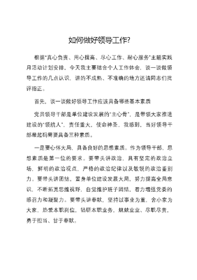 如何做好领导工作?根据真心负责、用心提高、尽心工作、耐心服务主题实践月活动计划安排,今天我主要结合个人工作体会,谈一谈做领导工作的几点认识,讲的不成熟、不准确的地方还请同志们批评指正。首先,谈一谈做好领导工作应该具备哪些基本素质党员领导干部是单位建设发展的主心骨,是带领大家推进建设的领航人,责任重大,使命神圣,我感到,当好领导干部最起码需要具备三种素质。一是要心怀大局,具备良好的思想素质。作为领导干部,思想素质是第一位的要求。要带头讲政治,具有坚定的政治立场,鲜明的政治观点,严格的政治纪律以及敏锐的政治鉴别力。要带头讲团结,置身单位建设发展大局,努力提高全局意识,不断拓宽思维视野,自觉维护班子团结,着力增强党委的感召力和凝聚力。要带头讲奉献,坚持以事业为重,舍小家为大家,热爱本职岗位,钻研本职业务,兢兢业业、尽职尽责,勇于担当、甘于奉献。二是要运筹帷幄,具备较强的能力素质。领导工作关乎建设发展方向,决定建设道路,要求各级党员领导干部必须具备较强工作能力。作为领导干部,要善把方向,能够审时度势准确把握发展大局,高瞻远瞩有效实施科学决策,胸怀全局合理确定工作目标。要会统力量,能够科学分配精力,合理使用权力,充分运用人力,善于谋大事、统全局、抓重点,学会十个指头弹钢琴。要能解难题,经常研究建设中出现的新情况新问题,积极解决广大党员群众关心关注的热点难点问题,对重大原则性问题、群众敏感性问题、发展倾向性问题、涉及全局性问题能够出谋划策、拍板定案。三是要修身正德,具备过硬的作风素质。作风形象是党员领导干部凝心聚力的根本前提。要树立求真务实的形象,不做华而不实、弄虚作假的应景文章,不干跟风迎合、劳民伤财的形象工程,凡事切合实际、符合实情、务求实效,真正做到真抓实干、埋头苦干、抓紧快干。要树立公道正派的形象,切实放下私心,抛却私情,秉公用权,公道办事,特别是在涉及单位风气建设的问题上,领导干部要怀公心、行公道,襟怀坦荡、光明磊落。要树立廉洁自律的形象,祛除私心杂念,脱离低级趣味,筑牢思想防线,修好道德品行,始终保持蓬勃朝气、昂扬锐气、浩然正气,切实以良好的人品官德赢得同志们的尊重和威信。其次,谈一谈做领导工作需要养成哪些良好习惯做好领导工作能力素质是前提,而提高能力素质则需要养成良好的行为习惯。一是要养成主动学习的习惯。古人说:欲木之长者,必须固其根本;欲流之远者,必浚其泉源。领导干部要提高能力,学习是第一位的。要强化学习意识,不断增强学习的紧迫感和主动性,常怀知识恐慌本领恐慌,常找能力短板、素质差距,锲而不舍,奋起直追。要培养学习毅力,领导干部的工作经常是千头万绪、交织并行,工学矛盾比较突出,要勤于挤赢得学习时间,勇于钻汲取知识营养,敢于忍不惧枯燥乏味,不给自己没空学习找借口,不放松自我要求。要掌握学习方法,求知无捷径,苦读有奇功。学习贵在勤奋,要坚持每天读书看报做笔记,经常搜集整理回头看,同时要积极向同志们学、向实践学、向上级领导学,在勤奋学习中增智强能。二是要养成反复思考的习惯。马克思曾讲,人是靠思考站立的,人如果没有思想就不能够真正地站立起来。作为领导干部,更需要在工作生活学习中深入思索、不断释疑,探究真谛、举一反三。要坚持辩证思考,不能只见树木不见森林,不能头痛医头脚痛医脚,也不能刻舟求剑,要学会全面地、联系地、发展地看问题,以辩证性求思想性、求深刻性。要聚焦本职思考,坚持着眼工作实际、着眼岗位需求、着眼问题导向深入思考,始终以问题牵引,向工作聚焦,用成效检验。要注重求异思考,敢于打破陈规陋习、解放思想,善于运用发散思维、逆向思维,从不同的角度,用不同的方法,提出新观点、形成新思路、拿出新举措,给人以眼前一亮、耳目一新的感觉。三是要养成经常调研的习惯。没有调查就没有发言权,没有调查就没有决策权。领导干部指导基层必须先了解基层,要养成经常调查研究的习惯。开展调查研究,一般要分为两个步骤:首先是全面系统调查,其次是深入细致研究。关于调查,要有的放矢,针对一定时期内带有方向性、倾向性的问题开展专题调研,旨在查明情况、解决问题;要系统全面,防止走马观花,力戒片面单一;要讲究方法,既通过汇报了解情况,又深入一线获得感性认识,坚持多层次、多方位、多渠道地调查,防止以点代面、一叶障目。关于研究,第一要会研究,对调查实践得来的材料进行去粗取精、去伪存真、由此及彼、由表及里的认真分析,找出带规律性和普遍性的东西;其次要肯研究,必须开动脑筋,发扬钉钉子精神,在研究上下一番苦功夫、深功夫、细功夫,透过事物的表象抓住本质和主流,分析其内在矛盾和运动规律;再者要善研究,要综合运用归纳与演绎、分析与综合、具体与抽象、分类与比较、统计与抽样等方法对感性认识进行加工制作,挖出根源、找准本