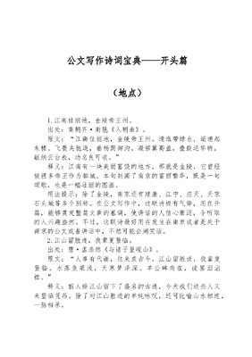 公文写作诗词宝典——开头篇(地点)1.江南佳丽地,金陵帝王州。出处:南朝齐·谢朓《入朝曲》。原文:江南佳丽地,金陵帝王州。逶迤带绿水,迢递起朱楼。飞甍夹驰道,垂杨荫御沟。凝笳翼高盖,叠鼓送华辀。献纳云台表,功名良可收。释义:江南有一块美丽富饶的地方,那就是金陵,它曾经被很多帝王作为都城。本句刻画了南京的富丽繁华,既是一句颂歌,也是一幅壮丽的图画。用法提示:除了金陵,南京还有建康、江宁、应天、天京石头城等多个别称。在公文写作中,这联诗极有气势,用在开篇,能够奠定整篇文章的基调,使讲话的人信心豪迈,令听取的人兴趣盎然。不过,这联诗最好用在发生在南京或者是关于南京的公文或者讲话中,不然可能会闹笑话。2.江山留胜迹,我辈复登临。出处:唐·孟浩然《与诸子登岘山》。原文:人事有代谢,往来成古今。江山留胜迹,我辈复登临。水落鱼梁浅,天寒梦泽深。羊公碑尚在,读罢泪沾襟。释义:前人给江山留下了盛名的古迹,今天我们这些人又来登临凭吊。除了对江山胜迹的单纯咏叹,还可比喻山水相连,一脉相承。用法提示:这本是孟浩然求仕不遇后,因心情苦闷而作:登临岘山,凭吊羊公碑,怀古伤今,抒发感慨,想到自己空有抱负,不觉分外悲伤,泪湿衣襟。但千载之下,我们再来看时,只觉诗作感情真挚深沉,于平淡中见深远。虽然孟浩然当时说的是岘山,但是这首诗现在却可以用在各个地方。在公文写作中,如果是发言稿,对象可以是下属,也可以是对方——尤其是发言者在其他地方发言的时候,引用这句,很能拉近双方的关系。3.踏遍青山人未老,风景这边独好。出处:近现代·毛泽东《清平乐·会昌》。原文:东方欲晓,莫道君行早。踏遍青山人未老,风景这边独好。会昌城外高峰,颠连直接东溟。战士指看南粤,更加郁郁葱葱。释义:我遍踏青山绿水,人仍正当年华,还是这边的风景最好。比喻:不断地探索,不断地奋斗,永不言败,永不服老。用法提示:诗词风格恢宏霸气,很能提振人们的精气神。都已经踏遍青山了,人还没有老,说明这是经过一段时间、一些事情之后的沉淀,是老夫聊发少年狂,是烈士暮年,壮心不已。在公文写作中,这句词一是提气;二是周知。而且风景这边独好一句,颇有些曾经沧海难为水,除却巫山不是云的意味,可以是自信,夸奖己方;也可以是恭维,夸奖对方。4.气蒸云梦泽,波撼岳阳城。出处:唐·孟浩然《望洞庭湖赠张丞相》。原文:八月湖水平,涵虚混太清。气蒸云梦泽,波撼岳阳城。欲济无舟楫,端居耻圣明。坐观垂钓者,空有羡鱼情。释义:笼罩在湖上的水气蒸腾,吞没了云、梦二泽;西南风起时,波涛奔腾,涌向东北岸,好像要摇动岳阳城似的。展现了洞庭湖的壮阔景象。用法提示:云梦是我国古代两个湖泽的名称,据说云泽在江北,梦泽在江南,后来直接用云梦指代洞庭湖。气蒸云梦泽,波撼岳阳城是描写洞庭湖的千古名句,从古至今,能出其右者凤毛麟角。在公文写作中,洞庭和岳阳颇有限制性,不过这么好的诗句,丢之实在可惜,用时不妨以此比彼,以壮本地之声势。比如,人道气蒸云梦泽,波撼岳阳城,其实这昆明湖也颇有云梦之象。今日大会在此召开,各界精英云集,××项目也必将取得圆满成功。5.江流天地外,山色有无中。出处:唐·王维《汉江临泛》。原文:楚塞三湘接,荆门九派通。江流天地外,山色有无中。郡邑浮前浦,波澜动远空。襄阳好风日,留醉与山翁。释义:汉江滔滔远去,好像一直涌流到天地之外去了,两岸重重青山,迷迷蒙蒙,时隐时现,若有若无。展现了汉江流域的壮丽景象。用法提示:如果没有特别说明,江与河在古代文献典籍中,都是特指长江和黄河的。而这首诗中的江指的则是汉江,江流天地外,山色有无中是王维在汉江泛舟时的所见之景,是王维融画入诗的力作。汉江,也叫汉水。在公文写作中,就不必那么拘束了,如此山水美景,当然不只汉江流域才有。6.东南形胜,三吴都会,钱塘自古繁华。出处:北宋·柳永《望海潮·东南形胜》。原文:东南形胜,三吴都会,钱塘自古繁华。烟柳画桥风帘翠幕,参差十万人家。释义:地处东南的杭州地理位置重要,风景优美,是江南吴地的大都会,钱塘江一带自古以来就十分繁华。描写了杭州的富庶与美丽。用法提示:很多人都知道柳永的这首词,但是也有很多人不知道柳永写的是浙江杭州。首先来说说三吴。《水经注》中的说法最早也最确切,即指吴郡、吴兴和会稽三郡,后来用来指代江南吴地。然后我们再来说说钱塘。钱塘江古称浙,又称浙江,在杭州湾芦潮港闸和外游山的连线上流入东海。钱塘一词,一般用来指代杭州。在公文写作中,就不必那么拘泥了,当然,如果你在杭州更好。7.虎踞龙盘今胜昔。出处:近现代·毛泽东《人民解放军占领南京》。原文:钟山风雨起苍黄,百万雄师过大江。虎踞龙盘今胜昔,天翻地覆慨而慷。释义:地势雄伟险要的古都南京终于回到人民手中,她比任何时候都要美丽。今昔