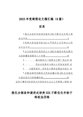 2023年党建理论文稿汇编(8篇)目录1.强化全链条和递进式培养XXX不断优化年轻干部政治历练22.构建立体监督网络XXX从严规范公务员辞去公职后从业行为 113.全方位培养引进用好人才XXX为推进中国式现代化的新疆实践提供人才支撑 .194..推动新时代凝聚力工程再出发305..党的自我革命与解决大党独有难题356..为强国建设、民族复兴提供坚强组织保证437.完整准确贯彻新时代党的治疆方略XXX扎实推进中国式现代化的新疆实践 51坚持不懈用XXX新时代中国特色社会主义思想凝心铸魂63强化全链条和递进式培养XXX不断优化年轻干部政治历练党的XX大报告提出,建设堪当民族复兴重任的高素质干部队伍,并强调抓好后继有人这个根本大计,健全培养选拔优秀年轻干部常态化工作机制,把到基层和艰苦地区锻炼成长作为年轻干部培养的重要途径。加强年轻干部政治历练是一项系统性、全局性、战略性工程,既不能只抓一时一事,也不能仅盯着一个阶段、一个时期的表现,必须遵循干部成长的客观规律,着眼于领导班子和干部队伍长期建设来统筹规划和设计,要牵住核心问题的牛鼻子,综合考虑年轻干部成长的不同时间段、职务级别、岗位类别等,以全链条和递进式培养,不断优化年轻干部政治历练的方法途径,在思想铸魂、实践历练、政治锤炼、严管激励中,努力造就一支可堪时代重任的高素质年轻干部队伍。一、持续推动年轻干部学懂弄通做实XXX新时代中国特色社会主义思想,以理论上的清醒确保政治上的坚定思想是行动的先导,思想的深度决定行动的高度。加强党的思想建设,首先必须抓好理想信念教育,坚持不懈用XXX新时代中国特色社会主义思想武装头脑、凝心聚魂。一是加强理论武装。加强年轻干部思想政治教育特别是中国特色社会主义理论体系教育,深学细悟XXX新时代中国特色社会主义思想,牢固树立正确的世界观、权力观、事业观,切实增强运用马克思主义立场观点方法分析和解决实际问题的能力,把提升党性修养同研究解决改革发展稳定的重大问题、人民群众最关心最直接最现实的利益问题结合起来,在大是大非面前保持清醒认识,在大风大浪面前坚持正确立场,在各种诱惑面前筑牢思想防线。通过开展学党的创新理论、做四个特别干部、干部教育培训半月谈、领导干部带头领办难题等活动,帮助年轻干部学深悟透马克思主义中国化时代化的最新理论成果。二是坚定共产主义信念。坚持把党的创新理论学习培训与马克思主义基本原理学习结合起来,与党性教育、专业化能力培训结合起来,与奋进新征程的伟大实践结合起来,引导年轻干部不断提高马克思主义思想觉悟和理论水平,保持对远大理想和奋斗目标的清醒认知和执着追求,努力做共产主义远大理想的坚定信仰者和忠实实践者,不断提高政治敏锐性和政治鉴别力,增强工作的原则性、系统性、预见性、创造性。在各类干部教育培训主体班次中增设铸牢中华民族共同体意识专题,将相关课时比例提高到10%以上,引导年轻干部站稳政治立场、坚守政治原则、提高政治站位。三是创新学习的方式方法。精选一批国内知名专家学者,通过定期现场讲授和录制视频等方式在党校各类主体班次中加入重磅精品课程。按照缺什么、补什么的原则,实施精准调训、系统轮训。针对优秀年轻干部的知识空白、经验盲区、能力短板,持续开展一把手党课专题培训,让领导干部尤其是主要负责同志把年轻干部教育工作作为重大政治任务来抓,并请各级党政领导班子成员定期为年轻干部现场授课、现身说法。拓展实战交流,请新提任的年轻干部走上讲台,分享实战经验和工作中遇到的问题,让他们同台亮相、同场竞技,在比学赶超中晒出业绩、树立标杆,传导压力、增添动力,在相互切磋促进的同时,帮助他们补短板、练本领、扛重担。二、持续推动年轻干部在重大任务重大斗争主战场接受锤炼,以组织上的培养积累政治上的经验XXXXXX指出,在领导干部的所有能力中,政治能力是第一位的。要大力选派年轻干部到改革发展稳定第一线、重大斗争
