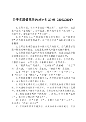 关于实践锻炼类的排比句39例(20230804)1.在练本领、长本事中当好螺丝钉,在涉深水、破坚冰中淬炼金刚钻,在听民意、解民忧中搭好连心桥,在能吃苦、善吃苦中耕好责任田。2.在滚石上山的实践中强化攻坚意识,在风霜雨雪的历练中砥砺坚强品质,在逆水行舟的困境中激发斗争精神。3.在承担急难险重任务中淬炼过人的胆识,在化解矛盾问题中锻造过硬的担当,在处置复杂情况中涵养过细的精准。4.在加强理论武装中淬炼过硬政治素养,在推动实践中锻造过硬能力本领,在面对急难险重任务时敢于动真碰硬。5.在奔跑中突围、永不止步,在磨砺中成长、永不逃避,在挫折中奋起、永不气馁,在奉献中坚守、永不放弃。6.转换角色是前提,把准脉搏是基础,对症下药是关键,攻坚克难是重点,脚踏实地是保证。7.要吃苦不怕吃亏,要斗争不要争斗,要对比不要攀比,精准不要大概。8.在筚路蓝缕中收获勇毅担当,在披荆斩棘中练就善作善成,在火热实践中推进事业发展。9.到改革发展稳定主战场锻炼,到艰苦复杂地区最前沿磨练,到关键吃劲岗位第一线历练。10.在艰苦条件下培育打仗精神,在复杂情况中磨砺作战本领,在恶劣环境中激发求胜欲望。11.检验能力素质的试炼场,反映工作水平的温度计,体现宗旨意识的试金石。12.多经历一些千钧一发,多接手几回烫手山芋,多当几次热锅上的蚂蚁。13.在开阔眼界中取得真经,在复杂斗争中磨练意志,在实践锻炼中增强才干。14.在摸爬滚打中增长才干,在层层历练中积累经验,在大风大浪中处变不惊。15.在开阔眼界中取得真经,在复杂斗争中磨练意志,在实践锻炼中增强才干。16.提高站位,培养大局观;脚踏实地,提升执行力;提升修养,锻造真本领。17.奋战经济建设主战场,勇立科技创新最前沿,下沉社会治理第一线。18.在勤学善思中强本领,在一线实践中增才干,在真抓实干中促落实。19.多从经典案例中学习,多在培训演练中掌握,多从实践历练中提升。20.在实践中学习,在实践中感悟,在实践中思考,在实践中总结。21.在学习上不怕吃苦,在环境上不避艰苦,在现实中踏实苦干。22.改革发展的主战场,化解矛盾的最前沿,服务群众的第一线。23.在战胜挑战中发展,在风雨洗礼中成长,在历经考验中壮大。24.攻坚克难的最前沿,发展建设的主战场,维护稳定的第一线。25.在拼搏中摔打锤炼,在逆境中迎难而上,在风雨中砥砺前行。26.改革发展的主战场,斗争角力的最前沿,繁重任务的第一线。27.在学习中成长进步,在思考中明辨是非,在实践中提高本领。28.在赶考中书写答卷,在磨砺中收获喜悦,在奋斗中感受幸福。29.送人出征的上马石,磨砺意志的磨刀石,稳重行驶的压舱石。30.在学习中获取本领,在调研中转化本领,在实践中提升本领。31.岗位的大舞台,社会的大课堂,基层的大熔炉。32.改革发展主战场,维护稳定第一线,服务群众最前沿。33.追赶发展最前沿,项目建设主战场,急难险重紧要处。34.学出硬本领,谋出大手笔,拼出新风貌,干出真业绩。35.在实践中学真知,在实践中悟真谛,在实践中长真才。36.勇挑重担子,练就铁肩膀, 甘做老黄牛。37.牵住牛鼻子,学会弹钢琴,找准金钥匙。38.以勤学长知识,以苦练精技术,以创新求突破。39.锤炼过硬信念,锻造过硬本领,铸就过硬作风。