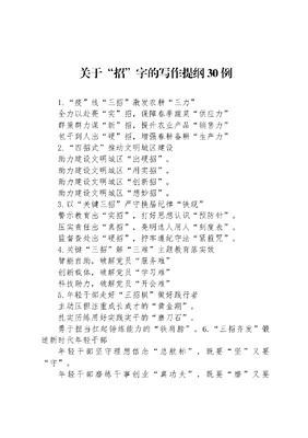 关于招字的写作提纲30例1.疫线三招激发农耕三力全力以赴亮实招,保障春季蔬菜供应力群策群力谋新招,提升农业产品销售力包干到人出硬招,增强春耕备耕生产力2.四招式推动文明城区建设助力建设文明城区出硬招。助力建设文明城区用实招。助力建设文明城区创新招。助力建设文明城区想妙招。3.以关键三招严守换届纪律铁规警示教育出实招,打好思想认识预防针。压实责任出真招,亮明选人用人刻度表。监督查处出硬招,拧牢遵纪守法紧箍咒。4.关键三招解三难主题教育落实效智能自助,破解党员服务难创新载体,破解党员学习难科技助力,破解党员开会难5.年轻干部走好三招棋做好践行者主动压担注重成长成才的黄金期。扎实历练用好实践实干的磨刀石。勇于担当扛起锤炼能力的铁肩膀。6.三招齐发锻造新时代年轻干部年轻干部坚守理想信念总航标,既要坚又要守。年轻干部磨练干事创业真功夫,既要磨又要练。年轻干部铸造党性修养大熔炉,既要铸又要造。7.三招共谋,驱动高水平自立自强聚人才,打造人才聚集强磁场,抓好构建新发展格局的第一资源。融产业,优化产业创新落脚点,抓好构建新发展格局的第一动力。补落差,焕发地域经济新活力,抓好构建新发展格局的第一主体。8.三招打造高素质干部队伍以选准用好为根本,打造一支高素质干部队伍。以能力培养为基础,打造一支高素质干部队伍。以强化监督为保障,打造一支高素质干部队伍。9.三招护航进博会打好畅通牌。下好防守棋。出好组合拳。10.选、育、管三招抓好社区干部队伍建设选字为先,优结构育字为本,提素质管字为重,增效能11.三个实招推进党建项目化建设实打实:新辟健身场所得实惠心贴心:改建老旧设施顺民意面对面:志愿服务美化家园12.三招打好党员教育组合拳强化制度建设,做实党员教育细化培训内容,做精党员教育优化培训载体,做活党员教育13.用好三招,全力推进无疫小区创建党建引领出实招,锻造主心骨扎实管理使硬招,筑牢防疫墙凝聚群众用巧招,织密防护网14.三招走稳职业技术教育发展三新之路涵养咬定青山不放松的坚定信念,走稳适应新变化之路。涵养而今迈步从头越的创新意识,走稳开辟新方式之路。涵养万番琢磨方成器的工匠精神,走稳磨砺新技能之路。15.以三招促三高提升组织工作质量和水平思想引领出新招,树牢高能标杆。干部培养出合招,绽放高光时刻。夯基固本出实招,瞄定高新样板。16.关键三招破解两新党建三难智能自助,破解党员服务难创新载体,破解党员学习难科技助力,破解党员开会难17.三大实招助推基层自治开展楼道自治创新基层工作积分考核加强基层队伍管理依托区域党建夯实党建基础18.练好三招争做金牌店小二做好加减法,找准服务方式优化前后台,创新服务模式兼修内外功,提升服务本事19.针对三多出三招,推服务型党组织建设围绕三个一主题,为民服务出实招。一个班子一个中心,示范带动。一个睦邻点一个平台,良性互动。一名党员一面旗帜,全员发动。开展四个门行动,为民服务用真心。敲门行动。串门行动。心门行动。守门行动。探索五个让机制,为民服务怀真情。居民的事让居民知晓。居民的事让居民做主。居民的事让居民监督。社区的事让社区成员单位参与。居民的事让居民满意。20.三招提升党建成效第一招:言传身教坚定理想信念第二招:先锋意识增强党性修养第三招:创新实践践行创建成效21.三招赋能基层治理织密红色末梢根系党建引领,夯实末梢治理压舱石,打造组织力量五化新格局真抓实干,练好为民服务基本功,擦亮服务前移金字招牌强化调研,深挖末梢治理老大难,释放典型示范强大动能22.三招打通城市基层治理毛细血管全面排摸聚焦需求夏季高温送清凉党工联动保障全23.三招下活村民自治共治一盘棋当头炮——村规先行,变官管为规管穿宫马——组规助力,变官管为民管羊角士——家规护院,变官管为家管24.三招奏响非公企业党建蝶变曲聚焦:以高质量党建激发内生动力关键一招:启动孵化机制 构建品牌培育生态链聚焦:以高质量党建赋能营商环境关键一招:探索党建联盟 形成产业发展聚能环聚焦:以高质量党建引领基层治理关键一招:找准功能定位 绘就基层治理同心圆25.三招做实回头看确保整治不回潮落实回头看机制。抓好我来管队伍。搭建有话说平台。26.三个实招推进主题教育理