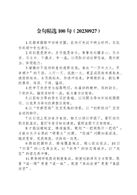 金句精选100句(20230927)1.在探索探路中突破突围,在先行先试中树立标杆,在比学赶超中争先进位。2.岗位就是使命,责任就是命令,事事处处操真心、负全责、尽全力、干满点、争一流,以实际行动诠释忠诚、展示担当、体现能力。3.增强时不我待的危机感紧迫感,拿出一万年太久,只争朝夕的干劲,人行一尺、我跑一丈,真正实现效率提起来、速度快起来、全员跑起来、加速冲起来,争做敢担当、能扛事的勇将、闯将、干将、猛将。4.把学习先进作为指路明灯,永葆拼的精神、闯的劲头、干的作风,锚定目标争一流,敢为善为求突破。5.以目标为导向管长远打基础、以问题为导向补短板强弱项、以效果为导向抓典型求突破。6.以有解思维攻坚克难的场景,以创新驱动坚实奋进的脚印。7.在行动上更加有力有效,持之以恒以学促干,紧盯岗位职责抓落实,紧盯年度目标赶进度,紧盯差距不足补短板。8.才能因地制宜、精准施策,做到一把钥匙开一把锁;才能对关乎全局的硬骨头问题、险滩问题知其深浅、晓其宽窄、究其难度,进而逐一攻克。9.精细把握特点、精准覆盖难点、精心抓出亮点。10.以归零的心态再出发,以赶考的状态再阔步,以攻坚的姿态再冲锋。11.聚焦树样板促进制度集成。制度创新涉及方方面面,既要谋一隅更要谋一域,既要单兵突进更要集团攻坚。12.大兴担当实干之风,砥砺攻坚克难之风,弘扬清正廉洁之风。13.在理论学习上下苦功,在调查研究上求突破,在推动发展上谋实招,在检视整改上见真章。14.坚持以学为先,着力在深化上下功夫,要原原本本学、联系实际学、及时跟进学,把全面学习和重点学习结合起来,增强学习的针对性,努力提高学习实效。15.坚持以思为本,着力在内化上下功夫,做到至信而深厚、融通而致用、执着而笃行,确保弄懂长知识、悟透添智慧、学深强本领,不断提高履职尽责的能力和水平,立足岗位做贡献。16.坚持以干为要,着力在转化上下功夫,做到统筹推进、奋力冲刺、提前谋划,确保学思用贯通、知信行统一。17.极富洞见的高瞻远瞩、极具深意的战略考量、极其厚重的关爱指引。18.在理论学习上要注重发挥优势、走深走实,在调查研究上要注重摸清实情、做深做细,在推动发展上要注重统筹兼顾、以学促干,在检视整改上要注重动真碰硬、真查实改,在组织领导上要注重传导压力、科学指导。19.在正视难的现实中把准干的方向,在保持进的势头中积蓄干的动能,脚踏实地,埋头苦干。20.一件接着一件办、一年接着一年抓、一任接着一任干,防止出现政绩冲动、盲目蛮干、大干快上以及换赛道做盆景留痕迹等不良现象。21.超前谋划长远事、勇于做好当下事、直面解决过去事。22.处在经济失速、发展失位、结构失衡的被动局面,面临着一退再退、退无可退的严峻形势,发展之困、积弊之重、破解之难前所未有。23.争做有理想的新时代好青年、把牢听党话跟党走的青春航向,争做敢担当的新时代好青年、展现勇挑重任的青春风貌,争做能吃苦的新时代好青年、激发矢志建功立业的青春活力,争做肯奋斗的新时代好青年、擦亮走在时代前列的青春底色。24.全面学习领会,把对标对表、紧跟追随的政治忠诚铸得更纯;广泛宣传宣讲,把直抵人心、温暖人心的生动故事讲得更深;抓好教育培训,把先行示范、善谋会干的谆谆教诲记得更牢;深入研究阐释,把登高望远、深邃浩瀚的科学理论悟得更透;坚决贯彻执行,把奋发有为、见行见效的奋进步子迈得更大。25.根本出路如何打通、鲜明标识如何擦亮、推进动力如何激发、底蕴精髓如何彰显。26.绝对忠诚、紧跟追随的方向把得更准,勇挑大梁、勇立潮头的使命扛得更牢,探路先行、实干争先的步伐迈得更大。27.增强绝对忠诚、对标看齐的政治自觉,增强真信笃行、感恩奋进的思想自觉,增强保持定力、走深走实的行动自觉,增强走在前列、示范引领的使命自觉。28.保持谦虚审慎抓落实的警醒感,善于从政治上看、大局上谋,做到自豪而不自满、昂扬而不张扬、务实而不浮躁,敢闯敢干、善谋会干、真抓实干,创造经得起历史检验、人民考验的真业绩。29.抓住突围突破求优解的牛鼻子,坚持创新破难、改革破题、开放破局,加快为大局多探新路,多出可借鉴可推广可复制的经验做法。30.保持敢闯先行的拼搏劲头、干在实处的务实作风,增强前列意识、强化前瞻思维、加快前进步伐。31.感恩奋进、再启新程的政治指引,登高望远、再创优势的战略指引,实干争先、再谱新篇的行动指引,守正创新、再燃激情的精神指引。32.敢于直面问题,不讳疾忌医、不遮掩矛盾,知不足而后进,望山远而力行。33.坚持高标定位、树牢系统观念、突出问题导向,始终将系统集成理念贯穿改革全过程,激发改革的联动效益和共生效应。34.坚定改革决心,树牢改革思维,主动求新求变,以敢字为先、以干字当