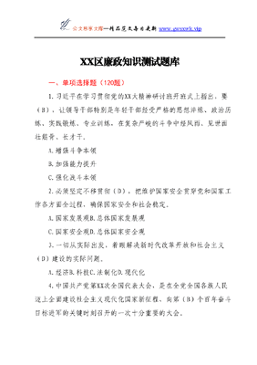 公文思享文库—精品范文每日更新 www.gwsxwk.vipXX区廉政知识测试题库一、单项选择题(120题)1.习近平在学习贯彻党的XX大精神研讨班开班式上指出,要(B),让领导干部特别是年轻干部经受严格的思想淬炼、政治历练、实践锻炼、专业训练,在复杂严峻的斗争中经风雨、见世面壮筋骨、长才干。A.增强斗争本领B.加强能力提升C.强化战斗本领2.必须坚定不移贯彻(D),把维护国家安全贯穿党和国家工作各方面全过程,确保国家安全和社会稳定。A.国家发展观B.总体国家发展观C.国家安全观D.总体国家安全观3.一切从实际出发,着眼解决新时代改革开放和社会主义(D)建设的实际问题。A.经济B.科技C.法制化D.现代化4.中国共产党第XX次全国代表大会,是在全党全国各族人民迈上全面建设社会主义现代化国家新征程、向第(B)个百年奋斗目标进军的关键时刻召开的一次十分重要的大会。公文思享文库—精品范文每日更新 www.gwsxwk.vipA.一B.二C.三D.四5.广大青年要坚定不移(B),怀抱梦想又脚踏实地。A.听党话、感党恩B.听党话、跟党走C.感党恩、跟党走D.学党史、感党恩6.中国共产党已走过(A)年奋斗历程。A.百B.九十C.八十D.七十7.(A)是全面建设社会主义现代化国家的首要任务。A.高质量发展B.高速发展C.全面发展D.科学发展8.全党同志务必不忘初心、(B),务必谦虚谨慎、艰苦奋斗务必敢于斗争、善于斗争,坚定历史自信,增强历史主动,谱写新时代中国特色社会主义更加绚丽的华章。A.继续前行B.牢记使命C.方得始终D.砥砺前行9.全方位夯实(C)根基,牢牢守住十八亿亩耕地红线。A.耕地安全B.食品安全C.粮食安全D.口粮安全10.党中央统筹(D)战略全局和(),就党和国家事业发展作出重大战略部署,团结带领全党全军全国各族人民有效应对严峻复杂的国际形势和接踵而至的巨大风险挑战,以奋发有为的精神把新时代中国特色社会主义不断推向前进。公文思享文库—精品范文每日更新 www.gwsxwk.vipA.中华民族伟大建设;全球发展新局面B.中华民族伟大发展;全球发展新形势C.中华民族伟大改革;世界发展新格局D.中华民族伟大复兴;世界百年未有之大变局11.习近平总书记在党的XX大报告中指出,我们党勇于进行理论探索和创新,以全新的视野深化对(C)的认识,取得重大理论创新成果,集中体现为新时代中国特色社会主义思想。A.中国共产党执政规律、中国特色社会主义建设规律、人类社会科学发展规律B.共产党执政规律、社会主义现代化建设规律、人类社会科学发展规律C.共产党执政规律、社会主义建设规律、人类社会发展规律12.面对突如其来的新冠肺炎疫情,我们坚持(A),坚持动态清零不动摇,开展抗击疫情人民战争、总体战、阻击战,最大限度保护了人民生命安全和身体健康,统筹疫情防控和经济社会发展取得重大积极成果。A.人民至上、生命至上B.人民为重、生命为重C.人民为本、生命至本D.人民至上、生命为本13.中国特色社会主义进入新时代,我国社会主要矛盾已经转化为人民日益增长的(D)需要和()的发展之间的矛盾。公文思享文库—精品范文每日更新 www.gwsxwk.vipA.美好生活;不充分不平衡B.幸福生活;不平衡不充分C.幸福生活;不充分不平衡D.美好生活;不平衡不充分14.我们全面加强党的领导,确保党中央权威和集中统一领导确保党发挥(C)的领导核心作用。A.统领全局、引导各方B.总领全局、协调各方C.总揽全局、协调各方D.统揽全局、领导各方15.必须认识到,我国仍处于并将长期处于(B)的基本国情没有变,我国是世界最大发展中国家的国际地位没有变。A.社会主义阶段B.社会主义初级阶段C.社会主义中级阶段D.社会主义高级阶段16.我们经过接续奋斗,实现了(B)这个中华民族的千年梦想。A.中国梦B.小康C.强国D.强军17.习近平新时代中国特色社会主义思想鲜明提出,中国特色社会主义最本质的特征是(D)。A.五位一体总体布局B.中国特色社会主义法治体系C.人民利益为根本出发点公文思享文库—精品范文每日更新 www.gwsxwk.vipD.中国共产党领导18.中国特色社会主义事业五位一体总体布局是指全面推进经济建设、政治建设、文化建设、社会建设、(B)。A.制度建设B.生态文明建设C.作风建设D.法治建设19.发展是解决我国一切问题的基础和关键,发展必须是科学发展,必须坚定不移贯彻(A)的发展理念。A.创新、协调、绿色、开放、共享B.创造、协调、生态、开放、共享C.创新、统筹、绿色、开放、共享D.创造、统筹、生态、开放、共享20.习近平总书记在党的XX大报告中指出,十八大以来,国内外形势新变化和实践新要求,迫切需要我们从理论和实践的结合上深入回答关系(A)的一系列重大时代课题。A.党和