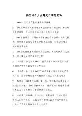 2023年7月主题党日学习资料1. XXXXXX关于主题教育重要讲话摘编2. XXX在中共中央政治局第五次集体学习时强调:加快建设教育强国 为中华民族伟大复兴提供有力支撑3. XXX主持召开二十届中央国家安全委员会第一次会议强调:加快推进国家安全体系和能力现代化 以新安全格局保障新发展格局4. XXX在文化传承发展座谈会上强调:担负起新的文化使命 努力建设中华民族现代文明5. 《求是》杂志发表XXXXXX重要文章:中国式现代化是中国共产党领导的社会主义现代化6. 《求是》杂志发表XXXXXX重要文章:健全全面从严治党体系 推动新时代党的建设新的伟大工程向纵深发展7. 蔡奇在《XXX著作选读》第一卷、第二卷出版座谈会上强调:认真学习《XXX著作选读》 持续把XXX新时代中国特色社会主义思想学习宣传贯彻引向深入8. 中央第八指导组:把准方向 同题共答 推动主题教育深入扎实开展9. 江西省学习贯彻XXX新时代中国特色社会主义思想主题教育动员大会召开10. 尹弘在《党建研究》发表文章:高标准高质量推动主题教育走深走实 凝心聚力谱写中国式现代化的江西篇章11. 尹弘主持召开省委主题教育工作座谈会时强调:紧扣主题主线 突出实际实效 推动主题教育不断向纵深发展学习贯彻XXX新时代中国特色社会主义思想主题教育重要论述摘编开展主题教育是今年党的建设的重大任务。各级党组织要坚决贯彻落实党中央的工作部署,教育引导党员、干部在以学铸魂、以学增智、以学正风、以学促干上下功夫见实效。以学铸魂,就是要做好学习贯彻新时代中国特色社会主义思想的深化、内化、转化工作,从思想上正本清源、固本培元,筑牢信仰之基、补足精神之钙、把稳思想之舵。一是坚定理想信念,增强对党的价值追求和前进方向的高度政治认同,把好世界观、人生观、价值观这个总开关。二是铸牢对党忠诚,自觉坚持党的全面领导坚定维护党中央权威和集中统一领导,不断提高政治判断力、政治领悟力、政治执行力,始终在政治立场、政治方向、政治原则、政治道路上同党中央保持高度一致,把对党忠诚体现到贯彻落实好党中央决策部署的实际行动上。三是站稳人民立场,强化宗旨意识,坚守初心使命,践行党的群众路线,把人民群众满意不满意作为评判主题教育成效的根本标准,解决好人民群众最关心最直接最现实的利益问题,把惠民生的事办实、暖民心的事办细、顺民意的事办好,让现代化建设成果更多更公平惠及全体人民。 ——4月13日,XXXXXX在广东省调研时讲话摘编加强调查研究,推动思想大解放、能力大提升、作风大转变、工作大落实要大兴调查研究之风,深入了解群众需求,切实解决广大百姓关心关切的利益问题,不断提高人民群众的获得感、幸福感、安全感。——5月10日,XXXXXX在河北雄安新区考察时讲话摘编学习贯彻新时代中国特色社会主义思想主题教育正在全党深入开展,各级党组织务必在深入、扎实上下功夫,在以学铸魂、以学增智、以学正风、以学促干上见实效。以学增智,就是要从党的科学理论中悟规律、明方向、学方法、增智慧,把看家本领、兴党本领、强国本领学到手。一要提升政治能力,善于从党和人民的立场、党和国家工作大局出发想问题、作决策、办事情,善于从繁杂问题中把握事物的规律性、从苗头问题中发现事物的趋势性、从偶然问题中认识事物的必然性,善于驾驭复杂局面、凝聚社会力量、防范政治风险,切实担负好党和人民赋予的政治责任,真正成为政治上的明白人。二要提升思维能力,把新时代中国特色社会主义思想的世界观、方法论和贯穿其中的立场观点方法转化为自己的科学思想方法,作为研究问题、解决问题的总钥匙,切实提高战略思维、辩证思维、系统思维、创新思维、历史思维、法治思维、底线思维能力,做到善于把握事物本质、把握发展规律、把握工作关键、把握政策尺度,增强工作科学性、预见性、主动性、创造性。三要提升实践能力,发扬理论联系实际的优良学风,全面把握新时代中国特色社会主义思想一系列新理念新思想新战略的实践要求,增强推动高质量发展、服务群众、防范化解风险本领,加强斗争精神和斗争本领养成,着力增强防风险、迎挑战、抗打压能力,及时填知识空白、补素质短板、强能力弱项,不断提高专业化水平。陕西要用好自身历史文化资源和红色文化资源,大力弘扬伟大建党精神和延安精神,推动主题教育走深走实。 ——5月17日,XXXXXX在陕西西安调研时讲话摘编XXXXXX的重要讲话从党和国家事业发展全局战略高度,对中华文化传承发展的一系列重大理论和现实问题作了全面系统深入阐述,具有很强的政治性、思想性、战略性、指导性。要结合正在开展的主题教育,认真组织传达学习XXXXXX重要讲话精神,更加深刻领悟两个确立的决定性意义,增强四个意识、坚定四个自信、做到两个维护。要以XXXXXX重要讲话精神为指导,不断深化对文化建设的规