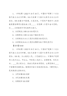 1、(单选题)2022年10月16日,中国共产党第二十次全国代表大会在京开幕。XXX代表第十九届中央委员会向大会作报告。XXX在报告中强调,从现在起,中国共产党的中心任务就是团结带领全国各族人民____、实现第二个百年奋斗目标,以____全面推进中华民族伟大复兴。A、全面建成小康社会XXX现代化B、全面建成小康社会XXX中国式现代化C、全面建成社会主义现代化强国XXX现代化D、全面建成社会主义现代化强国XXX中国式现代化【答案】XXXD2、(单选题)2022年10月16日,中国共产党第二十次全国代表大会在京开幕。XXX代表第十九届中央委员会向大会作报告。XXX说,江山就是人民,人民就是江山。中国共产党领导人民打江山、守江山,守的是人民的心。治国有常,利民为本。____是立党为公、执政为民的本质要求。必须坚持在____中保障和改善民生,鼓励共同奋斗创造美好生活,不断实现人民对美好生活的向往。A、为民造福XXX创新B、为民造福XXX发展C、发展经济XXX创新D、发展经济XXX发展【答案】XXXB3、(单选题)2022年10月16日,中国共产党第二十次全国代表大会在京开幕。XXX代表第十九届中央委员会向大会作报告。XXX在报告中指出,必须坚定历史自信、文化自信,坚持古为今用、推陈出新,把马克思主义思想精髓同____贯通起来、同____融通起来,不断赋予科学理论鲜明的中国特色,不断夯实马克思主义中国化时代化的历史基础和群众基础,让马克思主义在中国牢牢扎根。A、中华优秀传统文化精华XXX中国传统价值观念B、中华优秀传统文化精华XXX人民群众日用而不觉的共同价值观念C、中华传统文化XXX中国传统价值观念D、中华传统文化XXX人民群众日用而不觉的共同价值观念【答案】XXXB4、(单选题)2022年10月16日,中国共产党第二十次全国代表大会在京开幕。XXX代表第十九届中央委员会向大会作报告。XXX在报告中强调,办好人民满意的教育。坚持以人民为中心发展教育,加快建设高质量教育体系,发展素质教育,促进教育公平。加快义务教育优质均衡发展和城乡一体化,优化区域教育资源配置,强化学前教育、特殊教育普惠发展,坚持高中阶段学校多样化发展,完善覆盖全学段学生资助体系。推进教育____,建设____的学习型社会、学习型大国。A、科技化XXX全民学习B、科技化XXX全民终身学习C、数字化XXX全民学习D、数字化XXX全民终身学习【答案】XXXD5、(单选题)2022年10月16日,中国共产党第二十次全国代表大会在京开幕。XXX代表第十九届中央委员会向大会作报告。XXX在报告中指出,十九大以来的五年,党中央统筹中华民族伟大复兴战略全局和____,就党和国家事业发展作出重大战略部署,团结带领全党全军全国各族人民有效应对严峻复杂的国际形势和接踵而至的巨大风险挑战,以奋发有为的精神把新时代中国特色社会主义不断推向前进。五年来,我们党团结带领人民,____,推动党和国家事业取得举世瞩目的重大成就。A、世界百年未有之大变局XXX攻克了许多长期没有解决的难题,办成了许多事关长远的大事要事B、世界百年未有之大变局XXX解决了许多长期想解决而没有解决的难题,办成了许多过去想办而没有办成的大事C、四个全面战略布局XXX攻克了许多长期没有解决的难题,办成了许多事关长远的大事要事D、四个全面战略布局XXX解决了许多长期想解决而没有解决的难题,办成了许多过去想办而没有办成的大事【答案】XXXA6、(单选题)2022年10月16日,中国共产党第二十次全国代表大会在京开幕。XXX代表第十九届中央委员会向大会作报告。XXX强调,要坚持以推动____为主题,把实施扩大内需战略同深化供给侧结构性改革有机结合起来,增强____内生动力和可靠性,提升____质量和水平,加快建设现代化经济体系,着力提高全要素生产率,着力提升产业链供应链韧性和安全水平,着力推进城乡融合和区域协调发展,推动经济实现质的有效提升和量的合理增长。A、高质量发展XXX国际循环XXX国内大循环B、高质量发展XXX国内大循环XXX国际循环C、可持续发展XXX国际循环XXX国内大循环D、可持续发展XXX国内大循环XXX国际循环【答案】XXXB7、(单选题)2022年10月16日,中国共产党____全国代表大会在京开幕。XXX代表第十九届中央委员会向大会作了题为____的报告。A、第十九次XXX《决胜全面建成小康社会夺取新时代中国特色社会主义伟大胜利》B、第十九次XXX《高举中国特色社会主义伟大旗帜为全面建设社会主义现代化国家而团结奋斗》C、第二十次XXX《决胜全面建成小康社会夺取新时代中国特色社会主义伟大胜利》D、第二十次XXX《高举中国特色社会主义伟大旗帜为全面建设社会主义现代化国家而团结奋斗》【答案】XXXD8、(单选题