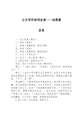 公文写作诗词宝典——治理篇目录一、民心民意(群众)二、舆论(宣传)三、困难(克服困难、解决问题)四、扶贫(民生)五、预备(忧患意识、提前谋划)六、人才(干部工作)七、奋斗一、民心民意(群众)1.人视水见形,视民知治不?出处:西汉·司马迁《史记·殷本纪》。原文:(商)汤曰:予有言:人视水见形,视民知治不?释义:人在水中可以照见自己的样子,在民众中可以看出国家治理的状况。比喻:国家治理得好不好,要看民众满不满意。不,通否。用法提示:人民常常被比作载舟的水,喻为种子生长的土壤,视为树木枝叶的根本。在公文写作中,这句话尤其适用于政府部门的公文,因为一个政策制定得好不好,一个方针执行得好不好,都要用事实来说话——而这句话,便是用来引出论据的。比如,人视水见形,视民知治不既是提醒,更是鞭策,××方针、制度、政策等试行得如何。2.虚心公听,言无逆逊,唯是之从。出处:元·脱脱、阿鲁图等《宋史·王涣之传》。原文:虚心公听,言无逆逊,唯是之从;事无今昔,唯当为贵;人无同异,唯正是用。释义:要谦虚诚心地听取公众的意见,不论言辞是逆耳的还是恭顺有礼貌的,只要是正确的都应当听从。比喻:要以虚心的态度,公正地听取不同的意见,无论是什么样的意见和建议,都要以实事求是的方法和态度去对待。用法提示:在公文写作中,这句话的站位就比较高了,而且不算易懂,属于生僻用典。比如,虚心公听,言无逆逊,唯是之从体现的正是中国共产党应有的胸襟,我们应该认真听取和积极采纳党内外人士的意见和建议。3.以人为镜,可以明得失。出处:后晋·刘昫等《旧唐书·魏徵传》。原文:夫以铜为镜,可以正衣冠;以史为镜,可以知兴替;以人为镜,可以明得失。释义:以人作为镜子,可以照出自己的优缺点与得失处。另有,北宋宋祁、欧阳修等《新唐书·魏徵传》:以人为鉴,可明得失。鉴,即镜子。这两句话的意思完全相同,只是前者常见,后者不常见。用法提示:以人为镜,(帝王)任用一个贤良的大臣来劝诫他;可以明得失,(帝王)就可以了解他所有的政策的得与失,进而去修正过失。唐太宗说他有这三面镜子,魏徵死了,也就坏了一面镜子。从这里我们也可以看出来,一个贤明的领导者一定是非常惜才、爱才的,他才能够赢得下面的人对他的信任。在公文写作中,这句话可以用在群众路线上。4.凡议国事,惟论是非,不徇好恶。出处:清·张廷玉等《明史·骆问礼传》。原文:士习倾危,稍或异同,辄加排陷。自今,凡议国事,惟论是非,不徇好恶。众人言未必得,一人言未必非,则公论日明,士气可振。释义:在讨论国事时,只根据言论的正确与否来决定,而不是根据个人的喜恶来决定。形容领导在处理大事时应该具有的一种能力,或者态度。用法提示:这是明代人骆问礼上给明穆宗朱载坖奏书中的一段文字,这封奏书在当时及其后能够引起较大反响,最主要的原因是他在奏疏中敢于讲真话,而且提倡讲真话、建诤言。在公文写作中,能用到这句话的时候太多了,比如,我国的改革已经进入深水区,广大知识分子要为国家富强、民族振兴、人民幸福多做贡献,对国家大事要树立起凡议国事,惟论是非,不徇好恶的担当精神。5.防民之口,甚于防川。出处:春秋·左丘明《国语·周语上》。原文:防民之口,甚于防川。川壅而溃,伤人必多,民亦如之。释义:阻止人民进行批评的危害,比堵塞河川引起的水患还要严重。比喻:不让人民说话,必有大害。这也是一个成语。用法提示:这是发生在西周时期的一段故事。周厉王实施暴政,任用小人,而且禁止国人批评朝政。召穆公听说了,便对周厉王说了上面那段话。但是周厉王并没有听,后来国人真的发起暴动,他则客死异乡。无论是在封建社会,还是现代社会,人民群众归根到底还是起决定性作用的。在公文写作中,这句话及其后面的故事可以作为一个反面的警醒,正面来说就是广开言路。比如,防民之口,甚于防川。历史的发展一再告诉我们:那些不把人民群众放在眼里的领导者,人民群众也不会把他们放在心里!所以我们需要听得更多、做得更好。6.古者圣人以天下之耳目为视聪,天下之心为心。出处:东汉·马融《忠经》。原文:古者圣人以天下之耳目为视聪,天下之心为心,端旒而自化,居成而不有,斯可谓至理也已矣。释义:古时候的圣人以天下所有人的所见所闻,作为自己的闻知;利用天下所有的人所想到的,作为自己所想到的。比喻:听百姓的声音,思百姓的诉求。用法提示:视聪,指的就是目耳,看到的和听到的。民主集中制是党的根本组织原则,也是群众路线在党的生活中的运用。在公文写作中,凡是涉及民主集中制、社会主义协商民主等内容的时候,都可以用到这句话。比如,古者圣人以天下之耳目为视聪,天下之心为心。我们还要继续完善社会主义协商民主制度,听民声、顺民意。7.知屋漏者在宇下,知政失者在草野。出处:东汉·王充《论衡·书解》。原