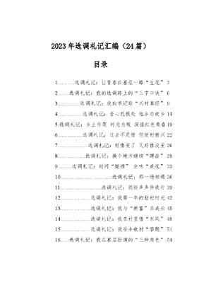 2023年选调札记汇编(24篇)目录1选调札记:让青春在基层一路生花32..选调札记:我的选调路上的三字口诀63.选调札记:我向书记取兴村真经94选调札记:吾心扎根处 他乡亦故乡145.选调札记:乡土作笔 时光为砚 深描红色青春196选调札记:过去不足惜 但使村振兴227.选调札记:好像变了 又好像没变268..选调札记:换个地方继续蹲苗299.选调札记:时间酿酒 余味成花3310..选调札记:那一场相遇3611选调札记:驼铃声声伴我行3912.选调札记:我第一年的驻村时光4213.选调札记:我与新富共成长4514.选调札记:我在村里借东风4815.选调札记:我在丰收村答题5116选调札记:我在基层扮演的三种角色5417选调手札:大山深处有余音5718.选调札记:我在基层品味苦辣酸甜6119..选调札记:一场慕光之旅6320.选调札记:雨季正是插秧时6521.选调札记:在村做网格员的日子6822驻村札记:旅途近半 小得盈满7223..驻村札记:且听五心xx的故事75驻村札记:且听五心团结的故事78选调札记:让青春在基层一路生花蝉鸣始,半夏生。蝉鸣声声,稻浪涟漪,夏天的脚步已悄然而至。不知不觉,这已是到村任职的第二个夏天。从新增耕地到撂荒地整治,从合医征收到信访化解,桩桩件件让我对金鸡村的村情民意有了更多的了解,对这里的淳朴民风、乡土人情亦有了更深厚的感情。两年来,脚踏泥土芬芳,眼观农村百态,手绘选调笔记,我在基层经风雨、见世面、壮筋骨、长才干,青春之花在火热实践中尽情绽放。知全貌,辨症结,以庖丁解牛之韧劲攻坚克难,让拼搏之花在基层恣意绽放。志不求易者成,事不避难者进,一茬接一茬的工作编织出驻村好光景。前不久,村里在开展撂荒地整治时遇到难题,在这36平方公里的土地上,需要整治的地块之多、分散之广,让村里干部一时抓耳挠腮。高温中、烈日下、风雨里,手持平板电脑的我与村干部们奔波在田间地头、大山深处,对这32个地块逐一实地查看,做到胸中有数,清晰找出症结,逐个攻破难题。不断增加的汽车里程数、日渐黝黑的皮肤、沾满泥土的运动鞋见证着我的成长。看到绿油油的庄稼从地里探出脑袋,所有的疲惫都烟消云散,取而代之的是满满的成就感。我的青春之花在知难而进、迎难而上中悄然绽放。暖民心,送服务,以时不我待之紧迫排忧解难,让奉献之花在基层傲然挺立。但愿苍生俱饱暖,不辞辛苦出山林,一件件利民小事汇聚成驻村的珍贵记忆。小宋书记,我家的灯一闪一闪的,我也不晓得哪里出了问题,你能帮忙处理吗?组里唐大娘着急忙慌打来电话。唐大娘今年七十多岁,儿子在外务工,她独自居住在老家的木房,每次下组,我都会去家里看看她。我立即与供电所的同事一道去现场查看,经过排查,立马进行了维修。灯再次亮起的时候,唐大娘悬着的心才放下来,她紧握着我的双手连连道谢……些小吾曹州县吏,一枝一叶总关情,一滴水可以折射出太阳的光辉,一桩桩平凡的小事亦可温暖群众的心。我的青春之花在问需于民、问计于民、解民之忧中愈发绚烂。聚合力,破难题,以解剖麻雀之细腻寻根问脉,让实干之花在基层自由舒展。千淘万漉虽辛苦,吹尽狂沙始到金,在基层啃下的每一块硬骨头都是人生的宝贵财富。六井组是我在村里的包保联系组。今年四月,河道治理项目顺利在本组区域内启动。随着时间推移,农忙季节拉开序幕,河道治理与栽秧育苗形成明显冲突,河道拓宽与占地平衡矛盾凸显,组里群众反映问题接踵而至,如何有效化解纠纷是摆在我面前的一大难题。一开始我恰似丈二和尚,完全摸不着头脑。我便主动向村里的老同志们请教学习,经常去到组里刨根问底,摸清问题的来龙去脉,在你来我往一来二去的积累中,新老同志齐上阵,问题得到了有效解决