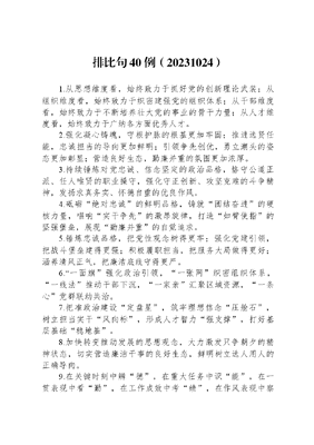 排比句40例(20231024)1.从思想维度看,始终致力于抓好党的创新理论武装;从组织维度看,始终致力于织密建强党的组织体系;从干部维度看,始终致力于不断培养壮大党的事业的骨干力量;从人才维度看,始终致力于广纳各方面优秀人才。2.强化凝心铸魂,守根护脉的根基更加牢固;推进选贤任能,忠诚担当的导向更加鲜明;引领争先创优,勇立潮头的姿态更加彰显;营造良好生态,勤廉并重的氛围更加浓厚。3.持续锤炼对党忠诚、信念坚定的政治品格,恪守公道正派、任人唯贤的职业操守,强化守正创新、攻坚克难的斗争精神,发扬求真务实、怀德自重的优良作风。4.砥砺绝对忠诚的鲜明品格,铸就团结奋进的硬核力量,唱响实干争先的激昂旋律,打造如臂使指的坚强堡垒,展现勤廉并重的自觉追求。5.锤炼忠诚品格,把党性观念树得更牢;强化党建引领,把战斗堡垒建得更强;积极履职担当,把服务大局做得更好;涵养清风正气,把廉洁底线守得更严。6.一面旗强化政治引领,一张网织密组织体系,一线法推动干部下沉,一家亲汇聚区域资源,一条心党群联动共治。7.把准政治建设定盘星,筑牢理想信念压舱石,树立担当实干风向标,形成人才智力强支撑,打好基层基础稳地基。8.加快转变推动发展的思想观念,大力激发只争朝夕的精神状态,切实营造廉洁干事的良好生态,鲜明树立选人用人的正确导向。9.在关键时刻中辨德,在重大任务中识能,在一贯表现中看勤,在工作成效中考绩,在作风表现中察廉。10.进一步端正思想态度,做到德配其位;进一步强化责任担当,做到善做善成;进一步优化考核制度,做到奖惩分明。11.政治忠诚展现新担当,大战大考干出新业绩,强根壮脉形成新格局,引才聚智取得新突破,制度赋能激发新活力。12.打好齐心协力的团结牌,筑牢全面过硬的基础桩,树立激励担当的正导向,用好见效于干的务实招。13.把实干挑担者用起来,把考核指挥棒立起来,把先进光荣榜亮出来,把关爱硬举措做到位。14.以理论武装铸牢忠诚之魂,以队伍建设聚合干事之力,以人才集聚提升创新之能,以建强组织稳固治理之本。15.既看一时更看一贯,既看当前又看长远,既看显绩又看潜绩,既重面子更重里子,既看发展又看基础。16.把讲政治作为首位要求,把重公道作为立身之本,把业务精作为不懈追求,把作风好作为基本底线。17.选人用人要匡正公正风向标,引才聚才要构建务实强磁场,基层党建要跑出创新加速度。18.党建引领再加强,思路理念再创新,平台载体再提升,制度机制再完善,精神状态再提振。19.凭实干实绩决定该用谁,以事业为上决定用到哪,看争先劲头决定何时用。20.争当对党忠诚的先锋模范,争当干事创业的先锋模范,争当严于律己的先锋模范。21.高质量的组织覆盖,高素质的骨干队伍,高水平的作用发挥,高效率的制度机制。22.上下联动的协同力,党群同心的奔赴力,考核激励的带动力,实干争先的爆发力。23.打造堪当重任的骨干队伍,锻造坚强有力的组织体系,营造近悦远来的人才环境。24.铸牢忠诚之魂,秉持公道之心,提升识人之能,弘扬务实之风,涵养清廉之气。25.把好干部选出来用起来,把精气神聚起来提起来,把关心关爱实起来暖起来。26.打造过硬队伍上出实招,夯实基层基础上破难题,锤炼严实作风上下真功。27.用思想塑造干部,以事业激励干部,拿奖惩鞭策干部,凭情感凝聚干部。28.政治建部增定力,能力立部提本领,制度管部优作风,文化兴部活氛围。29.坚持一盘棋,打好组合拳,锻造铁肩膀,提振精气神。30.打好干群同心结,织就人民幸福图,当好基层绣花针。31.组织建在链上,队伍聚在链上,服务抓在链上。32.拓宽上的平台,打开让的通道,畅通下的渠道。33.敲响了定音鼓,吃下了定心丸,注入了强心剂。34.向中心任务聚焦,向瓶颈制约聚力,向民生改善聚心。35.坚持原则不动摇,执行标准不走样,履行程序不变通。36.不换思想就换人,态度不正就挪窝,能力不够就让位。37.向新兴地带进军,向基层末梢延伸,向网络空间拓展。38.树好风向标,备好加油包,用好练兵场。39.有底线的包容,有强度的激励,有温度的关爱。40.党旗飘在一线,堡垒筑在一线,党员冲在一线。41.全面汇聚百二秦关终属楚,三千越甲可吞吴的磅礴气势,全面发起马作的卢飞快,弓如霹雳弦惊的迅猛攻势,全面展现狭路相逢勇者胜、越是艰险越向前的强劲态势。42.架势大,抢抓主动开新局;架势小,犹豫徘徊被出局;声势起,突破突围干大事;声势衰,畏首畏尾失良机;气势强,一气呵成干到底;气势弱,一事无成摆摊子。43.放大忠诚核心、紧跟党走的政治优势,塑造提质提效、共