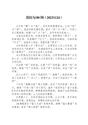 排比句80例(20231124)1.守住根与魂,坚定科技报国信念;认清时与势,抢抓创新发展机遇;提升质与效,巩固人才汇聚胜势;把握本与旨,坚守科技为民初心。2.突出改革引领,坚持发展导向、革新理念聚才,坚持高端引领、开放胸怀引才,坚持松绑赋能、创新机制兴才,坚持同心同向、真情实意爱才。3.打造创新人才蓄水池、在高层次人才上求突破,打造科技攻关新高地、在高能级平台上求突破,打造成果转化集聚区、在标志性成果上求突破。4.以更高站位打造区域人才高地,以更宽视野集聚广泛优秀人才,以更活思路创新人才发展体系,以更优生态实现人才近悦远来。5.坚持选的标准,注重用的质量,强化培的效果,畅通引的渠道,打通晋的通道,创优留的环境。6.以上率下,形成了双招双引一盘棋;抢抓机遇,形成了双招双引一条心;搭建平台,形成了双招双引一张网。7.拓宽慧眼识珠辨才视野,落实求贤若渴聚才良方,锤炼不拘一格用才胆识,涵养视若珍宝留才诚意。8.处处礼敬的尊崇感,事事高效的便捷感,满满可及的预期感,时时顺心的舒适感,人人向往的归属感。9.尊重人才、求贤若渴的社会环境,公正平等、竞争择优的制度环境,待遇适当、保障有力的生活环境。10.增强落实国之大者的使命感,保障国之重器的自豪感,服务国之栋梁的责任感。11.高能级人才集聚平台,高层次人才雁阵格局,高效能人才体制机制,高品质人才服务体系。12.用简政放权破解人才发展束缚,用减压松绑释放人才活力,用激励和服务换取人才倾心。13.为项目管理放权,为经费管理松绑,为人才流动清障,为科研评价减负。14.实施靶向引才策略,搭建闭环育才平台,探索多元用才模式,构筑拴心留才环境。15.加大引才力度,做实育才工作,搭建聚才平台,创新用才方式。16.拓宽视野广聚高端型人才,紧贴实际广聚应用型人才,面向市场广聚专业型人才。17.建设诚心待才平台,拿出真心引才诚意,保持悉心育才定力,营造实心爱才氛围。18.搭建一流创新平台,培育一流创新主体,汇聚一流创新人才,建设一流创新生态。19.聚焦发展需要引进人才,着眼长远自主培养人才,多措并举用好用活人才。20.明白人才工作的重要性,清楚人才工作的紧迫性,了解人才工作的特殊性。21.用事业造就人才,用环境凝聚人才,用机制激励人才,用法治保障人才。22.人才队伍支撑力,人才平台牵引力,人才制度竞争力,人才生态吸引力。23.真金白银的政策,真抓实干的举措,真心实意的情怀,真情服务的自觉。24.在思想上真重视,在感情上真贴近,在政策上真落实,在服务上真提升。25.攻关攻坚的桥头堡,引才育才的磁力场,转移转化的加速器。26.高层次谋划人才战略,高精度储备人才队伍,全方位畅通引才渠道。27.打造人才引育强磁场,破解人才政策中梗阻,创优人才环境生态圈。28.以需求导向引才育才,以发展思维留才用才,以品牌理念爱才聚才。29.以用户思维识才用才,以链式思维引才育才,以项目思维活才留才。30.建强战略人才队伍,打造一流人才平台,优化人才发展生态。31.真心实意服务人才,真金白银支持人才,真抓实干成就人才。32.崇高的事业留人,优惠的政策留人,有吸引力的待遇留人。33.人才汇聚新高地,人才创新优选地,人才活力迸发地。34.干事有平台,发展有空间,生活有品质,内心有归属。35.事业就是感召力,环境就是吸引力,服务就是凝聚力。36.精准招引新变量,用好招引新打法,增创招引新优势。37.栽好梧桐树,递好橄榄枝,打好感情牌。38.广发求贤帖,寻觅揭榜人,攻克技术关。39.人才集聚之地,人才辈出之地,人才向往之地。40.职业幸福感,岗位获得感,社会荣誉感。41.强化凝心铸魂,守根护脉的根基更加牢固;推进选贤任能,忠诚担当的导向更加鲜明;引领争先创优,勇立潮头的姿态更加彰显;营造良好生态,勤廉并重的氛围更加浓厚。42.要更加注重学习,拓展理论学习深度;要更加注重调研,加快成果转化速度;要更加注重实干,加大推动发展力度;要更加注重检视,增大问题整改强度。43.以更高站位打造区域人才高地,以更宽视野集聚广泛优秀人才,以更活思路创新人才发展体系,以更优生态实现人才近悦远来。44.理论武装更加扎实有力,干部队伍更加奋发有为,人才支撑更加融合有效,组织体系更加严密有序,党员队伍更加管理有方。45.以更实作风聚力攻坚,以更高效率前推项目,以更优服务保障生产,以更大力度优化环境,以更强责任守牢底线。46.绝对忠诚、紧跟追随的方向把得更准,勇挑大梁、勇立潮头的使命扛得更牢,探路先行、实干争先的步伐迈得更大。47.更拼的干劲促进经济增长,更高的标准优化营商环境,