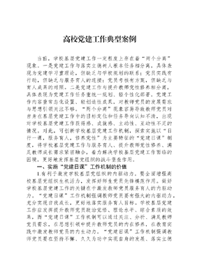 高校党建工作典型案例当前,学校基层党建工作一定程度上存在着两个分离现象。一是党建工作与落实立德树人根本任务相分离,具体表现为党建学习重理论,但缺乏与学校规划的联系;党员实践有行动,但缺乏与服务育人的连接;党员考核有方案,但缺乏与育人成果的对照。二是党建工作与提升教师党性修养相分离,具体表现为党建工作任务重统一规划、轻个性化部署,党建工作内容重常态化设置、轻创造性成果,对教师党员的发展需求与思想引领关注不够。两个分离现象容易导致教师党员对自身在基层党建工作中的目标定位和任务导向认知不清,出现对学校基层党建工作获得感、成就感、主动性、互动性不足的情况。对此,可创新学校基层党建工作机制,探索实施以日行一课,服务育人,修养党性为主要特征的党建日课制度,将学校基层党建工作与服务育人、提升教师党性修养、满足教师成长需求紧密融合,着力解决学校基层党建工作面临的困境,更好地发挥基层党组织的战斗堡垒作用。一、实施党建日课工作机制的价值1.有利于激发学校基层党组织的内驱动力。要全面增强高校基层党组织生机活力,发挥好师生党员先锋模范作用。做好学校基层党建工作的关键在于激发教师党员服务育人的内驱动力。党建日课工作机制强调教师党员要有强大的内驱动力,充分实现自我成长,更好地落实服务育人目标。学校基层党建工作应发挥提升教师党员政治觉悟、理论水平、综合素质的效果,而党建日课工作机制可以通过关注、分析、满足教师党员需求,在思想引领中提升教师党员的内在修养,在教育实践中激发教师党员的内生动力。党建日课工作机制强调教师党员要在坚持不懈、久久为功中实现自身的发展、落实立德树人根本任务。2.有利于汇聚学校基层党建工作的强大合力。就学校基层党建工作实际而言,教师党员实现个人成长的需求是客观存在的,包括更高的思想境界、更好的精神面貌、更浓的学习风气、更强的工作能力等,对这些内在需求的满足能够更好地凝聚教师党员力量。为此,学校基层党组织在联系服务群众上要多用情,在宣传教育群众上要多用心,在组织凝聚群众上要多用力,把广大党员、教职工有效组织起来、凝聚起来,形成学校党建工作的强大合力。党建日课工作机制跳出了常规的工作思维,找准了基层党建工作的着力点,激发了教师党员为党育人、为国育才的内驱动力。学校党组织依托学做悟晒工作机制,可以有效激发教师党员投身服务育人工作的积极性,凝聚起教师党员的服务育人合力,从而更好地解决学校基层党建工作面临的困难。3.有利于实现党建工作与业务工作的深度融合。党建日课工作机制通过运用结构化思维模式、创新组织形式等方式,融合各类党建和育人工作,在实践中通过学做悟晒等方法整合与优化党建工作路径,将政治理论学习与教书育人实践相融合,将党性修养提升与服务育人相融合,有效解决了基层党建工作中存在的问题。党建日课工作机制借助结构化思维模式,在实际操作中分任务、分角色、分岗位、分时段进行工作安排,为培育时代新人发挥了筑牢根基的作用。二、实施党建日课工作机制的路径1.学为基础,在学习中提升素养。学校基层党组织要通过党建日课工作机制筑牢理论学习根基。当下,学习贯彻党的XX大精神是全国各级党组织的首要政治任务,各级基层党组织要按照学习领会党的XX大精神,必须坚持全面准确,深入理解内涵,精准把握外延的要求,深入学习领会党的XX大精神,并在实践中认真落实、扎实推进,将党的XX大精神融入学校各项工作之中,创新学习载体、学习方式、学习手段,切实提升学习效果。第一,日课式学习。党建日课工作机制倡导自主学习、自觉学习、自悟学习的三自学习方式。为实现学习的持续化和常态化,教师党员在日常工作中要因势学习党的XX大精神、因时学习新课程标准、因事学习党建规范化建设;学校基层党组织需从培养教师党员的每日习惯出发,以每日学习和自主学习为基本要求,建立读书运动日课群,每日开展学术文章分享、理论学习打卡、学习监督等,以此来养成教师党员的每日习惯。此外,学校还要通过多种方式完善考核评价机制,将日课学习情况作为重要指标纳入学期工作考核;在日常会议、新闻报道中广泛宣传日课学习模式,扩大日课学习模式的影响力,使日课学习成为学校党建文化的一部分,促进教师党员自主学习。第二,项目式学习。XXXXXX指出:系统观念是具有基础性的思想和工作方法。运用项目式学习方式,可建立系统的党建日课学习内容体系,优化整合理论学习内容,从而避免无目的、散乱式、随意性的学习,增强学习效果。例如,学校在开展党史学习教育的过程中,可参照学史明理、学史增信、学史崇德、学史力行的目标要求,结合基层党建工作实际和学校工作需求,确定各单元的学习主题,并分别落实到每个学习小组开展学习、总结与集体交流。第三,情境式学习。知与行是交互的,知识是情境化
