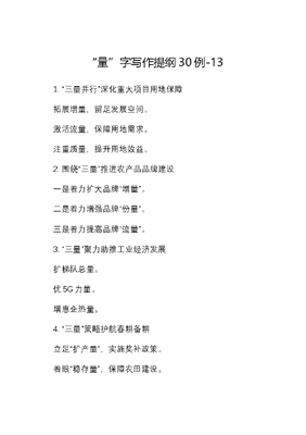 量字写作提纲30例-131. 三量并行深化重大项目用地保障拓展增量,留足发展空间。激活流量,保障用地需求。注重质量,提升用地效益。2. 围绕三量推进农产品品牌建设一是着力扩大品牌增量。二是着力增强品牌份量。三是着力提高品牌流量。3. 三量聚力助推工业经济发展扩梯队总量。优5G力量。增惠企热量。4. 三量策略护航春耕备耕立足扩产量,实施奖补政策。着眼稳存量,保障农田建设。聚力提质量,支持科技兴农。5. 着力三精三量,助推乡村人才振兴精准引才,扩大人才总量。精细育才,优化人才质量。精心留才,拴住人才流量。6. 三量并举强化专职调解员队伍建设一是提高存量,充实专职调解员队伍。二是注重质量,提升专职调解员素养。三是凝聚力量,增强专职调解员合力。7. 扎实三量抓好议事协调机构清理精简全面清理减存量,解决数量过多问题。严格打表设增量,解决审批不严问题。建章立制抓丈量,解决长效管理问题。8. 三量并举推动渔船减船转产转业一是优存量,有序引导减船。二是扩增量,有力引导创业。三是抓变量,有效引导就业。9. 三量并举增强社会保险扶贫实效应保尽保去存量。应缴尽缴提增量。应发尽发保质量。10. 立足三量强化土地要素保障用足增量,保障重点项目用地需求优化存量,提高土地集约利用水平。激活流量,科学统筹城乡协调发展。11. 严管三量市场监管分局深入开展经营性自建房安全隐患整治工作开展全面排查,消除存量隐患。创新登记注册,严控增量风险。建立长效机制,降低变量影响。12. 三引三量推进乡村振兴产才融合发展以产引才,扩大人才增量。以才引智,深挖人才存量。以智引产,做优人才变量。13. 三量推动工业经济提质扩量增效做优存量。统筹变量。提升质量。14. 三聚焦写好人才三量新篇章聚焦全方位引才,做大人才总量。聚焦全链条育才,激发人才能量。聚焦全身心留才,拴住人才流量。15. 三量工作互为促进盘活存量,提高国有资产资源配置效率培育增量,引育新的增长点和市场主体提升质量,练好国资国企高质量发展内功16. 三量工作法托起群众稳稳的幸福化解存量,破除群众关切难点防治变量,整治群众关心痛点消减增量,打通群众关注堵点17. 围绕三量推进农产品品牌建设一是着力扩大品牌增量。二是着力增强品牌份量。三是着力提高品牌流量。18. 紧盯三期工程 做优市场主体三量服务一是紧盯出生期工程,优化引增量服务。二是紧盯成长期工程,优化稳存量服务。三是紧盯成熟期工程,优化壮体量服务。19. 脱贫攻坚与乡村振兴衔接要紧盯四量防变量,实施贫困人口动态监测。稳存量,保证成功经验有效传递。提质量,助推产业发展换档升级。蓄能量,深化体制机制改革创新。20. 四量做法提升调解质效统筹指导解难题破困局提质量推动非诉方式解决矛盾纠纷去存量全面搭建多元解纷新平台控增量深度参与基层社会治理防变量21. 基层社会治理要用好四量治理体制上要用活存量治理机制上要用够增量治理手段上要用好变量治理动力上要用足能量22. 严格落实四量要求推进纪检监察信访举报最多访一次以不信不访为导向,关口前置遏增量以息信息访为要求,班组协作减存量以少信少访为目标,信息提速增流量以一信一访为标准,规范流程提质量23. 坚持党建引领 用好四量措施坚持党建引领,充分发挥体制在基层社会治理上的存量优势强化周期治理,充分挖掘机制在基层社会治理上的增量效益依托智慧治理,充分激活科技在基层社会治理上的变量效应坚持共建共治共享,充分激发群众在基层社会治理上的能量动力24. 做实四量文章为乡村振兴注入人才活水一是引才聚智扩体量,凝聚乡村振兴新合力。二是育才凝力补能量,增强乡村振兴新动力。三是依事择才提质量,挖掘乡村振兴新潜力。四是拴心留才稳存量,激发乡村振兴新活力。25. 以四量为保障促进乡村振兴建设法治宣传阵地有数量。开创法治宣传活动有质量。助推法治乡村建设有分量。化解乡村法律矛盾有衡量。26. 探索经济数字化四量转型示范路径存量增效增量创新流量赋能质量引领27. 四量共管深化机构编制资源供给侧改革一是严控机构编制总量。二是盘活机构编制存量。三是用好机构编制分量。四是创新机构编制增量。28. 四量并举做好产业转型大文章第一个量,就是抓存量变革第二个量,就是抓增量崛起第三个量,就是抓扩量提质第四个量,就是抓变量突破,29. 四化促四量以人才振兴推进乡村振兴坚持系统化培育,人才质量加快提升坚持精准化引进,人才总量稳