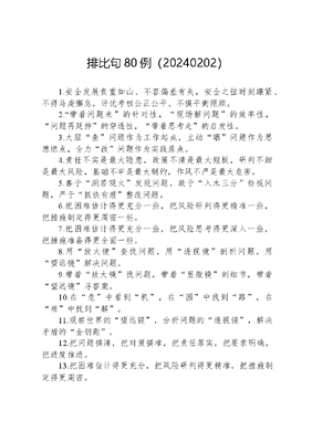 排比句80例(20240202)1.安全发展责重如山、不容偏差有失,安全之弦时刻绷紧、不得马虎懈怠,评优考核公正公平、不搞平衡照顾。2.带着问题来的针对性,现场解问题的效率性,问题再延伸的穿透性,带着思考走的启发性。3.大胆查问题作为工作起点,主动晒问题作为思想燃点,全力改问题作为实践落点。4.责任不实是最大隐患,政策不清是最大短板,研判不细是最大风险,基础不牢是最大制约,作风不严是最大危害。5.善于洞若观火发现问题,敢于入木三分检视问题,严于抓铁有痕整改问题。6.把困难估计得更充分一些,把风险研判得更精准一些,把措施制定得更周密一些。7.把困难估计得更充分一些,把风险思考得更深入一些,把措施准备得更全面一些。8.用放大镜查找问题,用透视镜剖析问题,用望远镜解决问题。9.带着放大镜找问题,带着显微镜剖细节,带着望远镜寻答案。10.在危中看到机,在困中找到路,在难中找到解。11.观察世界的望远镜,分析问题的透视镜,解决矛盾的金钥匙。12.把问题搞清,把对策搞准,把责任落实,把要求明确,把进度推进。13.把困难估计得更充分,把风险研判得更精准,把措施制定得更周密。14.谨防盲目乐观,摆脱路径依赖,打破思维定式,防止政绩冲动。15.具体问题具体分析,具体情况具体应对,具体矛盾具体化解。16.善于观察发现问题,勤于思考分析问题,找到症结破解问题。17.认识问题才站得高,分析问题才看得深,开展工作才把得准。18.从承平中预见危机,从顺境中发现隐患,从机遇中看到挑战。19.重担在肩的责任感,功成有我的使命感,时不我待的紧迫感。20.精细化诊断问题,精确化分析问题,精准化解决问题。21.梳理问题的准度,剖析问题的深度,整改问题的力度。22.居安思危的警觉,如履薄冰的谨慎,见叶知秋的敏锐。23.聚焦问题找答案,紧盯问题找出路,针对问题找方法。24.提高风险洞察力,提高矛盾吸附力,提高应急处置力。25.如履薄冰的谨慎,居安思危的忧患,见叶知秋的敏锐。26.复杂问题不能躲,遗留问题不能推,惯性问题不能怕。27.研究新情况,解决新问题,总结新经验,探索新规律。28.风险面前不畏缩,困难面前不逃避,挫折面前不气馁。29.发现问题准,分析问题透,解决问题实。30.攻克发展难点,破解民生痛点,打造治理亮点。31.认清安全之重,守住安全之底,尽好安全之责。32.风险不会消失,挑战不会暂停,变局仍会演进。33.紧盯要害部位,紧抓主要矛盾,扭住关键环节。34.避免短板,克服断层,预防掉链。35.先天的不足,成长的烦恼,转型的阵痛。36.向问题聚焦,向纵深推进,向落实求效。37.奔着问题去,带着问题学,对着问题改。38.体制性障碍,机制性梗阻,制度性漏洞。39.瞄着问题去,追着问题走,盯着问题改。40.问题的解决,矛盾的化解,长板的锻造。41.不能做太阳,就当最好的行星;不能做大海,就当最好的河流;不能做船长,就当最好的水手;不能做元帅,就当最好的士兵。42.用好政治生活大熔炉,树正选人用人风向标,突出正风肃纪主抓手,培优社会风气大环境。43.提高对标对表执行力,明确统揽统筹总抓手,练就善作善战真本领,弘扬团结奋斗主旋律。44.守住第一次、警惕每一次,管好身边人、约束一家人,净化朋友圈、远离围猎圈。45.亮出在状态的面貌,鼓起勇担当的劲头,树立下深水的导向,锤炼钉钉子的作风。46.人民群众的代言人,改革发展的实践者,担当善为的排头兵,大会精神的宣传员。47.驱动发展的金宝贝,展示形象的金名片,传播名声的金话筒,用心呵护的金凤凰。48.在突破困难瓶颈中补齐短板,在抢抓发展机遇中锻造新板,在严实纪律作风中加固底板。49.当好促进发展的智囊团,当好推动落实的监督员,当好服务群众的贴心人。50.营商环境的磁场效应,招商引资的杠杆效应,内外循环的聚变效应。51.对标对表厘清任务书,破题攻坚拿出杀手锏,把准航向紧跟指南针。52.抓住稳主体的牛鼻子,把牢稳就业的定盘星,兜住稳民生的压舱石。53.跑出招商引资加速度,按下项目建设快进键,抢占产业发展新赛道。54.跑出招商引资加速度,按下项目建设快进键,抢占产业发展新赛道。55.以思想铸魂学出活头脑,以组织塑形挺起硬脊梁,以实干赋能练就铁肩膀。56.用广角镜识别干部,用显微镜考察干部,用多棱镜评价干部。57.排头兵身姿更挺拔,领头羊步伐更稳健,火车头动能更强劲。58.绝对忠诚的政治账,量质齐升的经济账,为