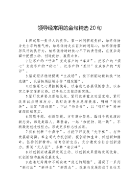 领导经常用的金句精选20句1.担起第一责任人的责任,第一时间担起责任,始终保持身先士卒的精气神,始终保持走在前列的进取心,始终保持雷厉风行的执行力,始终保持时时放心不下的责任感,在复杂局面中把握主动、创造优势、赢得未来。2.让客户的呼声变成客户的掌声,把客户的烦心变成客户的舒心,把客户的差评变成客户的好评。3.锚定经济稳进提质主战场,按下新旧动能转换快进键,巩固拓展区域合作朋友圈。4.以感恩之心勇担新使命,以奋进之姿展现新作为,以务实之举发挥新优势,以争先之志推动新实践。5.紧盯改革要点落地见效、紧盯改革重点攻坚克难、紧盯改革试点精准发力、紧盯改革亮点总结提炼,明确时间表,划定路线图,下达任务书,以钉钉子精神谋深抓细落实。6.同质考题,创新答题,方有高分答卷。面对千帆竞渡的新态势,都是赶路人、攀登者,一起加把劲、跳一跳,不断激发创造性张力,形成更多标志性成果。7.抓住创新牛鼻子,才能下好发展先手棋、打开发展新局面。举全司之力抓创新,视创新如生命、抓创新如拼命,弘扬创新精神,培育创新生态,充分激发全社会创新活力,勇闯无人区、多攀凌云峰。8.以创新突破赢得发展主动、以创新成果塑造发展优势、以创新驱动赢得发展未来。9.在追赶跨越中不断突破成长的烦恼,涌现了一系列新打法新样本新理念,改革与发展形成了良性互动。10.以问题为导向、以发展为目的,既要做好顶层设计、系统谋划,更要脚踏实地、担当作为,避免零敲碎打、修修补补。11.保持思想定力,把握战略主动,在探索实践中继续争先创优,在创新深化、改革攻坚、开放提升中跑出加速度。12.与时俱进,开辟学思践悟新境界,持续在思维观念上破冰、在堵点难点上破局、在体制机制上破题、在能力素质上破圈,全面激发活力、增添动力、提升创新力竞争力。13.非常之时要担非常之责、展现非常之为。保持头脑清醒,贴着大地思考。14.立场观点方法落到每一项决策部署中、每一次改革攻坚中、每一个项目推进中,涵养敢为、敢闯、敢干、敢首创的精气神,不断走出工作上的舒适区、突破发展上的天花板,用一流担当、一流作风干出一流业绩。15.激发克难攻坚的昂扬斗志,掀起改革创新的强大声势。16.永葆思想纯洁,一以贯之践嘱托;永怀感恩之心,一心一意谋发展。17.冷静看待成绩、理性判断形势、辩证分析困难、科学把握趋势。18.永葆思想纯洁、感恩奋进的再动员,提振发展信心、追赶跨越的再鞭策。19.跨越时空,照亮我们前行之路的是思想指引;立足当下,支撑我们发展信心的是真理伟力。20.在困难面前比别人更拼命、付出更多,比别人更快地破难、破更多的难,才有可能缩小差距、后来居上。足以震撼全场的金句精选20句21.绝对服从的思想品格十分鲜明,奋勇争先的工作实绩非常亮眼,勇立潮头的精神追求格外强烈,真抓实干的严实作风催人奋进。22.开出了高举旗帜、凝心铸魂的好效果,开出了团结民主、群策群力的好氛围,开出了实干笃行、奋勇争先的好气象。23.爬坡过坎的蝶变历程,必须提质增能、激发活力,始终把创新作为第一动力,用好改革开放关键一招,以硬功夫践行硬道理,以跨栏跑提升加速度。24.绷紧安全之弦,牢记盲目乐观要不得、麻痹侥幸要不得、守土无方要不得,增强底线思维、极限思维,保持十足清醒、百倍警醒。25.增强了提高站位、凝心铸魂的新自觉,彰显了服务大局、履职尽责的新担当,打造了建章立制、塑造特色的新成果,展现了奋勇争先、追求卓越的新气象。26.集智添力扬优势,增强研究分析穿透力、拓展协商议事纵深度、提升集团监督有效性。27.思路决定出路,只要有思路、就不怕没出路;眼界决定境界,只要有眼界、就不怕没境界;作为决定地位,只要有作为、就不怕没地位;心态决定状态,只要想干事、就不怕不成事。28.理想愿望再高远,不懈奋斗,就会逐步接近;目标目的再接近,不去努力,也将咫尺千里。29.以雷厉风行、精准到位的爆发力抓执行,以踏石留印、抓铁有痕的穿透力抓落实,以锲而不舍、驰而不息的忍耐力抓攻坚。30.只有在千帆竞发、百舸争流中奋勇争先,才能保持状态、永不掉队;只有在勇攀高峰、挑战极限中全力冲刺,才能再创佳绩、不负时代。31.围绕中心服务大局有志有为,聚焦集团之大者建言资政、聚焦发展之大计出谋划策、聚焦公司之大事献计出力、聚焦客户之所盼履职尽责。32.见贤思齐、崇德向善,让最美行为成为一种风尚,营造处处见最美、行行有最美、人人尚最美浓厚氛围。33.抓紧每一天、干好每件事,迈开步子不停步、抓住机遇跨大步。34.鼓足开局就要奔跑、起步就要跃进的气势攻坚破难,拿出此时不拼更待何时的劲头大干快上。35.实现经济承压攀升、发