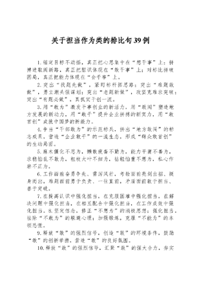 关于担当作为类的排比句39例1.锚定目标不动摇,真正把心思集中在想干事上;拼搏进取闯新路,真正把胆识体现在敢干事上;对标比拼破困局,真正把能力体现在会干事上。2.突出找题先做,紧盯标杆拓思路;突出难题敢做,勇立潮头强谋划;突出老题新做,攻坚克难求突破;突出有题必做,真抓实干创一流。3.用敢为激发干事创业的新活力,用敢闯塑造地方发展的新动力,用敢干提升企业拼搏的新实力,用敢首创成就中国梦的新能力。4.争当干部敢为的示范标兵,拼出地方敢闯的标志成果,营造企业敢干的一流生态,形成群众敢首创的生动局面。5.麻木僵化不思为,懒散疲沓不勤为,能力平庸不善为,求稳怕乱不敢为,粗枝大叶不细为,拈轻怕重不想为,私心作祟不正为。6.工作面前奋勇争先、雷厉风行,考验面前亮剑出招、挺身而出,难题面前勇于负责、一往直前,矛盾面前敢于担当、善于突破。7.在提高认识中强化担当,在克服困难中强化担当,在解决问题中强化担当,在相互配合中强化担当,在工作成效中强化担当。8.坚定信念,修正不想为的消极思想;强化担当,祛除不敢为的躲避心理;加强锻炼,克服不能为的本领恐慌。9.释放敢的强烈信号,创造敢的环境条件,鼓励敢的创新举措,营造敢的良好氛围。10.释放敢的强烈信号,汇聚敢的强大合力,夯实敢的有力支撑,树牢敢的鲜明导向。11.以敢干敢闯砥砺初心使命,以敢做敢想厚植干事能力,以敢为敢当淬炼责任担当。12.在大是大非面前可不可亮剑,在大风大浪中能不能挺身,在急难险重任务中敢不敢冲锋。13.修正不想为的消极思想,祛除不敢为的躲避心理,克服不能为的本领恐慌。14.在推动经济发展上敢干敢闯,在争创特色优势上敢想敢试,在维护社会稳定上敢为敢担。15.强化作为意识,提升能为本领,找准善为路径,创造有为业绩。16.把准敢为方向,坚定敢为决心,夯实敢为底气,提升敢为效能。17.创造敢的环境条件,鼓励敢的创新举措,营造敢的良好氛围。18.树立重担当的导向,营造善担当的生态,激发愿担当的动力。19.释放敢的强烈信号,营造敢的良好环境,形成敢的强大合力。20.敢想敢干的志气,敢破敢立的锐气,敢打敢拼的胆气,敢闯敢试的勇气。21.问题面前不回避,压力面前不弯腰,困难面前不逃避,挑战面前不畏惧。22.能为才能铁肩担当,巧为才能有的放矢,善为才能出奇制胜。23.坚定敢为的信心,找准敢闯的方向,昂扬敢干的激情。24.在机遇面前主动出击,在困难面前迎难而上,在风险面前积极应对。25.在机遇面前主动出击,在困难面前迎难而上,在风险面前积极应对。26.作出的承诺一字千金,该负的责任一扛到底,定下的目标一寸不让。27.难题面前要做急先锋,问题面前要有铁手腕,风险面前要有大心脏。28.瞄准的目标要大胆谋,决定的事情要大胆闯,在手的工作要大胆干。29.鼓足敢为的勇气,锤炼敢为的本领,严实敢为的作风。30.强化作为意识,增强能为本领,找准善为路径。31.弘扬敢的作风,擦亮敢的底色,淬炼敢的品质。32.敢为的作风,敢闯的干劲,敢干的担当,敢首创的气魄。33.理解敢为的内涵,增强敢为的底气,强化敢为的保障。34.夸夸其谈不真为,畏首畏尾不敢为,腹中空空不会为。35.有谋有为讲担当,善作善成敢担当,用心用情善担当。36..敢于正视困难,敢于面对难题,敢于解决难题。37.视困难为考验,把挑战当机遇,变被动为主动。38.鼓励开拓有为,支持善作能为,问责无所作为。39.砥砺担当之志,磨砺担当之勇,提升担当之能。