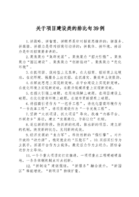 关于项目建设类的排比句39例1.拼战略、拼智慧、拼眼界是针对招商思维讲的;拼服务、拼激情、拼毅力是针对招商行动讲的;拼载体、拼环境、拼活力是针对招商要素讲的。2.聚焦聚力集群发展,聚焦聚力招大引强,聚焦聚力园区建设、聚焦聚力创新驱动,聚焦聚力优化环境。3.在抓项目、促转型上见真章,在大招商、招好商上比硬功,在优环境、强服务上出实招,在抓落实、提效率上使狠劲。4.在解放思想上实现新突破,在平台建设上实现新突破,在优化环境上实现新突破,在提升规模质量上实现新突破。5.在招大引强上破题,在用地保障上破题,在项目建设上破题,在优化营商环境上破题,在城市更新提质上破题。6.将招商引资作为一把手工程,将优化营商环境作为一号改革工程,将项目建设作为一号发展工程。7.坚持大抓项目、抓大项目导向,找准内搭平台、外联老乡路径,建立发展退位、干部让位机制。8.适应新的阶段,抢抓新的机遇,推出新的项目,建立新的机制,焕发新的状态,见到新的成效。9.经济发展的生力军,科技创新的强引擎,对外开放的动力源,稳定就业的压舱石。10.双招双引作为主抓手,拓展平台作为主载体,激发活力作为主动力,团结奋进作为主导向。11.一个个重大项目实打实推进,一项项重点工程硬碰硬落地,一条条体制机制点对点创新。12.新制造建链强链,新服务融合提升,新园区释能增效,新项目持续扩量。13.高质量发展的生力军,科技创新的强引擎,改革开放的活力源,共同富裕的助推器。14.更高的标准抓项目,更大的干劲招项目,更优的路径促项目,更实的举措保障项目。15.把汗水洒到重点项目一线,把智慧用在争资争项途中,把精力用在爬坡上坎路上。16.经济发展的主力军,科技创新的强引擎,对外开放的动力源,民生福祉的助推器。17.按下招商引资快进键,打造营商环境新名片,跑出项目建设加速度。18.紧扣运行方式关键点,紧盯组织形态着力点,紧抓作用发挥增长点。19.一刻不停开展招商引资,争分夺秒加快项目建设,竭尽所能强化要素保障。20.在产业链上蓄动能,在服务端上提效能,在共富路上聚势能。21.经济活动的主要参与者,就业机会的主要提供者,技术进步的主要推动者。22.工作重心往项目上落,工作举措往项目上放,工作力量往项目上靠。23.理顺体制机制上发力,优化资源配置上攻坚,提升发展质效上突破。24.以真情实意引来项目,以优质服务留住项目,以有力举措助推项目。25.促进民营经济活,带动投资项目增,保障经济运行稳。26.大抓产业发展,大抓项目建设,大抓招商引资,大抓工作落实。27.项目建设提速,对外合作提质,营商环境提标,为民办事提效。28.以项目投资稳经济,以改革创新谋发展,以规范管理促提升。29.在市场一线想办法,在产业一线谋对策,在项目一线找出路。30.立足规划生成项目,深研政策争取项目,创优环境招引项目。31.精准施策抓招商,凝心聚力上项目,多措并举优环境。32.一流状态抓项目,一流速度建项目,一流服务促项目。33.不要怕爬山涉水,不要怕吃闭门羹,不要怕冷言冷语。34.矢志不渝推项目,坚定不移抓招商,抢抓机遇促发展。35.比的是项目,赛的是发展,鼓的是干劲,提的是信心。36.项目的大集聚,产业的大发展,竞争力的大提升。37.招来一个企业,完善一个链条,育成一个产业。38.集聚各类要素,汇聚各项政策,凝聚各方力量。39.心里想着项目,眼里盯着项目,手里抓着项目。