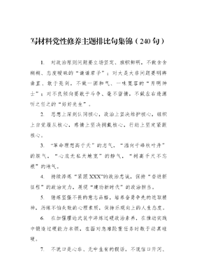 写材料党性修养主题排比句集锦(240句)1.对政治原则问题要立场坚定、旗帜鲜明,不做含含糊糊、态度暧昧的谦谦君子;对大是大非问题要明辨曲直、敢于亮剑,不做一团和气、一味宽容的开明绅士;对不良倾向要敢于斗争、毫不留情,不做左右逢源听之任之的好好先生。2.思想上深刻认同核心,政治上坚决维护核心,组织上自觉服从核心,感情上坚决拥戴核心,行动上坚定紧跟核心。3.革命理想高于天的志气,洒向千峰秋叶丹的胆气,心底无私天地宽的静气,树高千尺不忘根的地气。4.持续淬炼紧跟XXX的政治忠诚,保持奋进新征程的政治定力,展现建功新时代的政治担当。5.锤炼坚强不畏的意志品格,培养奋勇争先的进取精神,历练不怕失败的心理素质,保持乐观向上的人生态度。6.在加强理论武装中淬炼过硬政治素养,在推动实践中锻造过硬能力本领,在面对急难险重任务时敢于动真碰硬。7.不说口是心非、无中生有的假话,不说信口开河、难以兑现的空话,不说颠倒黑白、混淆是非的错话。8.务必不忘初心、牢记使命,厚植扎根群众的工作作风,务必谦虚谨慎、艰苦奋斗,彰显忠诚于党的坚定信念,务必敢于斗争、善于斗争,永葆顽强斗争的英雄气概。9.增强政治判断力,做到见微知著、一叶知秋;增强政治领悟力,做到心中有数、了然于胸;增强政治执行力做到对表对标、不折不扣。10.增强坚定不移看齐追随的政治自觉,坚持不懈凝心铸魂的思想自觉,注重实践担当实干的行动自觉,从严治党自我革命的时代自觉。11.以学铸魂、紧跟核心强忠诚,以学增智、理论武装强本领,以学正风、廉洁奉公强宗旨,以学促干、推动发展强担当。12.在坚定理想信念中把好方向之舵,在强化理论学习中汲取奋进之力,在心怀国之大者中蓄积发展之势。13.对党忠诚、无私奉献的进取品质,敢于斗争、冲锋在前的勇毅风骨,人民至上、永葆初心的公仆情怀,克己奉公、清廉自守的高尚情操。14.怀揣利归天下,誉属黎民的淡泊情怀,铭记偏则不公,滥则不正的经验教训,保持心如规矩,志如尺衡的人生态度。15.越是任重道远,越要不忘初心、牢记使命;越是繁荣富强,越要谦虚谨慎、艰苦奋斗;越是风高浪急,越要敢于斗争、善于斗争。16.政治上的明白人,高质量发展的开路人,为民服务的贴心人,真抓实干的带头人,清正廉洁的老实人。17.在大是大非面前头脑清醒、立场坚定,在大风大浪面前挺直腰杆、站稳脚跟,在大战大考面前挺身而出、冲锋在前。18.思想上高度信赖核心,感情上衷心爱戴核心,政治上坚决维护核心,组织上自觉服从核心,行动上始终紧跟核心。19.惟有理想,才能执着奋进;惟敢担当,才能攻坚克难;惟能吃苦,才能不惧艰辛;惟肯奋斗,才能善作善成。20.忠诚是根本考验,岗位是最好考场,人民是阅卷考官,自己是永远考生,法纪是严明考规。21.用革命文化淬炼公而忘私、甘于奉献的高尚品格,用社会主义先进文化培育为政清廉、秉公用权的文化土壤用中华优秀传统文化涵养克己奉公、清廉自守的精神境界。22.坚定维护之心,夯实忠诚之志;增强维护之力,夯实忠诚之行;增强维护之形,夯实忠诚之实增强维护之效,夯实忠诚之果。23.待人接物要有平等之心,名利得失要有平衡之心,自我追求要有平稳之心,修身养性要有平和之心,谋事干事要有平实之心。24.厚植俯首甘为孺子牛的为民情怀,认清乱花渐欲迷人眼的复杂形势,秉持越是艰险越向前的顽强意志。25.思想上高度信赖核心,感情上衷心爱戴核心,政治上坚决维护核心,组织上自觉服从核心,行动上始终紧跟核心。26.秉持咬定青山不放松的强大定力,发扬挺立潮头勇创新的时代精神,涵养计利当计天下利的家国情怀。27.树牢不达目的不罢休的斗争意识,坚定狭路相逢勇者胜的斗争信心,提高烈火方能见真金的斗争本领。28.知足常乐的平常心,静得下来的闲暇心,积极向上的火红心,自我解放的包容心,顺其自然的自由心。29.对待纪律规矩要知敬畏,对待职责任务要尽人事,对待能力水平要懂不足,对待荣誉成绩要明进退。30.保持会当水击三千里的自信,挺起泰山压顶不弯腰的脊梁,涵养乱云飞渡仍从容的定力。31.从政治高度上看待,从政治要求上把握,从政治风险上防范,从政治纪律上要求,从政治效果上衡量。32.从政治引领中修理想之志,从理论学习中获思想之识,从基层一线炼实践之能。33.把见怪不怪的潜规则清干净,把扭曲颠倒的价值标准正过来,把习非成是的惯性做法摒弃掉。34.既不能有不愿斗的软骨症,也不能患不敢斗的恐惧症,更不能犯不用斗的妄想症。35.绝对忠诚的政治品格,担当作为的时代气质,人民至上的宗旨情怀,廉洁自律的清风正气。36.充分彰显了信念坚定、对党忠诚的政治本色,深刻诠