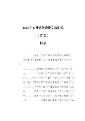 2023年8月党务论谈文稿汇编(17篇)目录1.突出三性推动党课教育成果转化32.校准三重坐标让干部教育有型有味63..流动党员管理要以小见大94..运笔之道诠释大写的学字135小分数打造三气党课166.弹好结合之弦奏响党课教育三部曲197.样样不能少增强党课影响力228.把握三性激荡党课思想之花259.善用三个结合打造精品党课2710..党建品牌打造要实之又实3011三道笔墨让党课出新出彩3312.三会一课三要素之形、气、魂3613..运笔之道诠释党员教育的起承转合3914..把党课融入实践方能圈粉4215.三步走让党课提质增效4516执三笔绘就党员教育培训新图景4817.以活起来的党课激发细胞活力51突出三性推动党课教育成果转化党课是宣传党的路线、方针、政策的重要载体,是我们党在长期实践中创造的一种最基本、最常用、最有效的教育形式。想要讲好党课,党课授课者不妨创新思路、分层施教,突出教育政治性、突出形式创新性、突出内容实用性,推动党课教育成果转化,推动组织生活规范落实、党员教育提质增效。突出教育政治性,将榜样力量转化为行动指引。讲好一堂党课,不是单纯只讲理论,更重要的是要讲大事、讲发展,凝聚合力。要着力解决以往党课内容枯燥乏味,教育培训效果不够好等问题,挖掘身边优秀人物事迹,邀请各领域先进典型人物讲述自身故事,激发广大党员的爱党爱国情怀。要围绕XXX新时代中国特色社会主义思想等重要思想主线开讲,通过专题展览、讲座宣讲、主题活动等方式,变阵地式讲解为体验式互动式宣讲,不断丰富党课内容、增添党课趣味性,推动看、听、思、悟、行融为一体,使广大党员在学习红色文化中正本清源、在感悟红色精神中坚定信仰、在弘扬红色传统中厚实底蕴,促使党员干部筑牢信仰之基、补足精神之钙、把稳思想之舵。突出形式创新性,将创新力量转化为学习动力。周虽旧邦,其命维新。党课教育不妨也在创新方式上大胆尝试,通过线上线下相结合的方式,让党课的辐射面更广、带动性更强。深入田间地头讲,开设乡村大学堂,选拔专业老师草根教授深入田间地头、生产一线,现场传授致富经。开设网络直播讲,精准对接农民党员教育需求,依托网络教育宣传平台,定期组织优秀基层党组织书记在线授课,打造党员教育移动课堂。要利用红色喇叭讲,依托城区红显屏和乡村应急广播体系,探索建立红显屏红色小喇叭有声阵地,将红显屏小喇叭切实打造成宣讲党史好声音的扩音器、便民信息发布的新渠道、密切党群关系的连心桥。突出内容实用性,将实践力量转化为工作指南。党课目的是以教育引导、浸润思想、推动工作、解决问题为导向。因此,党课授课人要有扎实的政治理论功底外,还需非常注重在党课的联系实际上下功夫。作为一个党课授课人,要利用好联系实际这个法宝,充分将政策理论宣讲与地方乡土文化结合,采取点对点评手把手教面对面学模式,与解决基层群众渴盼的具体问题结合,吸收党员期盼、群众智慧、基层经验,拉近宣讲者与受众之间的距离,通过走进农家小院、田间地头、企业车间等,表达上因地制宜、因人而异,多讲方言、土话,少讲套话、空话,使党课既有灵魂,又有血肉,大家愿意听、喜欢听、听得懂,真正让党课成为广大党员干部思想的补给站、工作的助推器。校准三重坐标让干部教育有型有味干部教育是党的事业的重要组成部分,是建设高素质干部队伍的先导性、基础性、战略性工程,对推动党和人民事业发展、实现新时代党的历史使命具有不可替代的重要地位和作用。面对新形势、新任务和新要求,干部教育培训工作要想有新气象、新作为,就要校准三重坐标,以培训内容培训方式培训质量定型,突出对味鲜味入味,切实提升干部教育培训质效。校准按需施教坐标,以培训内容定型,突出对味。掌握干部对培训的需求是开展好干部教育培训工作的前提和基础。这就要求培训内容的设置要更加合理、更加科学、更加贴近干部对能力提升的需要。要切忌大水漫灌大锅烩菜,只有精准滴灌,才能让每一次的