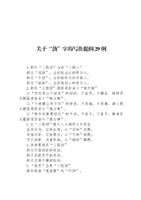 关于劲字的写作提纲29例1.铆足三股劲当好三种人铆足闯劲,当好政治上的明白人。铆足干劲,当好新时代的开路人。铆足韧劲,当好践初心的责任人。2.铆足三股劲握紧艰苦奋斗接力棒以咬定青山不放松的韧劲,不言弃,不懈怠,持续发力握紧艰苦奋斗接力棒。以不破楼兰终不还的拼劲,不退缩,不畏难,凝心聚力握紧艰苦奋斗接力棒。以绝知此事要躬行的干劲,不蛮干,不盲干,精准发力握紧艰苦奋斗接力棒。3.以三股劲提升人大调研工作质效坚定方向、应时应势,以实劲选题。多措并举、汇智聚力,以巧劲破题。守正创新、完善机制,以韧劲解题。4.改革要铆足三股劲铆足开拓创新的闯劲。铆足真抓实干的实劲。铆足坚持不懈的韧劲。5.赶考当有三股劲要有练就宽肩膀的巧劲。要有勇挑千斤担的韧劲。要有敢上十八盘的拼劲。6.干事创业须有三股劲要有攻坚克难、开拓创新的闯劲。要有善作善成、久久为功的韧劲。要有动真碰硬、刀刃向内的狠劲。7.弘扬三股劲 争做好法官学习焦裕禄同志,就要学习他对人民的那股亲劲。学习焦裕禄同志,就要学习他抓工作的那股韧劲。学习焦裕禄同志,就要学习他干事业的那股拼劲,8.弘扬焦裕禄三股劲精神,恪尽职守◆要保持对群众的亲劲◆要保持抓工作的韧劲◆要保持干事业的拼劲9.鼓足三股劲扎实推动三个年活动鼓足一往无前的冲劲,在推动项目建设中务实功。鼓足雷厉风行的干劲,在优化营商环境中求实效。鼓足久久为功的韧劲,在提升作风能力中办实事。10.党员干部要有三股劲儿玉经琢磨多成器,剑拔沉埋便倚天,锤炼勤学苦练,自律自省的干劲。山重水复疑无路,柳暗花明又一村,永葆紧盯目标,心无旁骛的韧劲。宝剑锋从磨砺出,梅花香自苦寒来,永葆逢山开路,遇水搭桥的拼劲。11.要保持亲劲、韧劲、拼劲对群众的亲劲,彰显的是人民立场。抓工作的韧劲,展现的是优良作风。干事业的拼劲,诠释的是坚定信念。12.铆足三股劲 打造乡村振兴盛宴以敢为善成的钻劲强化高位推动。以担当作为的干劲强化责任分工。以只争朝夕的拼劲强化工作落实。13.讲好用足三股劲,做新时代四有好干部对群众的亲劲是心中有民的深刻实践。抓工作的韧劲是心中有责的使命担当。干事业的拼劲是心中有戒的无限忠诚。14.铆足三股劲,在推进三个年活动上出实招鼓足干劲 在推动项目建设上务实功蓄足冲劲 在优化营商环境上办实事铆足韧劲 在改进工作作风上谋实效15.以三股劲精神推动检察工作转型发展始终牢记为民宗旨,把焦裕禄同志对群众的那股亲劲集中体现到检察工作各方面和司法办案全过程始终牢记责任担当,把焦裕禄同志抓工作的那股韧劲集中体现到抓好当前和今后一个时期重点工作上始终牢记初心使命,把焦裕禄同志干事业的那股拼劲集中体现到推动检察工作转型发展和谱写检察事业新篇上16.党员干部要弘扬焦裕禄的三股劲精神对群众的亲劲,体现了一心爱民的发展思想。抓工作的韧劲,彰显了攻坚克难的优良作风。干事业的拼劲,诠释了忠诚于党的坚定信念。17.弘扬焦裕禄三股劲工作室以亲劲爱民以韧劲护航以拼劲创优18.在党史学习教育中铆足三股劲铆足理论研究的钻劲铆足较真碰硬的狠劲铆足奋勇向前的干劲19.大力弘扬三股劲 推动全县持续高质量发展推动全县持续高质量发展,必须大力弘扬对群众的那股亲劲。推动全县持续高质量发展,必须大力弘扬抓工作的那股韧劲。推动全县持续高质量发展,必须大力弘扬干事业的那股拼劲。20.退伍军人的三股劲信念坚定有心劲。作风过硬有干劲。冲锋陷阵有拼劲。21.三股劲激发经济发展新动能一是鼓足农业干劲,农业生产稳中向好。二是激发项目闯劲,项目建设精准发力。三是增强文旅韧劲,文旅融合赋能蝶变。22.铆足三股劲 谱写坚韧、实干、革新篇章铆足干劲,谱写自力更生、艰苦奋斗的坚韧篇章。铆足拼劲,谱写不断攀登、勇于探索的实干篇章。铆足闯劲,谱写超越突破、不断创新的革新篇章。23.身上有着三股劲工作保持认真劲干事带着热心劲创业坚持创新劲24.学习践行三股劲永葆对群众的亲劲,不忘初心惠民生。增强抓工作的韧劲,久久为功谋发展。激发干事业的拼劲,困难面前逞英雄。25.执行路上三股劲工作讲拼劲,当事人说他是拼命三郎办案靠韧劲,同事们赞他是办案能手为民有亲劲,老百姓夸他是良心法官26.凝聚三股劲 决战决胜脱贫攻坚以咬定青山不放松的韧劲决战决胜。以不破楼兰终不还的拼劲决战决胜。以初生牛犊不怕虎的闯劲决战决胜。27.以三股劲提升三个度铆足长风破浪会有时的冲劲,跑出三大整治新速度铆足咬定青山不放松的韧劲,