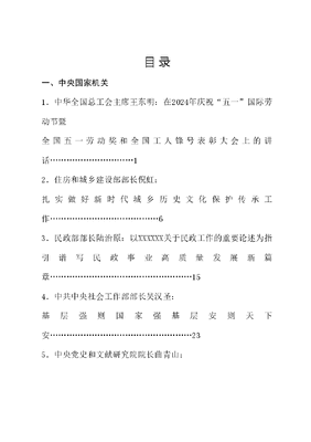目 录一、中央国家机关1.中华全国总工会主席王东明:在2024年庆祝五一国际劳动节暨全国五一劳动奖和全国工人锋号表彰大会上的讲话…………………………12.住房和城乡建设部部长倪虹:扎实做好新时代城乡历史文化保护传承工作…………………………………63.民政部部长陆治原:以XXXXXX关于民政工作的重要论述为指引谱写民政事业高质量发展新篇章……………………………………………154.中共中央社会工作部部长吴汉圣:基层强则国家强基层安则天下安……………………………………………235.中央党史和文献研究院院长曲青山:为推进党的伟大事业提供坚强纪律保证……………………………………316.中央党史和文献研究院院长曲青山:为推进党的伟大事业提供坚强纪律保证……………………………………407.国务院发展研究中心副主任张来明:聚焦推动高质量发展加快发展新质生产力…………………………………518.国家金融监督管理总局副局长肖远企:在金融强国主题对话暨《金融监管研究》学术年会上的讲话……………599.中央宣传部文明实践局徐西庆:中央宣传部文明实践局爱读书与善读书……………………………………6310.中国社会科学院经济研究所外国经济思想史研究室主任、教授杨虎涛:从历史维度深化对新质生产力发展规律的认识……………………………68二、地方党委政府11.贵州省委书记徐麟省长李炳军:致广大人才朋友的一封信………