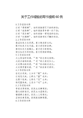 关于工作经验的写作提纲60例1.工作经验材料打好感情牌,始终保持紧盯不放的拼劲;打好优势牌,始终保持勇争第一的干劲;打好服务牌,始终保持一帮到底的钻劲;打好机制牌,始终保持常抓不懈的韧劲。2.工作经验材料激活红色文化资源,着力焕发新生机;提升红色文化内涵,着力讲好新故事;推进红色文旅融合,着力设计新路线;健全红色传承机制,着力延续新辉煌。3.工作经验材料从主要指标来看,稳的态势在持续;从经济结构来看,进的力度在加大;从发展动能来看,新的动能在成长;从发展质量来看,好的因素在累积。4.工作经验材料依托自然美,让乡村靓起来;打造现代美,让群众富起来;注重个性美,让特色显出来;构筑整体美,让活力迸出来。5.工作经验材料带着深厚感情,把民生实事做好;强化创新意识,把民生内涵做实;增强精品意识,把民心工程做优;坚持改革思维,把制度保障做强。6.工作经验材料做群众最盼的事;抓群众最怨的事;帮群众最难的事。7.工作经验材料加强教育,树立真抓实干的队伍风向标;建章立制,筑牢为官不为的制度防火墙;多管齐下,打出庸懒散拖的监督组合拳;正风肃纪,严明为官不为的纪律高压线;完善机制,探索为官有为的改革新思路;加大曝光,发挥为官不为的治腐震慑力。8.工作经验材料走到位,力戒走马观花不深入;问到位,力戒脱离主题太随意;说到位,力戒满口应承无原则;想到位,力戒敷衍做作不交心;做到位,力戒高高在上不作为。9.工作经验材料常修枝,巩固思想引领这一根本;多施肥,把握能力塑造这一关键;勤培土,服务实战应用这一目标。10.工作经验材料进固可喜,但不可沾沾自喜;退也光荣,但不可退而无为;留诚可贵,但不可妄自菲薄;转当益壮,但不可患得患失。11.工作经验材料要能谋善断,把好方向;要能干善治,抓好落实;要能征善战,做好表率;要能识善任,带好队伍。文可居文库——海量学习资料,手机电脑均可下载www.wenkeju.com12.工作经验材料坚持项目主引擎,拼速度、增实力;突出改拆主抓手,强力度、再提升;合唱实干主基调,加热度、浓氛围。13.工作经验材料突出实际实效,实施实打实考核;突出责任刚性,实施一对一管理;突出末位淘汰,实施硬碰硬兑现。14.工作经验材料种好党建责任田,身体力行履好使命;牵住治党牛鼻子,运筹帷幄全面过硬;用好考核指挥棒,刚柔并济激发活力。15.工作经验材料激活初心,瞄准靶心;践行初心,赢取民心;永葆初心,恪守忠心。16.工作经验材料要常打思想免疫针;要构筑制度防火墙;要强化监督紧箍咒;要重用法典杀手锏。17.工作经验材料以铁的意志,勇闯赶超发展之路;以铁的担当,力补赶超发展之短;以铁的作风,大抓赶超发展之基;18.工作经验材料 全员比干,做到千斤重担人人挑;用心比拼,敢于动真碰硬破难题;对标精准,坚持壮士断腕抓典型。19.工作经验材料文可居文库——海量学习资料,手机电脑均可下载www.wenkeju.com直面问题,以最大的决心苦干实干;争分夺秒,以最强的声势苦干实干;上下欲同,以最优的作风苦干实干。20.工作经验材料树实依法治县的理念;做实依法治县的规划;干实依法治县的项目;充实依法治县的要素。21.工作经验材料制定一套系统全面的精准扶贫方案;编制一本内容精准的扶贫工作手册;建立一支精干过硬的扶贫专业队伍;搭建一个比学赶超的精准扶贫擂台;打造一批坚强有力的基层党的组织;增加一个细化量化的扶贫专项考评;出台一套导向鲜明的扶贫奖惩措施。22.工作经验材料以大视野谋划大格局,提升发展理念;以大项目推动大发展,强化产业支撑;以大策划打造大品牌,彰显X X 特色;以大文化构建大服务,实现惠及全民。23.工作经验材料做好老树新枝的文章,加快提升传统产业;做好插柳成荫的文章,积极培育新兴产业;做好育种蹲苗的文章,大力推进创新创业。24.工作经验材料心贴心交流,解决一层纸问题;送服务上门,解决一厘米问题;急群众所急,解决一分钟问题。25.工作经验材料文可居文库——海量学习资料,手机电脑均可下载www.wenkeju.com关注衣食住行,抓好基本民生;关爱生老病死,保障底线民生;关切安居乐业,强化热点民生。26.工作经验材料点上强龙头,从引资升级为选资;线上抓延伸,从行业升级为产业;面上求突破,从单个升级为集群。27.工作经验材料紧盯大事要事打攻坚战;紧盯急事难事打歼灭战;紧盯薄弱环节打持久战。28.工作经验材料克服华而不实学风,锤炼求真务实作风;克