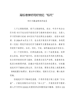 高标准学好用好党纪标尺四川日报全媒体评论员人不以规矩则废,党不以规矩则乱。近日,中共中央办公厅印发《关于在全党开展党纪学习教育的通知》指出,为深入学习贯彻修订后的《中国共产党纪律处分条例》,经党中央同意,自2024年4月至7月,在全党开展党纪学习教育。各级党委(党组)要把开展党纪学习教育作为重要政治任务,教育引导党员干部学纪、知纪、明纪、守纪,始终做到忠诚干净担当。对一个党员而言,纪律是高压线;对一个政党来说,纪律是生命线。保持严规守纪,是我们党的优良作风和光荣传统。在全党开展党纪学习教育,是推进全面从严治党、永葆党的生机活力的重要举措,是推动中国式现代化的内在要求。切实推进党纪学习教育走深走实、见行见效,需要在思想上高度重视, 准确把握目标要求、重点和关键点,创新方式方法,精心组织实施。悟透党纪学习精神是前提。只有在思想引领上把准方向盘,才能在实践行动中把住向心力。开展党纪学习教育,深入学习贯彻XXXXXX的重要讲话和重要指示精神,坚持以XXX新时代中国特色社会主义思想为指导, 进一步深化对加强党的纪律建设重要性和忽视党纪、违反党纪问题危害性的认识。聚焦解决一些党员干部对党规党纪不上心、不了解、不掌握等问题,组织党员坚持个人自学与集中学习相结合,抓好以案促学、以训助学。学好用好党纪这根标尺,敲响警示钟、筑牢防火墙,切实将遵规守纪刻印在心,内化为言行准则,校正思想和行动,以良好作风保证党纪学习教育走深走实。突出重点分层推进是方法。各级党组织要坚持科学谋划、统筹安排、分类指导,确保党纪学习教育取得实效。既要注重全员覆盖,也要突出关键少数。聚焦重点群体重点领域,督促各级领导干部在遵守和执行纪律上以身垂范,发挥头雁效应,带动广大党员干部把纪律严起来、把规矩立起来, 当好党纪学习教育的组织者、推动者、实践者;紧盯年轻干部违纪违法易发多发风险点,开展常态化警示教育,让年轻干部始终做到知敬畏、存戒惧、守底线;充分发挥基层党组织联结最广大党员群众的前线堡垒作用,在分层推进中形成上下贯通、横向联动、互融互促的链条。提升质效严督实导是保障。开展党纪学习教育,需要强化提质增效,既要严肃认真,又要紧跟时代发展、创新方式方法、创设学习平台,增强感染力和说服力,以浓厚氛围推动党纪学文可居文库——海量学习资料,手机电脑均可下载www.wenkeju.com习教育往深里走、实里走。坚持用好身边活教材,通过典型案例警示录等方式,警醒党员干部绷紧纪律之弦。把党纪学习教育融入日常,坚持执纪必严、违纪必究,以从严执纪的惩戒震慑强化学习教育效果,努力实现查处一案、警示一片、教育一方。这次党纪学习教育时间紧、任务重,唯有压紧压实责任,把督和导有机统一起来,强化整体统筹,健全评价体系,抓实每个环节,抓好每个步骤,才能抓紧抓实、抓出成效。凡事有立必有破。开展党纪学习教育,坚持问题导向发力正是通过立纪举措解决破纪行为,让明规矩、知敬畏、存戒惧成为广大党员干部的政治自觉与情感认同。文可居文库——海量学习资料,手机电脑均可下载www.wenkeju.com