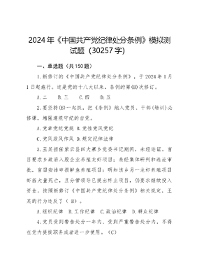 2024年《中国共产党纪律处分条例》模拟测试题(30257字)一、单选题(共150题)1.新修订的《中国共产党纪律处分条例》,于2024年1月1日起施行。这是党的十八大以来,条例的第(B)次修订。A.二 B.三 C.四 D.五2.要坚持(B)一起抓,把《条例》纳入党员、干部(培训)必修课,增强遵规守纪的自觉。A.党章党纪党规 B.党性党风党纪C.党风政风作风 D.规定纪律法律3.王某担任紫云县四大寨乡党委书记期间,未经论证,盲目要求乡政府入股企业养殖龙虾项目;未经集体研判和选址审批,盲目安排申报鲈鱼养殖项目;明知该乡另一龙虾养殖项目虾苗大量死亡,且分管领导已提出终止项目,仍要求继续投入资金。按照新修订《中国共产党纪律处分条例》相关规定,王某的行为违反了( B)。A.组织纪律 B.工作纪律 C.政治纪律 D.群众纪律4.党员受到警告处分一年内、受到严重警告处分内,不得在党内提拔职务或者进一步使用。(C)A、半年 B、一年 C、一年半 D、二年5.张某,党员,某县某乡副乡长。2016年6月,张某到县某中医院做CT检查,因人员较多,张某对医生表示工作太忙不想排队,在医生明确告知无医嘱不能按照重患提前检查后,张某出言不逊并辱骂医生,造成不良影响。按照新修订《中国共产党纪律处分条例》相关规定,张某的行为违反了( A )。A.生活纪律 B.工作纪律 C.政治纪律 D.群众纪律6.接受、提供可能影响公正执行公务的宴请或者旅游、健身、娱乐等活动安排,情节严重的,给予处分。( C )A. 警告B. 严重警告C. 撤销党内职务或者留党察看D. 开除党籍7.某领导干部(中共党员)将其所辖的汽车城当成家族产业,利用职权大肆为亲属经营活动打招呼、批项目,非法牟取巨额利益。按照新修订《中国共产党纪律处分条例》相关规定,其行为违反了( D ) 。A.组织纪律 B.工作纪律 C.政治纪律 D.廉洁纪律9. 某村村委会主任谢某(中共党员)在自然灾害救助款5万元和冬春补助款1.6万元分配中,超标准向其亲兄弟及堂兄弟发放救助资金1.02万元。按照新修订《中国共产党纪律处分条例》相关规定,谢某的行为违反了(A )。文可居文库——海量学习资料,手机电脑均可下载www.wenkeju.comA.群众纪律 B.工作纪律 C.政治纪律 D.组织纪律10.某局科长章某(中共党员)在一个QQQ里认识了赵某,相互产生了好感。章某去外地办事并与赵某见面,之后两人一直保持不正当关系。后因章某考虑家庭关系,逐渐与赵某疏远不再见面,赵某于是向章某提出赔偿要求,双方经多次协商无果。其后,赵某向县长信箱写信,并到章某单位上门反映。章某被免去科长职务,受到党内严重警告处分。按照新修订《中国共产党纪律处分条例》相关规定,章某的行为违反了( A ) 。A.生活纪律 B.工作纪律 C.政治纪律 D.群众纪律11、根据新修订《中国共产党纪律处分条例》规定,党员干部相互利用职权或者职务上的影响为对方及其配偶、子女及其配偶等亲属、身边工作人员和其他特定关系人谋取利益搞权权交易的,给予 处分。(A)A. 警告或者严重警告B. 撤销党内职务C. 留党察看D. 开除党籍12.某镇基建办副主任林某等18名党员干部应某房地产公司邀请,参加其举办的新春联欢晚会。林某等7名党员干部凭文可居文库——海量学习资料,手机电脑均可下载www.wenkeju.com现场领取的兑奖券,分别兑换现金红包2000元至5000元不等。按照新修订《中国共产党纪律处分条例》相关规定,林某的行为违反了 。( D )A.组织纪律 B.工作纪律 C.政治纪律 D.廉洁纪律13.违背社会公序良俗,在公共场所、网络空间有不当言行,情节较重的,给予 处分。(A)A. 撤销党内职务或者留党察看B. 严重警告C. 警告或者严重警告D. 留党察看14.某地区供销社工作人员薄某(中共党员),奉行人生得意须尽欢的人生哲学。薄某在检讨材料中写道:随着职务的升迁,经常洽谈几千万甚至几个亿的项目,出入的是装潢考究的高档场所,宴席上摆的是珍馐佳肴和名贵烟酒,渐渐地,自己不仅身体醉倒在觥筹交错的酒桌上,思想也慢慢迷失在酒绿灯红的花花世界里。按照新修订《中国共产党纪律处分条例》相关规定,薄某的行为违反了 。( A )A.生活纪律 B.工作纪律 C.政治纪律 D.群众纪律15、违反相关管理规定,有以下哪些行为,情节较重的,对直接责任者和领导责任者,给予警告或者严重警告处分。D文可居文库——海量学习资料,手机电脑均可下载www.wenkeju.com①决定或者批准举办各类节会、庆典活动②擅自举办评比达标表彰、创建示范活动③决