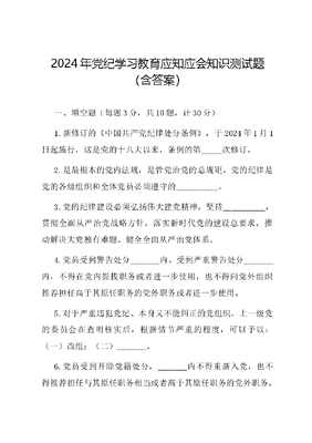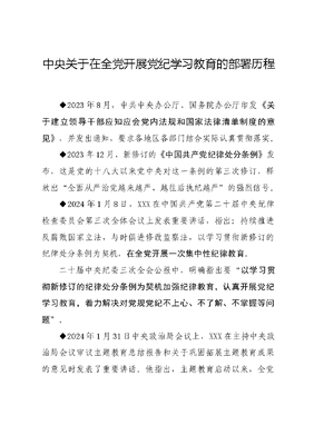 中央关于在全党开展党纪学习教育的部署历程◆2023年8月,中共中央办公厅、国务院办公厅印发《关于建立领导干部应知应会党内法规和国家法律清单制度的意见》,并发出通知,要求各地区各部门结合实际认真贯彻落实。◆2023年12月,新修订的《中国共产党纪律处分条例》发布,这是党的十八大以来党中央对这一条例的第三次修订,释放出全面从严治党越来越严、越往后执纪越严的强烈信号。◆2024年1月8日,XXX在中国共产党第二十届中央纪律检查委员会第三次全体会议上发表重要讲话,指出:持续推进反腐败国家立法,与时俱进修改监察法,以学习贯彻新修订的纪律处分条例为契机,在全党开展一次集中性纪律教育。二十届中央纪委三次全会公报中,明确指出要以学习贯彻新修订的纪律处分条例为契机加强纪律教育,认真开展党纪学习教育,着力解决对党规党纪不上心、不了解、不掌握等问题。◆2024年1月31日中央政治局会议上,XXX在主持中央政治局会议审议主题教育总结报告和关于巩固拓展主题教育成果的意见时发表了重要讲话。他指出,主题教育启动以来,全党紧扣学思想、强党性、重实践、建新功总要求,聚焦主题主线,明确目标任务,突出以学铸魂、以学增智、以学正风、以学促干,与做好开局之年工作紧密结合,特别是着力解决制约高质量发展问题、群众急难愁盼问题、党的建设突出问题,达到预期目的,取得明显成效。XXX强调,要巩固拓展主题教育成果,抓好意见落实,形成长效机制。要持续加强理论武装,教育引导党员干部通过坚持学习党的创新理论,悟规律、明方向、学方法、增智慧,固本培元、凝心铸魂,进一步打牢党的团结统一的思想基础。要持续推动解决问题,继续抓好整改整治、建章立制,让人民群众切实感受到解决问题的实际成效,让人民群众有获得感。要持续改进作风,落实四下基层,坚持和发展新时代枫桥经验,走好新时代群众路线,纠治形式主义、官僚主义,切实抓好整治形式主义为基层减负工作。要大兴务实之风、清廉之风、俭朴之风,发扬自我革命精神,在全党组织开展好集中性纪律教育。要持续夯实基层基础,推进以党建引领基层治理,充分发挥基层党组织战斗堡垒作用和党员先锋模范作用,推进基层治理体系和治理能力现代化。要持续抓好落实,树牢正确政绩观,坚持问题导向,实事求是、因地制宜,重实干、做实功、求实效,更好将主题教育成果转化为推动高质量发展的成文可居文库——海量学习资料,手机电脑均可下载www.wenkeju.com效。各级党委(党组)要把巩固拓展主题教育成果作为重大政治任务,扛起主体责任,不折不扣抓好落实。◆2024年2月4日的学习贯彻XXX新时代中国特色社会主义思想主题教育总结会议,传达了XXX在中央政治局会议上的重要讲话。中共中央政治局常委、中央学习贯彻XXX新时代中国特色社会主义思想主题教育领导小组组长蔡奇出席会议并讲话。蔡奇强调,这次主题教育为新时代开展党内集中教育积累了新经验,主要包括:坚持把理论学习贯穿始终、突出问题导向、服务中心任务、力戒形式主义、以上率下示范引领等,要注意总结好、运用好。蔡奇还指出,要严明党的纪律,在全党开展集中性纪律教育,推动广大党员、干部自觉把铁的纪律转化为日常习惯和行动准绳。要提高制度治党、依规治党水平。◆2024年3月18日至21日,中共中央XXX、国家主席、中央军委主席XXX在湖南考察。期间指出,推动高质量发展、推进中国式现代化,必须加强和改进党的建设。要巩固拓展主题教育成果,建立健全长效机制,树立和践行正确政绩观,持续深化整治形式主义为基层减负。组织开展好党纪学习教育,引导党员干部学纪、知纪、明纪、守纪,督促领导干部树立正确权力观,公正用权、依法用权、为民用权、廉洁用权。◆2024年4月3日,中央党的建设工作领导小组召开会议,文可居文库——海量学习资料,手机电脑均可下载www.wenkeju.com学习贯彻XXXXXX关于党纪学习教育的重要讲话和重要指示精神,听取党纪学习教育准备工作情况汇报,研究部署党纪学习教育工作。◆2024年4月上旬,中共中央办公厅印发《关于在全党开展党纪学习教育的通知》,在全党开展党纪学习教育。文可居文库——海量学习资料,手机电脑均可下载www.wenkeju.com