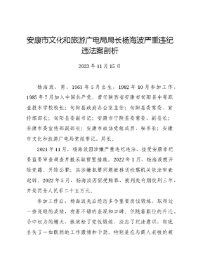 安康市文化和旅游广电局局长杨海波严重违纪违法案剖析2023年11月15日杨海波,男,1963年5月出生,1982年10月参加工作,1985年7月加入中国共产党。曾任陕西省安康市旬阳县中等职业技术学校校长;旬阳县政府办公室主任;旬阳县委常委、宣传部部长;旬阳县委副书记;安康市宁陕县委常委、副县长;安康市委宣传部副部长;安康市政协党组成员、秘书长;安康市文化和旅游广电局党组书记、局长。2021年11月,杨海波因涉嫌严重违纪违法,接受安康市纪委监委审查调查并被采取留置措施。2022年1月,杨海波被开除党籍、开除公职;其涉嫌犯罪问题被移送检察机关依法审查起诉。2022年5月,杨海波因犯受贿罪,被判处有期徒刑三年,并处罚金人民币二十五万元。参加工作后,杨海波先后经历多个重要岗位锻炼,取得过一些亮眼的成绩,有着不错的表现和口碑。但随着职位的升迁、手中权力的增大,他放松了党性锻炼、淡忘了纪法意识,彻底丢失了一如既然的工作激情和干劲。特别是在与商人老板的频繁接触中,他被贪欲蒙蔽了理智,让权势冲昏了头脑,彻底忘记了一名党员领导干部的本分,辜负了组织的信任和重托,与不法商人越走越近,大肆利用手中权力谋取私利。最终,杨海波在临近退休之年被查处,徒留无尽的遗憾与悔恨。修身不正 由风及腐蜕化变质工作始于教师,起步于基层,早年的杨海波称得上是一名励志青年。同事眼中的他能力强、有才气,26岁时就出任安康市旬阳县中等职业技术学校校长。在教育系统工作的13年间,得益于组织培养和个人努力,杨海波工作开展得有声有色1995年,32岁的他出任旬阳县政府办公室主任,逐步走上领导岗位。杨海波角色的转换非常顺利,此后,他先后出任县委宣传部部长、县委副书记、县政府副县长等职。2010年5月,杨海波被任命为安康市文化文物广电局(后更名为安康市文化和旅游广电局)党组书记、局长。安康市文化文物广电局承担着统筹规划全市文化事业、文化产业、旅游业、文物博物事业和广播电视事业发展的职责,作为一把手的杨海波,职权范围越来越广,手中项目越来越多,可支配的项目资金也越来越大。特别是党的十八大以来,文化产业迎来了快速发展的黄金期,项目建设和资金扶持的力文可居文库——海量学习资料,手机电脑均可下载www.wenkeju.com度不断加大。据办案人员介绍,从2010年至2018年,杨海波经手的100万元以上的项目就达14个。一把手的光环,让杨海波身边迅速围拢了一批商人老板,有的请他吃饭喝酒,有的想和他交朋友。从嘘寒问暖、请吃请喝,到称兄道弟、送钱送物,再到明目张胆进行利益输送,一张通过持续性的情感投资,交织着各种人情、利益的关系网将杨海波牢牢绑在其中。作风上的跑冒滴漏,哪怕再小,都是对共产党人拒腐蚀、永不沾政治本色的玷污,不引起警惕、不加以抵御,便埋下了危险的种子。2012年12月,安康某公共文化项目开工建设。公开资料显示,该项目占地面积41亩,建筑总面积14825平方米,总投资约1.5亿元,杨海波兼任该项目工程建设领导小组副组长。为得到杨海波的关照和支持,以便后期顺利拿到工程款,2013年春节,负责施工的陕西某建筑公司项目经理闵某提着一盒茶叶,来到杨海波办公室拜访。离开后,闵某特意给杨海波发了一条信息,不要把茶叶送人。茶叶盒里整整齐齐装了10万元现金,这让杨海波心头一颤。我发现后给他打电话,他已回到西安,并表明了感谢我配合他们工作的意思,我最终没有推掉。此时的杨海波经过了一文可居文库——海量学习资料,手机电脑均可下载www.wenkeju.com番思想斗争,但终究还是败给了自己的贪婪。拿到了施工方送来的茶叶盒,杨海波不仅主动过问、大力支持该项目主体工程建设,还积极帮助施工方协调各方面关系。项目建设进展顺利,双方都很满意。这是杨海波收受的第一笔贿赂,与其说是失足,不如说是上钩。追根溯源,还是修身不正、本色不纯。信仰的松动常在不知不觉间,信仰缺乏、理想信念不坚定权钱的欲望自然占据上风、填满内心。接受审查调查后,杨海波反思了自己走上犯罪道路的根源,在巨大诱惑和欲望面前跌入陷阱,只能说明自己党性锤炼不够,道德修养不纯正,以致迷失方向,这是我所走到这一步的根本原因。步步失守 甘被围猎滥权妄为贪心一动底线失守,如果不能从最初就坚决抵制,就会形成破窗效应,步步失守、节节败退。2013年7月,安康一家景观照明公司法定代表人陈某来到杨海波办公室,毛遂自荐希望承揽前述公共文化项目夜景照明工程,并表示事成之后来感谢。因为对这家公司的技术实力不了解,杨海波并未表态。几个月后,杨海波去施工现场考察时又一次遇到陈某,陈某再提此事,杨海波当场答应下来。2014年1月,该公司顺利中标。中标次日,为表示感谢,确保及时签订合同及拨付工程文可居文库——海