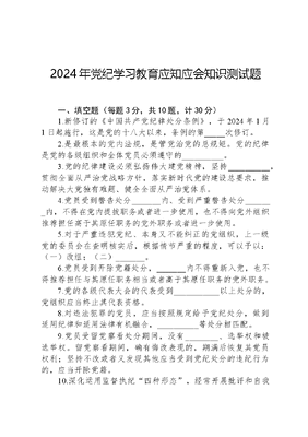 2024年党纪学习教育应知应会知识测试题一、填空题(每题3分,共10题,计30分)1.新修订的《中国共产党纪律处分条例》,于2024年1月1日起施行,这是党的十八大以来,条例的第_____次修订。2.是最根本的党内法规,是管党治党的总规矩。党的纪律是党的各级组织和全体党员必须遵守的__________。3.党的纪律建设必须弘扬伟大建党精神,坚持__________,贯彻全面从严治党战略方针,落实新时代党的建设总要求,推动解决大党独有难题、健全全面从严治党体系。4.党员受到警告处分_______内、受到严重警告处分_______内,不得在党内提拔职务或者进一步使用,也不得向党外组织推荐担任高于其原任职务的党外职务或者进一步使用。5.对于严重违犯党纪、本身又不能纠正的党组织,上一级党的委员会在查明核实后,根据情节严重的程度,可以予以:(一)改组;(二)_______。6.党员受到开除党籍处分,_______内不得重新入党,也不得推荐担任与其原任职务相当或者高于其原任职务的党外职务。7.党的各级代表大会的代表受到___________以上处分的,党组织应当终止其代表资格。8.对违法犯罪的党员,应当按照规定给予党纪处分,做到适用纪律和适用法律有机融合,__________等处分相匹配。9.党员受留党察看处分期间,没有________、选举权和被选举权。留党察看期间,确有悔改表现的,期满后恢复其党员权利;坚持不改或者又发现其他应当受到党纪处分的违纪行为的,应当开除党籍。10.深化运用监督执纪四种形态,经常开展批评和自我批评,及时进行__________、批评教育、责令检查、诫勉,让红红脸、出出汗成为常态。二、单选题(每题2分,共15题,计30分)1.新修订的《中国共产党纪律处分条例》,从_____这个总源头出发,坚持______,坚持_____导向和____导向相结合,与时俱进完善纪律规范,进一步严明政治纪律和政治规矩。(____)①党的纪律②党章③严的基调④问题⑤效果⑥目标⑦全面从严⑧党的建设A、②③④⑥B、①③④⑤C、②⑦④⑤D、⑧③④⑥2.接受、提供可能影响公正执行公务的宴请或者旅游、健身、娱乐等活动安排,情节严重的,给予_______处分。(____)A、警告B、严重警告C、撤销党内职务或者留党察看D、开除党籍3.党员有嫖娼或者吸食、注射毒品等丧失党员条件,严重败坏党的形象行为的,应当给予_______处分。(____)A、严重警告B、撤销党内职务C、留党察看D、开除党籍4.某法院副院长李某(中共党员)为当地一公司在该院的民事案件向主审法官说情打招呼,按照新修订《中国共产党纪律处分条例》相关规定,李某的行为违反了________。(____)A、工作纪律B、组织纪律C、政治纪律D、群众纪律5.违反接待管理规定,超标准、超范围接待或者借机大吃大喝,对直接责任者和领导责任者,情节严重的,给予_______处分。(____)A、留党察看B、撤销党内职务文可居文库——海量学习资料,手机电脑均可下载www.wenkeju.comC、严重警告D、警告6.中共党员、某镇民政所所长马某某,在发放救灾物资时,给其弟弟多发五袋大米和三桶油。请问马某某的行为属于违反群众纪律中的哪种情形?()A、弄虚作假,损害群众利益B、克扣群众财物C、优亲厚友D、拖欠群众钱款7.在信访工作中,不履行或者不正确履行职责,导致信访事项发生,造成不良影响或者严重后果的,情节严重的,对直接责任者和领导责任者________。(____)A、撤销党内职务B、给予开除党籍处分C、留党察看处分D、严重警告处分8.下列哪个行为是违反民主集中制原则的行为?()A、在民主推荐、民主测评、组织考察和党内选举中搞拉票、助选等非组织活动B、违反个人有关事项报告规定,隐瞒不报的C、借集体决策名义集体违规D、脱离实际,不作深入调查研究,搞随意决策、机械执行9.电视专题片《持续发力纵深推进》中,青海省6名党员领导干部从2011年开始,就逐步形成了一个相对固定的小圈子,相互利用职权行方便,例如插手干部人事调整,将彼此的老下属提拔任用到关键岗位;甚至在换届选举中互相拉票,互相推荐。按照相关规定,上述人员的行为违反了_______。(____)A、政治纪律B、组织纪律C、工作纪律D、群众纪律10.驻外机构或者临时出国(境)团(组)中的党员,脱离组织出走时间超过_______的,按照自行脱党处理,党内予以除名。(____)A、一个月B、三个月C、六个月D、一年文可居文库——海量学习资料,手机电脑均可下载www.wenkeju.com11.党员受到撤销党内职务处分,内不得在党内担任和向党外组织推荐担任与其原任职务相当或者高于其原任职务的职务。()A、半年B、一年C、一年半D、