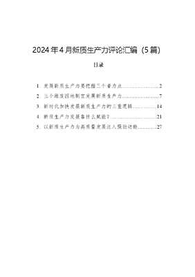 2024年4月新质生产力评论汇编(5篇)目录1.发展新质生产力要把握三个着力点.22.三个维度因地制宜发展新质生产力.73.新时代加快发展新质生产力的三重逻辑144.新质生产力发展靠什么赋能?.215.以新质生产力为高质量发展注入强劲动能..27发展新质生产力要把握三个着力点要牢牢把握高质量发展这个首要任务,因地制宜发展新质生产力,XXXXXX3月5日在参加十四届全国人大二次会议江苏代表团审议时强调。2023年以来,XXXXXX在不同场合多次就发展新质生产力发表一系列重要论述,深刻回答了什么是新质生产力、为什么要发展新质生产力、怎样发展新质生产力的重大理论和实践问题。发展新质生产力,是XXX经济思想的又一重大成果,开辟了马克思主义政治经济学的新境界,为新时代加快科技创新、推动高质量发展提供了科学指引。奋进新征程,把加快培育和发展新质生产力作为战略之举、长远之策,抢抓新一轮科技革命和产业变革的历史性机遇,已成为我们推进高质量发展必须回答好的一道必答题。XXXXXX指出:概括地说,新质生产力是创新起主导作用,摆脱传统经济增长方式、生产力发展路径,具有高科技、高效能、高质量特征,符合新发展理念的先进生产力质态。它由技术革命性突破、生产要素创新性配置、产业深度转型升级而催生,以劳动者、劳动资料、劳动对象及其优化组合的跃升为基本内涵,以全要素生产率大幅提升为核心标志,特点是创文可居文库——海量学习资料,手机电脑均可下载www.wenkeju.com新,关键在质优,本质是先进生产力。这一重要论述深刻揭示了新质生产力的特征、基本内涵、核心标志、特点、关键、本质等基本理论问题,为我们准确把握新质生产力的科学内涵提供了根本遵循。随着以人工智能、云计算、区块链、大数据等为代表的数字技术迅猛发展,新一轮科技革命和产业变革方兴未艾,正在深刻改变着经济增长方式,引领产业发展的新方向、开辟产业发展的新赛道。在这场千帆竞发、百舸争流的产业变革面前,我们只有紧紧跟踪并把握科技前沿变化,才能把创新主动权、发展主动权牢牢掌握在自己手中。——思想解放是先声。在加快培育和发展新质生产力中,观念的转变是根本性的变革,谁在思想观念解放上先行一步,谁就能在形成新的经济竞争优势上抢先一步;谁在重点领域提前布局,谁就会拥有引领发展新质生产力的主动权。一是在生产力质态上,要勇于挣脱传统经济增长方式和生产力发展路径的困扰,坚持以创新为主导,以科技创新推动产业创新,着力提高基于数字信息系统的体系生产力,通过加速科技创新,抢占新质生产力发展新赛道,抢占新一轮经济竞争的制高点。二是在生产力自身系统性上,要敢于打破不符合新质生产力生成规律的体制机制障碍,坚持以技术革命性突破、生产要素创新文可居文库——海量学习资料,手机电脑均可下载www.wenkeju.com性配置、产业深度转型升级催生新质生产力,以劳动者、劳动资料、劳动对象及其优化组合的跃升为基本内涵,紧紧抓住机遇推动产业升级,把发展未来产业作为换道领跑的关键,不断提升产业链供应链韧性和安全水平。三是在生产力的呈现特征上,要坚决破除阻碍生产力解放和发展的利益固化藩篱,把数字化和绿色化作为新一轮科技革命和产业变革的重要趋势,拆除阻碍创新的篱笆墙,打通促进创新的快车道,以敢试敢闯的精神充分调动各类要素活力,积极推进具有高科技、高效能、高质量特征的产业,大力培育新质生产力发展新动能。——找准契点是关键。新质生产力不仅包括通过颠覆性技术、前沿性新兴技术去催生新的产业、新的动能,还包括未来产业、战略性新兴产业的发展。也就是说,新质生产力的创新舞台很广阔,关键要从实际出发找准契合点和耦合点。契合点找到了,就可以拥有空间、大有可为。其一,要围绕发展新质生产力布局产业链,提升产业链供应链韧性和安全水平,保证产业体系自主可控、安全可靠,促进新质生产力在区域之间、城乡之间多层次布局和协同发展。其二,要深入贯彻绿色发展理念,坚定不移走生态优先、绿色发展之路,加快发展方式绿色转型,全链条推进源头减碳、过程降碳、末端固碳,加快构建绿色低碳循环经济体系,大力发展绿色生产力和绿色产业。文可居文库——海量学习资料,手机电脑均可下载www.wenkeju.com其三,要注重数智赋能,做强数字核心产业,一体推进补芯、引屏、固网、强端,培育新型显示和智能终端、智能传感器和半导体、光电、先进计算等产业链,实施企业上云上平台提升行动,推进智能车间、智能工厂、未来工厂建设,拓展人工智能+