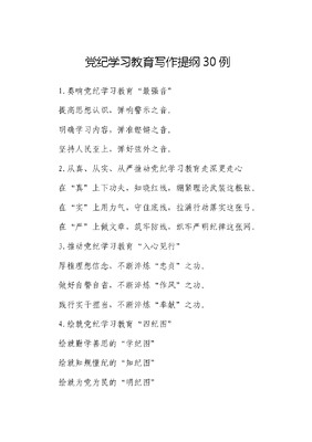 党纪学习教育写作提纲30例1.奏响党纪学习教育最强音提高思想认识,弹响警示之音。明确学习内容,弹准铿锵之音。坚持人民至上,弹好弦外之音。2.从真、从实、从严推动党纪学习教育走深更走心在真上下功夫,知晓红线,绷紧理论武装这根弦。在实上用力气,守住底线,拉满行动落实这张弓。在严上做文章,筑牢防线,织牢严明纪律这张网。3.推动党纪学习教育入心见行厚植理想信念,不断淬炼忠贞之功。做好自警自省,不断淬炼作风之功。践行实干担当,不断淬炼奉献之功。4.绘就党纪学习教育四纪图绘就勤学善思的学纪图绘就知规懂纪的知纪图绘就为党为民的明纪图绘就拒腐防变的守纪图5.四措促党纪学习教育见心见行筑牢政治信仰把握立场方向争当遵规表率增强干事本领6.以党纪学习教育擦亮四底色擦亮黑发不知勤学早的学习亮色擦亮咬定青山不放松的政治底色擦亮数茎白发为民愁的民生本色擦亮宝剑锋从磨砺出的干事胆色7.找准党纪学习教育的着力点原文学、逐条学明底线、有敬畏深运用、求实效8.请把党纪学习教育置顶把学纪明责置顶于心把守纪遵规置顶于行把知纪晓法置顶于觉9.让党纪学习教育入心知止自觉以学为先,入脑更入心。以严为要,知行更知止。以用为本,自勉更自觉。10.党纪学习教育要常修常思常怀常修党纪之魂常思违纪之害常怀律己之心11.推动党纪学习教育落实见效、入脑入心筑牢思想防线培育看齐意识恪守为政之道12.党纪学习教育下足深耕功夫以理论学习领悟新思想、新提法。以宣传贯彻推动抓落实、励前行。以躬耕实践确保敢斗争、强作风。13.读懂党纪学习教育的关键词学纪,提高党性修养。知纪,做党纪追随者。明纪,永葆政治本色。14.党纪学习教育要求准求新求实学习内容要求准,解决好学什么的问题学习形式要求新,解决好怎么学的问题学习效果要求实,解决好做什么的问题15.增强党纪学习教育的三性提高党纪学习教育的针对性。增添党纪学习教育的趣味性。确保党纪学习教育的实效性。16.党纪学习教育要求上知止守正博学求上,胸怀旧书不厌百回读,熟读深思子自知的勤学恒心慎思知止,胸怀历览前贤国与家,成由勤俭破由奢的敬畏戒心笃行守正,胸怀如晦作相犹民天,忠诚蹇蹇终始全的忠诚初心17.用党史学习教育激扬三条底线坚守激浊扬清奋此身的政治底线坚守不同桃李混芳尘的纪律底线坚守只留清气在人间的廉洁底线18.党纪学习教育要无惧雨打风吹以坚定信念应对诱惑的暴风雨以敏锐眼光应对腐蚀的毛毛雨以冷静头脑应对吹捧的流星雨19.党纪学习教育要坚守底线坚守底线,让违纪之念无处遁形坚守底线,让不良之风无处滋生坚守底线,让浮夸之风无处藏身20.开展党纪学习教育必须筑坝、搭棚、除虫聚焦关键少数的作风漏洞,筑高用权拦水坝聚焦关键群体的成长环境,搭建廉洁保温棚聚焦关键岗位的廉政风险,除灭腐败病害虫21.党纪学习教育必须把准方法策略以全方位加固,坚决守牢党纪警戒线以全周期护苗,科学施好党纪有机肥以全流程防控,精准喷洒党纪靶向药22.满格书写党纪学习教育更字文章以学习满格铆足求知劲头以作风满格筑牢律己意识以成效满格践行初心使命23.聚焦党纪学习教育更加要求推动学纪知纪更加走深。推动自警自省更加走心。推动为民服务更加走实。24.全程运算写好党纪学习教育小文章学前筹备做加法,为党员筑牢防线。学中教学做乘法,为党员敲响警钟。学后实践做除法,为党员护航前行。25.三小实招提升党纪学习教育实效点面聚合将典型案例作为小切口虚实结合将警示教育作为小课堂动静融合将日常监督作为小抓手26.党纪学习教育要领悟践行守护领悟党纪,转为自觉行动践行党规,树立良好形象,守护党心,提升政治素养27.党纪学习教育要坚守初心使命明纪律之严,守心之所畏。行规矩之正,树行之所向。铸忠诚之魂,担责之所系。28.硬字功夫推动党纪学习教育一心向党练出硬头脑一尘不染练出硬脚板一切为民练出硬肩膀29.提升党纪学习教育效果树立与党同向、跟党奋进的远大目标涵养敢于斗争、善于斗争的优良作风永葆情暖百姓、迎难而上的拼搏劲头30.绘就党纪学习教育最美图鉴绘就请党放心,强国有我的担当图鉴。绘就干净做事,清白为人的廉政图鉴。绘就敢想敢为,善作善成的奋进图鉴。