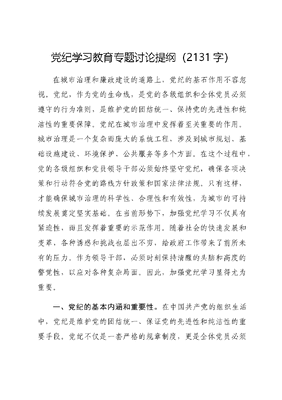 党纪学习教育专题讨论提纲(2131字)在城市治理和廉政建设的道路上,党纪的基石作用不容忽视。党纪,作为党的生命线,是党的各级组织和全体党员必须遵守的行为准则,是维护党的团结统一、保持党的先进性和纯洁性的重要保障。党纪在城市治理中发挥着至关重要的作用。城市治理是一个复杂而庞大的系统工程,涉及到城市规划、基础设施建设、环境保护、公共服务等多个方面。在这个过程中,党的各级组织和党员领导干部必须始终坚守党纪,确保各项决策和行动符合党的路线方针政策和国家法律法规。只有这样,才能确保城市治理的科学性、合理性和有效性,为城市的可持续发展奠定坚实基础。在当前形势下,加强党纪学习不仅具有紧迫性,而且发挥着重要的示范作用。随着社会的快速发展和变革,各种诱惑和挑战也层出不穷,给政府工作带来了前所未有的压力。作为领导干部,必须时刻保持清醒的头脑和高度的警觉性,以应对各种复杂局面。因此,加强党纪学习显得尤为重要。一、党纪的基本内涵和重要性。在中国共产党的组织生活中,党纪是维护党的团结统一、保证党的先进性和纯洁性的重要手段。党纪不仅是一套严格的规章制度,更是全体党员必须遵循的行为准则。在城市管理和服务中遵守党纪具有重大的意义。首先,党纪是党的生命线,是保持党的先进性和纯洁性的重要保障。在城市管理和服务中,党员干部必须严格遵守党纪,才能确保党的路线、方针、政策得到正确执行,从而推动城市的持续健康发展。其次,遵守党纪有助于提升城市管理和服务的水平。党员干部作为城市管理和服务的骨干力量,他们的行为举止直接关系到城市形象和市民的满意度。只有遵守党纪,才能确保他们在工作中做到公正、廉洁、高效,为市民提供更加优质的服务。此外,遵守党纪还有助于增强党员干部的责任意识和担当精神。在城市管理和服务中,党员干部需要面对各种复杂的问题和挑战。只有遵守党纪,才能使他们始终保持清醒的头脑,勇于担当、敢于负责,为市民创造更加宜居、宜业、宜游的城市环境。通过历史和现实的案例,展示党纪对于维护党的形象和统一性的重要作用。在新中国成立初期,我们党就制定了严格的党纪,要求全体党员严守党的纪律,做到公私分明、廉洁自律。在城市治理中,广大党员干部严格遵守党纪,以身作则、率先垂范,为城市的繁荣发展做出了巨大贡献。这些历史案例充分证明了党纪在城市治理中的重要作用。在现实生活中,我们也看到了许多党员干部因违反党纪而受到严肃处理的案例。这些案例不仅警示了广大党员干部要时刻保持清醒文可居文库——海量学习资料,手机电脑均可下载www.wenkeju.com的头脑和高度的警觉性,也进一步彰显了党纪的严肃性和权威性。这些案例告诉我们,只有严格遵守党纪,才能确保党的形象和统一性不受损害。二、当前党纪面临的挑战及政府工作中的实际问题。在城市治理的实践中,党纪的应用既是指导原则,也是行动准则。然而,我们也必须清醒地看到,当前城市治理中党纪的应用仍面临一些挑战。一是部分党员干部对党纪的理解不够深入,执行不够严格。在实际工作中,有些党员干部对党纪的重要性认识不足,缺乏应有的敬畏之心,导致在工作中出现违规行为,严重影响了党的形象和城市的治理效果。二是城市治理的复杂性和多样性给党纪的应用带来了挑战。城市治理涉及多个领域和部门,需要党员干部具备全面的知识和能力。然而,在实际工作中,有些党员干部在面对复杂问题时,往往难以准确理解和应用党纪,导致决策失误或行动不当。三是社会环境的变化给党纪的应用带来了新的考验。随着社会的快速发展和变革,各种新情况、新问题层出不穷,给城市治理带来了新的挑战。在这种背景下,党员干部需要时刻保持清醒的头脑和高度的警觉性,不断适应和应对新的变化和挑战。三、加强党纪教育的措施与实践。在加强党纪教育方面,文可居文库——海量学习资料,手机电脑均可下载www.wenkeju.com市政府肩负着重要的责任和使命。为了推动全市党员干部严格遵守党的纪律,提高党性修养,市政府应当制定一系列具体措施和计划,确保党纪教育深入人心,取得实效。首先,市政府应建立健全党纪教育的长效机制。这包括制定长期和短期的党纪教育规划,明确教育目标、内容、方式和时间安排。同时,要建立健全教育考核机制,将党纪教育纳入各级党组织的工作考核,确保各项措施得到有效落实。其次,市政府应加强党纪教育的针对性和实效性。针对不同岗位、不同层级的党员干部,开展个性化的党纪教育,确保教育内容与实际工作紧密结合。同时,要注重教育的实效性,通过案例分析、经验交流等方式,让党员干部真正感受到党纪的严肃性和必要性。此外,市政府还应创新党纪教育的形式和方法。充分利用现代信息技术手段,如网络教育、远程教育等,拓宽教育渠道,提高教育覆盖面。同时,可以组织党员干部参观革命传统教育基地、廉政教育基地等,通过现场教学、情景模拟等方式,增强教育的感染力和说服力