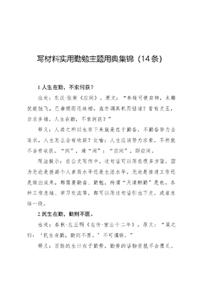 写材料实用勤勉主题用典集锦(14条)1.人生在勤,不索何获?出处:东汉·张衡《应间》。原文:参轮可使自转,木雕犹能独飞,已垂翅而还故栖,盍亦调其机而铦诸?昔有文王,自求多福。人生在勤,不索何获?释义:人类之所以生存下来就是在于勤奋,不勤奋努力去追求,人生怎么会有收获?比喻:人生应该努力求索,不然就不会有收获。间,通闲;应间,即应闲。用法提示:在公文写作中,这句话可以用在很多方面,因为无论是提高个人素质水平还是生活水平,无论是推进工作还是做出成果,都需要勤奋、勤勉,所谓天道酬勤是也。各种工作总结、学习交流等,都可以用这句话引出下文,或者总结一段。2.民生在勤,勤则不匮。出处:春秋·左丘明《左传·宣公十二年》。原文:箴之曰:民生在勤,勤则不匮。不可谓骄。释义:百姓的生计在于勤劳,勤劳的话物资就不会匮乏。形容勤劳方能得到自己想要的。成语勤则不匮即出于此。用法提示:俗话说得好:自己动手,丰衣足食。不过孙中山曾对此做过更为经典的解释:民生就是人民的生活——社会的生存,国民的生计,群众的生命。中国特色社会主义进入新时代,社会主要矛盾已经转化为人民日益增长的美好生活需要和不平衡不充分的发展之间的矛盾,如何有效解决民生问题,取得国家的长治久安,已成为当前的重要任务。在公文写作中,这句话便可用在民生、社会主要矛盾等方面,之后的内容可以是鼓励大家努力奋斗,也可以是解决民生问题的办法。3.业精于勤,荒于嬉;行成于思,毁于随。出处:唐·韩愈《进学解》。原文:国子先生晨入太学,招诸生立馆下,诲之曰:业精于勤,荒于嬉;行成于思,毁于随。释义:学业由于勤奋而专精,由于玩乐而荒废;做事情成功是因为反复思考、深思熟虑,而毁于随手随意、随随便便。强调,学业贵在精勤,事业贵在思虑。国子先生,即韩愈。用法提示:老祖宗的话,直到现在我们都还一直受用着。这个道理告诉我们,没有一个人的成功是在嬉笑打闹中得来的。同时也在提醒我们,如今所得到的,都来之不易,绝对不能因文可居文库——海量学习资料,手机电脑均可下载www.wenkeju.com为一时的贪图享乐,就断送了这一切;不能因为一时的粗心大意,就枉送了这一切。在公文写作中,这句话可以全用,既说学习,又说工作,强调学以致用、知行合一;也可以分着用,说学习的时候用前半句,说工作的时候用后半句。4.百尺竿头立不难,一勤天下无难事。出处:清·钱德苍《解人颐·勤懒歌》。原文:丈夫志气掀天地,拟上百尺竿头立。百尺竿头立不难,一勤天下无难事。释义:只要勤奋,天下就没有难做的事情,即使百尺竿头也能昂然挺立。百尺竿头,本是佛教用语,比喻道行修养的极高境界,也作百丈竿头。用法提示:众所周知,一说到勤,最常听到的就是一分耕耘,一分收获富贵必从勤苦得,天才也从勤奋始书山有路勤为径,学海无涯苦作舟……这些都是在讲述勤奋、勤劳。而古往今来所谓的庸人,多是因为一个惰字。在公文写作中,说到勤勉的时候,用它的反义,如懒惰、慵懒等进行对比,也是一个不错的方法。而且,这一联主要说的是勤奋努力的作用和意义,朗朗上口,很像是一句打油诗。比如,百尺竿头立不难,一勤天下无难事。以勤治惰、以勤治庸、以勤治世,不仅是为官之道,亦是为人处世之文可居文库——海量学习资料,手机电脑均可下载www.wenkeju.com道。5.山不厌高,海不厌深。出处:东汉·曹操《短歌行》。原文:月明星稀,乌鹊南飞。绕树三匝,何枝可依?山不厌高,海不厌深。周公吐哺,天下归心。释义:高山永远不会嫌自己太高,深海永远不会嫌自己太深。比喻:品行越高尚越好,学问越深广越好。厌,满足之意。有成语山不厌高。用法提示:文学史上有一个词,叫作建安风骨,指的是汉魏之际雄健深沉、慷慨悲凉的文学风格,所以也叫汉魏风骨。而曹操正是建安风骨的代表人物,他的诗既能反映现实的动乱和人民的苦难,也能抒发建功立业的理想和积极进取的精神。在公文写作中,这联诗就可用于抒发建功立业的理想和积极进取的精神。比如,山不厌高,海不厌深。改革开放永无止境,只有进行时没有完成时;唯有坚持改革开放,中国特色社会主义道路才能越走越宽广。6.醉里挑灯看剑,梦回吹角连营。出处:南宋·辛弃疾《破阵子·为陈同甫赋壮词以寄(之)》。原文:醉里挑灯看剑,梦回吹角连营。八百里分麾下炙,五十弦翻塞外声,沙场秋点兵。文可居文库——海量学习资料,手机电脑均可下载www.wenkeju.com释义:醉里挑亮油灯观看宝剑,梦醒时听到军营的号角声响成一片。塑造了一个壮士的形象,时刻不忘报国之志。用法提示:陈同甫,即陈亮,也是南宋爱国词人,力主北伐,与辛弃疾志同道合,其词风格与辛词相似。在公文写作中,这句话可用在军队建