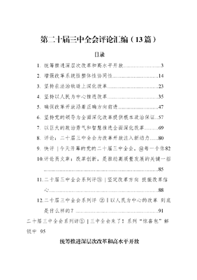 第二十届三中全会评论汇编(13篇)目录1.统筹推进深层次改革和高水平开放.32.增强改革系统性整体性协同性.143.坚持在法治轨道上深化改革..234.坚持以人民为中心推进改革..355.确保改革开放沿着正确方向前进476.坚持党的领导为全面深化改革提供根本政治保证..577.以巨大的政治勇气和智慧推进全面深化改革.698.评论:二十届三中全会为改革开放注入新动力809.快评 | 今天开幕的党的二十届三中全会,@每一个你8210.评论员文章:改革创新,是推动高质量发展的关键一招..8511.二十届三中全会系列评③ | 坚定改革方向 提振改革信心.