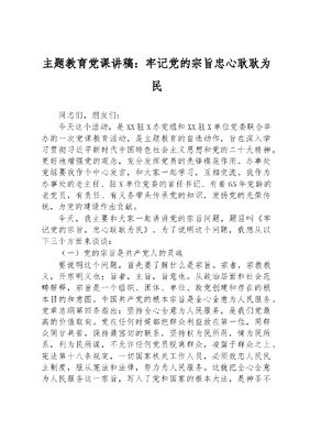 主题教育党课讲稿:牢记党的宗旨忠心耿耿为民同志们,朋友们:今天这个活动,是XX驻X办党组和XX驻X单位党委联合举办的一次党课教育活动,是主题教育的自选动作,旨在深入学习贯彻习近平新时代中国特色社会主义思想和党的二十大精神,更好地增强党的观念,充分发挥党员的先锋模范作用。办事处党组要我作个中心发言,和大家一起学习,互相交流。我作为办事处的老主任、驻X单位党委的首任书记、有着65年党龄的老党员,有责任、有义务带头传承党的知识,发扬党的光荣传统,为党的建设作出贡献。今天,我主要和大家一起讲讲党的宗旨问题,题目叫《牢记党的宗旨,忠心耿耿为民》。为了说明这个问题,我想从以下三个方面来谈谈:(一)党的宗旨是共产党人的灵魂要说明这个问题,首先要了解什么是宗旨。宗者,宗教教义,开宗明义也;旨者,主旨,旨意也。从政治层面和社会范畴解释,宗旨是一个组织、团体、单位、政党创建和存在的根本目的和意图。中国共产党的根本宗旨是全心全意为人民服务。党章总纲第四条指出:坚持全心全意为人民服务,是我们党最高的价值取向。党在任何时候都把群众利益放在第一位,同群众同甘共苦,保持最宻切的联系,坚持权为民所用,情为民所系,利为民所谋,不允许任何党员脱离群众,凌驾于群众之上。宪法第十八条规定,一切国家机关工作人员,必须效忠人民民主制度,服从宪法和法律,努力为人民服务。这就把全心全意为人民服务这一宗旨,写入了党和国家的根本大法,是神圣不可侵犯的。为什么要把全心全意为人民服务作为中国共产党的宗旨呢?这是基于以下原因:一是党的性质所决定。中国共产党是无产阶级的政党,是工人阶级的先锋队。马克思和恩克斯在《共产党宣言》中指出,过去的一切运动都是少数人或者为少数人谋利益的运动,无产阶级的运动是大多数的、为绝大多数谋利益的独立运动。作为工人阶级先锋队的党,除了忠实地代表工人阶级和人民群众的根本利益以外,没有其他任何特殊利益。这是无产阶级政党区别于其他阶级政党的重要标志,也是共产党员党性修养的最高原则和根本内容。共产党为什么伟大?因为他立党为公,执政为民。共产党员为什么光荣?因为他情系百姓,忠心为民。有人说,共产党人是特殊材料制成的,其实这种特殊材料就是党性与人民性的结合,就是家国情怀与人民情怀的结合。在这里,我向大家介绍一位用特殊材料制成的忧国忧民、为国为民的老共产党员,他就是我曾经工作过的株洲331厂的第一任厂长、被周恩来总理誉为中国保尔柯察金的吴运铎。为什么•叫中国的保尔柯察金?因为前苏联有一位在卫国战争中的英雄•叫保尔柯察金,是著名小说《钢铁是怎样炼成的》主人公。他•说的人最宝贵的是生命,它给予人只有一次。人的一生应该这样度过,当回首往事时不因虚度年华而恨悔,也不因碌碌无为而羞耻的经典名言,成为了许多人的座右铭。吴运铎就是一位把一生献给人民革命事业的的钢铁战士。他出生在江西萍乡煤矿一位贫困工人的家里,14岁就到矿里当童工,1937年参加新四军,1938年加入中国共产党。为了救国救民,他临危不惧,视死如归,在近乎原始的条件下,建成了我军第一个军械修理车间,制成了我军第一支自制步枪。为了制造武器,一生多次受伤,体内有几十块弹片,左手四根手指被炸断,右腿成残疾,左眼几乎失明。他为新中国的军工事业开疆拓土,虽九死其犹未悔。新中国成立后,他历任株洲331厂厂长、中南兵噐工业局局长、国家兵器工业部副部长。他写了一本回忆录,叫《把一切献给党》,书中写道:我的一切都是属于党的,党叫我干什么就干什么;我的一切都是属于人民的,人民需要我干什么就干什么。这就是共产党人的天性,这就是共产党人的情怀。正是这种天性和情怀,使我们党由小到大,由弱变强。据中组部统计,我们的党从建党初期的58名党员发展成为今天拥有9600多万名党员,成为了世界第一大党。二是党的路线所决定。党的路线包括政治路线、思想路线、组织路线,它是指导一个党走向何处的至关重要的问题。路线正确与否,决定党和国家的兴衰与存亡。路线的核心,主要着眼于国家的前途与命运,社会的文明与进步,经济的繁荣与昌盛,人民的响往与追求。集中到一点,就是民心所向,民意所归,民脂所在。习近平总书记在党的二十大报告中指出,人民性是马克思主义的本质属性,党的理论是来自人民、为了人民、造福人民的理论。他还语重心长地告诉我们,江山就是人民,人民就是江山。中国共产党领导人民打江山、守江山,守的是人民的心。可见党的路线就是党和人民的生命线。坚持党的宗旨就必须坚持好党的路线。毛主席早在党的八届三中全会上就指出,政治路线确定之后,干部就是决定的因素。这一英明论断,无论过去和现在都是旡比正确的。我们党在100年奋斗中所积累的经验,其中很重要的一条,就是坚持正确的路线,不断排除来自左的或右的方面的干扰;就是在斗争中培养了大批为党和人民事业而不懈奋斗的干部。大家熟悉的