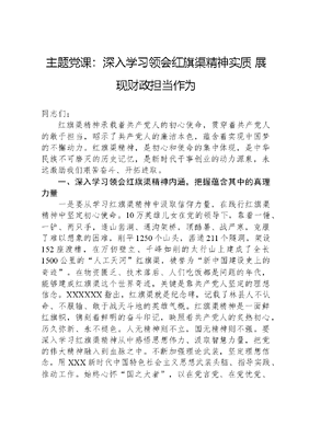 主题党课:深入学习领会红旗渠精神实质 展现财政担当作为同志们:红旗渠精神承载着共产党人的初心使命,贯穿着共产党人的敢于担当,昭示了共产党人的廉洁本色,蕴含着实现中国梦的不懈动力。红旗渠精神,是初心和使命的集中体现,是中华民族不可磨灭的历史记忆,是新时代干事创业的动力源泉,永远激励我们艰苦奋斗、开拓进取。一、深入学习领会红旗渠精神内涵,把握蕴含其中的真理力量一是要从学习红旗渠精神中汲取信仰力量,在践行红旗渠精神中坚定初心使命。10万英雄儿女在党的领导下,靠着一锤、一铲、两只手,逢山凿洞、遇沟架桥,顶酷暑、战严寒,克服了难以想象的困难,削平1250个山头,凿通211个隧洞,架设152座渡槽,在万仞壁立、千峰如削的太行山上建成了全长1500公里的人工天河红旗渠,被誉为新中国建设史上的奇迹。在物资匮乏、技术落后、人们吃饭都是问题的年代,能够建成红旗渠这个世界奇迹,关键是靠共产党人坚定的理想信念。XXXXXX指出,红旗渠就是纪念碑,记载了林县人不认命、不服输、敢于战天斗地的英雄气概。红旗渠精神是一面鲜红旗帜,镌刻着鲜明的奋斗印记,映照着共产党人的炙热初心,历久弥新、永不褪色。人无精神则不立,国无精神则不强。要深入学习红旗渠精神从中感悟思想伟力、汲取智慧力量,把党的伟大精神融入到血脉之中。不断加强理论武装,坚定理想信念,用XXX新时代中国特色社会主义思想武装头脑、指导实践、推动工作。始终心怀国之大者,以在党言党、在党忧党、在党为党,切实把思想和行动统一到党中央决策部署上来,忠诚拥护两个确立、增强四个意识、坚定四个自信、坚决做到两个维护,自信自强、守正创新,踏实工作,在学习红旗渠精神中扛稳新时代赋予我们的新使命。二是要从学习红旗渠精神中汲取奋进力量,在践行红旗渠精神中展现新作为。要认真学习弘扬红旗渠精神,以求真务实的态度、以百折不挠的韧劲,以旺盛的工作热情,提前谋划,提高效率,保质保量抓好每一项工作的落实,兢兢业业、认认真真地做好每一件事,珍惜每一分钟,一步一个脚印地往前走,多做实事,以端正认真的工作态度,务实担当的工作作风发挥表率作用;要坚持并发扬钉钉子精神,立足本职岗位,把吃苦耐劳、敢干敢拼的精神发挥出来,开拓创新,勇于担责。从红旗渠精神中汲取踔厉奋发的力量,以昂扬饱满的精神状态、务实高效的工作作风推进财政工作高质量发展。二、深入学习领会红旗渠精神内涵,以务实高效的工作作风推进财政工作高质量发展深入学习领会红旗渠精神内涵要与学习贯彻XXX新时代中国特色社会主义思想结合起来,与学习贯彻XXXXXX在河南安阳考察时的重要讲话精神结合起来,在新时代新征程上团结奋斗,展现财政更大担当和作为。(一)以政领财讲政治。一是忠诚政治核心,坚定政治方向。增强四个意识,坚定四个自信,更加自觉地维护XXXXXX党中央的核心、全党的核心地位,更加自觉地维护以XXX同志为核心的党中央权威和集中统一领导,全面贯彻XXX新时代中国特色社会主义思想,坚持好、运用好贯穿其中的立场观点方法,不断提高政治判断力、政治领悟力、政治执行力,确保财政工作保持正确的政治方向。二是加强政治建设,永葆政治本色。把党的全面领导贯穿财政工作的全过程各方面,深入推进全面从严治党,不断提高财政部门党建质量。把净化政治生态作为根本,持之以恒正风肃纪反腐,严格执行中央八文可居文库——海量学习资料,手机电脑均可下载www.wenkeju.com项规定及其实施细则精神,廉洁从政、规范用权,永葆共产党人拒腐蚀、永不沾的政治本色。三是扛起政治责任,履行政治使命。牢记国之大者,坚持把维护国家国防安全、粮食安全、生态安全、能源安全、产业安全这个政治使命,扩大内需这个战略基点和供给侧结构性改革这条主线有机结合起来,将贯彻落实党中央重大决策部署体现到预算安排、政策制定中,切实做到财政见行动有实效。(二)以财辅政勇担当。一是全力以赴促发展。坚持以推动高质量发展为主题,完整、准确、全面贯彻新发展理念,服务和融入构建新发展格局。聚焦支持稳住经济一揽子政策措施,锚定省委两个确保、实施十大战略和市委壮大新动能、奋进百强市等战略部署,强化振兴发展重大任务财力保障。加大财政投入,深化财政科技经费分配使用机制改革,充分用好创新资源和产业基础,支持创新生态、创新平台、创新人才三位一体推进,加快产业数字化、数字产业化,推动经济实现质的有效提升和量的合理增长。二是坚定不移保民生。努力做大蛋糕,切实分好蛋糕,完善收入分配制度,坚持尽力而为、量力而行,采取更多惠民生、暖民心措施,促进民生持续改善,推进实现共同富裕。坚持教育优先发展,支持建设高质量教育体系,促进教育公平。强化就业优先导向,聚焦重点群体,加大帮扶力度,支持健全就业公共服务体系。健全社会保障体系