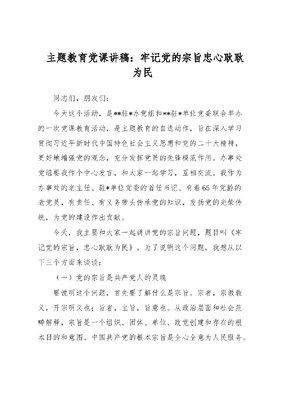 主题教育党课讲稿:牢记党的宗旨忠心耿耿为民同志们,朋友们:今天这个活动,是**驻*办党组和**驻*单位党委联合举办的一次党课教育活动,是主题教育的自选动作,旨在深入学习贯彻习近平新时代中国特色社会主义思想和党的二十大精神,更好地增强党的观念,充分发挥党员的先锋模范作用。办事处党组要我作个中心发言,和大家一起学习,互相交流。我作为办事处的老主任、驻*单位党委的首任书记、有着65年党龄的老党员,有责任、有义务带头传承党的知识,发扬党的光荣传统,为党的建设作出贡献。今天,我主要和大家一起讲讲党的宗旨问题,题目叫《牢记党的宗旨,忠心耿耿为民》。为了说明这个问题,我想从以下三个方面来谈谈:(一)党的宗旨是共产党人的灵魂要说明这个问题,首先要了解什么是宗旨。宗者,宗教教义,开宗明义也;旨者,主旨,旨意也。从政治层面和社会范畴解释,宗旨是一个组织、团体、单位、政党创建和存在的根本目的和意图。中国共产党的根本宗旨是全心全意为人民服务。党章总纲第四条指出:坚持全心全意为人民服务,是我们党最高的价值取向。党在任何时候都把群众利益放在第一位,同群众同甘共苦,保持最宻切的联系,坚持权为民所用,情为民所系,利为民所谋,不允许任何党员脱离群众,凌驾于群众之上。宪法第十八条规定,一切国家机关工作人员,必须效忠人民民主制度,服从宪法和法律,努力为人民服务。这就把全心全意为人民服务这一宗旨,写入了党和国家的根本大法,是神圣不可侵犯的。为什么要把全心全意为人民服务作为中国共产党的宗旨呢?这是基于以下原因:一是党的性质所决定。中国共产党是无产阶级的政党,是工人阶级的先锋队。马克思和恩克斯在《共产党宣言》中指出,过去的一切运动都是少数人或者为少数人谋利益的运动,无产阶级的运动是大多数的、为绝大多数谋利益的独立运动。作为工人阶级先锋队的党,除了忠实地代表工人阶级和人民群众的根本利益以外,没有其他任何特殊利益。这是无产阶级政党区别于其他阶级政党的重要标志,也是共产党员党性修养的最高原则和根本内容。共产党为什么伟大?因为他立党为公,执政为民。共产党员为什么光荣?因为他情系百姓,忠心为民。有人说,共产党人是特殊材料制成的,其实这种特殊材料就是党性与人民性的结合,就是家国情怀与人民情怀的结合。在这里,我向大家介绍一位用特殊材料制成的忧国忧民、为国为民的老共产党员,他就是我曾经工作过的株洲331厂的第一任厂长、被周恩来总理誉为中国保尔柯察金的吴运铎。为什么•叫中国的保尔柯察金?因为前苏联有一位在卫国战争中的英雄•叫保尔柯察金,是著名小说《钢铁是怎样炼成的》主人公。他•说的人最宝贵的是生命,它给予人只有一次。人的一生应该这样度过,当回首往事时不因虚度年华而恨悔,也不因碌碌无为而羞耻的经典名言,成为了许多人的座右铭。吴运铎就是一位把一生献给人民革命事业的的钢铁战士。他出生在江西萍乡煤矿一位贫困工人的家里,14岁就到矿里当童工,1937年参加新四军,1938年加入中国共产党。为了救国救民,他临危不惧,视死如归,在近乎原始的条件下,建成了我军第一个军械修理车间,制成了我军第一支自制步枪。为了制造武器,一生多次受伤,体内有几十块弹片,左手四根手指被炸断,右腿成残疾,左眼几乎失明。他为新中国的军工事业开疆拓土,虽九死其犹未悔。新中国成立后,他历任株洲331厂厂长、中南兵噐工业局局长、国家兵器工业部副部长。他写了一本回忆录,叫《把一切献给党》,书中写道:我的一切都是属于党的,党叫我干什么就干什么;我的一切都是属于人民的,人民需要我干什么就干什么。这就是共产党人的天性,这就是共产党人的情怀。正是这种天性和情怀,使我们党由小到大,由弱变强。据中组部统计,我们的党从建党初期的58名党员发展成为今天拥有9600多万名党员,成为了世界第一大党。二是党的路线所决定。党的路线包括政治路线、思想路线、组织路线,它是指导一个党走向何处的至关重要的问题。路线正确与否,决定党和国家的兴衰与存亡。路线的核心,主要着眼于国家的前途与命运,社会的文明与进步,经济的繁荣与昌盛,人民的响往与追求。集中到一点,就是民心所向,民意所归,民脂所在。习近平总书记在党的二十大报告中指出,人民性是马克思主义的本质属性,党的理论是来自人民、为了人民、造福人民的理论。他还语重心长地告诉我们,江山就是人民,人民就是江山。中国共产党领导人民打江山、守江山,守的是人民的心。可见党的路线就是党和人民的生命线。坚持党的宗旨就必须坚持好党的路线。毛主席早在党的八届三中全会上就指出,政治路线确定之后,干部就是决定的因素。这一英明论断,无论过去和现在都是旡比正确的。我们党在100年奋斗中所积累的经验,其中很重要的一条,就是坚持正确的路线,不断排除来自左的或右的方面的干扰;就是在斗争中培养了大批为党和人民事业而不懈奋斗的干部。大家熟悉